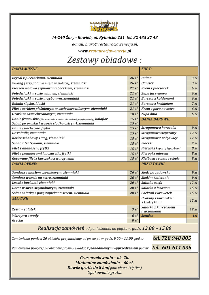 44-240 Żory - Rowień, ul. Rybnicka 251 tel. 32 435 27 43 e-mail: [email protected], www.restauracjawenecja.pl Zestawy obiadowe : DANIA MIĘSNE: ZUPY: Bryzol z pieczarkami, ziemniaki Wiking ( trzy gatunki mięsa w ziołach), ziemniaki Pieczeń wołowa szpikowana boczkiem, ziemniaki Polędwiczki w sosie winnym, ziemniaki Polędwiczki w sosie grzybowym, ziemniaki Rolada śląska, kluski Filet z serkiem pleśniowym w sosie borowikowym, ziemniaki Ozorki w sosie chrzanowym, ziemniaki Danie francuskie ( filet z kurczaka w sosie z pieczarkami, papryką, cebulą), kalafior Schab po prasku ( w sosie słodko-ostrym), ziemniaki Danie szlacheckie, frytki De'volaille, ziemniaki Kotlet schabowy 100 g, ziemniaki Schab z tzatzykami, ziemniaki Filet z ananasem, frytki Filet z pomidorami i mozarellą, frytki Gotowany filet z kurczaka z warzywami 26 zł 26 zł 21 zł 21 zł 21 zł 21 zł 21 zł 18 zł 15 zł 15 zł 15 zł 15 zł 15 zł 15 zł 15 zł 15 zł 15 zł DANIA RYBNE: Bulion Barszcz Krem z pieczarek Zupa jarzynowa Barszcz z kołdunami Barszcz z krokietem Krem z pora na ostro Zupa dnia 3 zł 3 zł 6 zł 6 zł 6 zł 7 zł 6 zł 6 zł DANIA BAROWE: Stroganow z kurczaka Stroganow wieprzowy Stroganow z polędwicy Flaczki Pierogi z kapustą i grzybami Pierogi z mięsem Kiełbasa z rusztu z cebulą 9 zł 12 zł 17 zł 7 zł 8 zł 8 zł 8 zł PRZYSTAWKI Sandacz z masłem czosnkowym, ziemniaki Sandacz w sosie na ostro, ziemniaki Łosoś z kurkami, ziemniaki Dorsz w sosie szpinakowym, ziemniaki Sola z sałatką z porą zapiekana serem, ziemniaki 26 zł 26 zł 20 zł 20 zł 20 zł SAŁATKI: Zestaw sałatek 3 zł Warzywa z wody Grecka 6 zł 8 zł Śledź po żydowsku Śledź w śmietanie Sałatka szefa Sałatka z łososiem Cocktail z krewetek Brokuły z kurczakiem i tzatzykami Sałatka z kurczakiem i grzankami Sztućce 9 zł 9 zł 12 zł 15 zł 15 zł 12 zł 12 zł Realizacja zamówień od poniedziałku do piątku w godz. 12.00 – 15.00 Zamówienia poniżej 20 obiadów przyjmujemy od pn. do pt. w godz. 9.00 – 11.00 pod nr tel. 728 948 805 Zamówienia powyżej 20 obiadów prosimy składać z jednodniowym wyprzedzeniem pod nr tel. 601 611 036 Czas oczekiwania – ok. 2h. Minimalne zamówienie – 60 zł. Dowóz gratis do 8 km( pow. płatne 1zł/1km) Opakowania gratis. 1zł