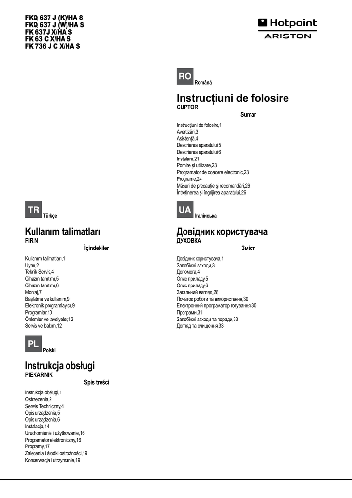 FKQ 637 J (K)/HA S FKQ 637 J (W)/HA S FK 637J X/HA S FK 63 C X/HA S FK 736 J C X/HA S Română Instrucţiuni de folosire CUPTOR Sumar Instrucţiuni de folosire,1 Avertizări,3 Asistenţă,4 Descrierea aparatului,5 Descrierea aparatului,6 Instalare,21 Pornire şi utilizare,23 Programator de coacere electronic,23 Programe,24 Măsuri de precauţie şi recomandări,26 Întreţinerea şi îngrijirea aparatului,26 Iталiиська Türkçe Kullanım talimatları FIRIN İçindekiler Kullanım talimatları,1 Uyarı,2 Teknik Servis,4 Cihazın tanıtımı,5 Cihazın tanıtımı,6 Montaj,7 Başlatma ve kullanım,9 Elektronik programlayıcı,9 Programlar,10 Önlemler ve tavsiyeler,12 Servis ve bakım,12 ДУХОВКА Зміст Довідник користувача,1 Запобіжні заходи,3 Допомога,4 Опис приладу,5 Опис приладу,6 Загальний вигляд,28 Початок роботи та використання,30 Електронний програматор готування,30 Програми,31 Запобіжні заходи та поради,33 Догляд та очищення,33 Polski Instrukcja obsługi PIEKARNIK Довідник користувача Spis treści Instrukcja obsługi,1 Ostrzezenia,2 Serwis Techniczny,4 Opis urządzenia,5 Opis urządzenia,6 Instalacja,14 Uruchomienie i użytkowanie,16 Programator elektroniczny,16 Programy,17 Zalecenia i środki ostrożności,19 Konserwacja i utrzymanie,19 Uyarı Ostrzezenia DİKKAT: Bu cihaz ve erişilebilen bölümleri, kullanım sırasında çok sıcak olur.Dikkat etmek ve ısıtılan parçalara dokunmaktan kaçınmak gerekir.Eğer sürekli olarak gözetim altında değiller ise, 8 yaşından küçük çocukları uzak tutunuz.Bu cihaz, eğer uygun şekilde gözetim altında bulunuyorlar ise veya güvenli şekilde cihazın kullanımı hakkında eğitim almışlar ise ve ilişkin tehlikeler göz önünde bulundurulur ise, 8 yaşından itibaren çocuklar ve fiziksel, duyusal veya mental kapasitelerden yoksun veya tecrübe ve bilgi sahibi olmayan kişiler tarafından kullanılabilir. Çocuklar, cihaz ile oynamamalıdır. Temizlik ve bakım işlemleri, denetimsiz olarak çocuklar tarafından gerçekleştirilmemelidir. UWAGA: To urządzenie oraz jego dostępne części silnie się rozgrzewają podczas użytkowania.Należy uważać, aby nie dotknąć elementów grzejnych. Nie pozwalać, aby dzieci poniżej 8 roku życia zbliżały się do urządzenia, jeśli nie są pod stałym nadzorem dorosłych.Z niniejszego urządzenia mogą korzystać dzieci powyżej 8 roku życia i osoby o ograniczonych zdolnościach fizycznych, zmysłowych bądź umysłowych, jak również osoby nieposiadające doświadczenia lub znajomości urządzenia, jeśli znajdują się one pod nadzorem innych osób lub jeśli zostały pouczone na temat bezpiecznego sposobu użycia urządzenia oraz zdają sobie sprawę ze związanych z nim zagrożeń. Dzieci nie powinny bawić się urządzeniem. Prace związane z czyszczeniem i konserwacją nie mogą być wykonywane przez dzieci, jeśli nie są one nadzorowane. Camın parçalanmasına neden olarak yüzeyi çizebileceğinden, fırının cam kapağını temizlemek için aşındırıcı ürünler ve kesici metal spatulalar kullanmayınız. Cihazı temizlerken asla buharlı yada yüksek basınçlı temizleyiciler kullanmayınız. DİKKAT: Muhtemel elektrik çarpmalarının önüne geçmek için lambayı yenisi ile değiştirmeden önce, cihazın sönük olduğundan emin olunuz. ! Izgara takıldığı zaman, kilidin yukarı doğru dönük ve yuvanın arka tarafında olduğundan emin olunuz. Nie stosować środków ściernych ani ostrych łopatek metalowych do czyszczenia szklanych drzwiczek piekarnika, ponieważ mogłyby porysować powierzchnię i spowodować pęknięcie szyby. Nie stosować nigdy oczyszczaczy parowych lub ciśnieniowych do czyszczenia urządzenia. UWAGA: Przed wymianą żarówki, należy się upewnić, że urządzenie jest wyłączone, aby uniknąć ryzyka porażenia prądem. ! Wsuwając ruszt, należy się upewnić, że ogranicznik jest skierowany ku górze i znajduje się on w tylnej części komory. 2 Avertizări Запобіжні заходи ATENŢIE: Acest aparat şi părţile sale accesibile devin foarte calde în timpul folosirii.Trebuie să fiţi atenţi şi să nu atingeţi elementele de încălzire.Îndepărtaţi copiii sub 8 ani dacă nu sunt supravegheaţi continuu.Acest aparat poate fi utilizat de copiii de peste 8 ani şi de persoane cu capacităţi fizice, senzoriale sau mentale reduse sau fără experienţă şi cunoştinţe dacă se află sub o supraveghere corespunzătoare sau dacă au fost instruiţi cu privire la folosirea aparatului în mod sigur şi dacă îşi dau seama de pericolele corelate. Copiii nu trebuie să se joace cu aparatul. Operaţiunile de curăţare şi de întreţinere nu trebuie să fie efectuate de copii fără supraveghere. УВАГА! Під час роботи цей прилад, а також його доступні частини нагріваються до високих температур. Слід бути особливо обережними, щоб не торкатися нагрівальних елементів. Діти віком до 8 років мають знаходитися на небезпечній відстані від приладу, якщо неможливо забезпечити постійний контроль над ними. Дозволяється користування цим приладом дітьми віком від 8 років, а також особами з обмеженими фізичними, сенсорними або розумовими можливостями або особами без належного досвіду і знань, якщо вони перебувають під постійним контролем або проінстр