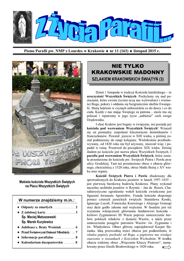 Pismo Parafii pw. NMP z Lourdes w Krakowie nr 11 (163) listopad 2015 r. NIE TYLKO KRAKOWSKIE MADONNY SZLAKIEM KRAKOWSKICH ŚWIĄTYŃ (3) Makieta kościoła Wszystkich Świętych na Placu Wszystkich Świętych . W numerze znajdziemy m.in.: Odpusty za zmarłych ………………..…...... 2 Z żałobnej karty ……………………….…...... 3 Śp. Maciej Matuszewski Śp. Marek Kuryłowicz Jubileusz s. Beaty Woźniak …………..... 6 Przed Światowymi Dniami Młodzieży …... 7 Informacje parafialne …………………..... 8 Kalendarium duszpasterskie ………….. 8 Dzień 1 listopada w tradycji Kościoła katolickiego – to uroczystość Wszystkich Świętych. Pochylamy się nad postaciami, które swoim życiem uczą nas wytrwałości i wierności Bogu, pokory i oddania się bezgranicznie służbie Ewangelii. Służą ludziom w czynach miłosierdzia co do duszy i co do ciała. Każdy z nas mając Świętego za patrona – może mu się polecać i wpatrzony w jego życie „nabierać” cech swego Orędownika. I choć Kraków jest bogaty w świątynie, nie posiada już kościoła pod wezwaniem Wszystkich Świętych! Wznosił się on pomiędzy zespołami klasztornymi dominikanów i franciszkanów. Powstał jeszcze w XIII wieku, a później został podniesiony do rangi kolegiaty. Wielokrotnie przebudowywany, od 1820 roku nie był używany, niszczał więc i popadał w ruinę. Przetrwał do początków XIX wieku. Dzisiaj śladem po kościele jest nazwa placu Wszystkich Świętych. I parafia pod wezwaniem Wszystkich Świętych, która została przeniesiona do kościoła pw. Świętych Piotra i Pawła przy ulicy Grodzkiej. Tam też przeniesiono obraz z ołtarza głównego, chrzcielnicę z 1528 roku, obraz Matki Bożej z XV wieku oraz organy. Kościół Świętych Piotra i Pawła zbudowany dla sprowadzonych do Krakowa jezuitów w latach 1597–1635 – jest pierwszą barokową budowlą Krakowa. Plany wykonał naczelny architekt jezuitów w Rzymie – Jan de Rossis. Charakterystyczne ogrodzenie wokół kościoła zwieńczone jest figurami dwunastu Apostołów. Fasada kościoła eksponuje postaci czterech jezuickich świętych: Stanisława Kostki, Ignacego Loyoli, Franciszka Ksawerego i Alojzego Gonzagi oraz duże godło zakonu nad wejściem. W fasadzie jest też wyrażona wdzięczność głównemu fundatorowi kościoła – królowi Zygmuntowi III Wazie poprzez umieszczenie herbów polskich władców z dynastii Wazów, a także przez umieszczenie posągów patronów Wazów: św. Zygmunta i św. Władysława. Ołtarz główny zaprojektował Kacper Bażanka. Ideą przewodnią treści ołtarza jest podkreślenie, iż władza papieży pochodzi od Boga, a papiestwo ma wiodące znaczenie w stosunkach z Kościołem Wschodnim. W środku ołtarza widzimy obraz „Wręczenie Kluczy Piotrowi”, namalowany przez Józefa Brodowskiego w 1820 roku. 2 Z życia Parafii… pw. Najświętszej Maryi Panny z Lourdes w Krakowie — nr 11 (163) 2015 r. W sklepieniu prezbiterium dzieło Jana Falconiego przedstawia ukrzyżowanie św. Piotra i ścięcie św. Pawła. Śladem po dawnym kościele Wszystkich Świętych jest obraz w południowej ścianie prezbiterium przedstawiający Wszystkich Świętych adorujących Trójcę Świętą, autorstwa Szymona Czechowicza. Przed wejściem do prezbiterium znajduje się wejście do podziemi, które można obecnie zwiedzać. Znajdują się tam m.in. szczątki ks. Piotra Skargi, złożone w cynowej trumience. Ks. Piotr Skarga zasłyną jako wybitny królewski kaznodzieja i autor „Żywotów Świętych”. Jego pomnik znajduje się również przed kościołem – na Placu Marii Magdaleny. W kryptach chowani są obecnie ludzie zasłużeni dla Polski i Kościoła. W kościele znajdują się liczne kaplice: kaplica św. Anny, kaplica św. Ignacego Loyoli, kaplica Matki Boskiej Loretańskiej, kaplica Męki Pańskiej, a pod chórem kaplice Wieczerzy Pańskiej, Michała Archanioła i Aniołów, Trójcy Świętej oraz ołtarz św. Stanisława Kostki (wybudowany po sprowadzeniu relikwii z Rzymu w 1639 roku). Kościół bogaty w dzieła malarstwa sakralnego, ale też symbole narodowe i królewskie. Warto zwiedzić ten największy kościół w starym Krakowie, obecnie pod opieką księży diecezjalnych, pokłonić się naszym Patronom i podziękować Bogu za zgromadzone w nim historyczne bogactwo. W oktawie uroczystości Wszystkich Świętych można zyskiwać odpusty za zmarłych: wierni, którzy w dniach 1 i 2 listopada nawiedzą kościół lub kaplicę i odmówią Ojcze nasz i Wierzę, mogą zyskać odpust zupełny, który może być ofiarowany tylko za zmarłych; wierni, którzy w dniach od 1 do 8 listopada pobożnie nawiedzą cmentarz i pomodlą się tam za zmarłych, mogą zyskać odpust zupełny, który może być ofiarowany tylko za zmarłych; zawsze należy wypełnić pozostałe warunki zyskania odpustu zupełnego, jakimi są: Komunia Święta, modlitwa według intencji Ojca Świętego, zerwanie z przywiązaniem do jakiegokolwiek grzechu i spowiedź sakramentalna (jeżeli jest niezbędna); odpust ten można zyskać tylko jeden raz w ciągu dnia. Na podstawie Leksykonu kościołów Krakowa M. Rożka i B. Gondowskiej przygotowała Monika Łakomiec Na koniec życie oferuje tylko jedną tragedię: to, że nie było się świętym. Charles Péguy ODPUSTY ZA ZMARŁYCH W LISTOPADZIE MYŚL MIESIĄCA MODLITWA ZA ZMARŁYCH W NASZYM KOŚCIELE Za zmarłych, wspominanych w wypominkach jednorazowych, modlimy się w listopadzie, codziennie o godz. 18.00. Za zmarłych, wspominanych w wypominkach całorocznych, modlimy się przez cały rok, w niedziele o godz. 7.30. WARTO WIEDZIEĆ, ŻE… Sanktuarium Bożego Miłosierdzia w Krakowie prowadzi akcję duszpasterską «Koronka za konających». W 2014 roku uczestniczyło w niej ponad 1.300 osób. Zgłosiły one chęć pomocy konającym w wybranym dniu i godzinie przez odmówienie Koronki do Bożego Miłosierdzia w intencji osoby, której i
