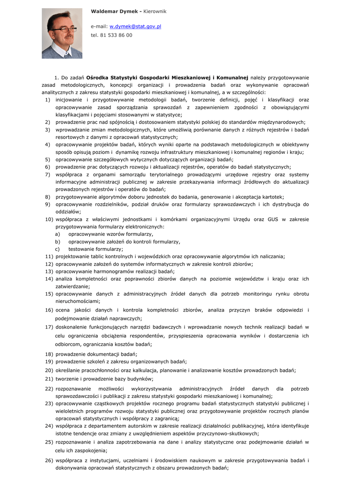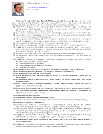 Waldemar Dymek - Kierownik e-mail: [email protected] tel. 81 533 86 00 1. Do zadań Ośrodka Statystyki Gospodarki Mieszkaniowej i Komunalnej należy przygotowywanie zasad metodologicznych, koncepcji organizacji i prowadzenia badań oraz wykonywanie opracowań analitycznych z zakresu statystyki gospodarki mieszkaniowej i komunalnej, a w szczególności: 1) inicjowanie i przygotowywanie opracowywanie zasad metodologii badań, tworzenie sporządzania sprawozdań z definicji, pojęć zapewnieniem zgodności i klasyfikacji oraz z obowiązującymi klasyfikacjami i pojęciami stosowanymi w statystyce; 2) 3) prowadzenie prac nad spójnością i dostosowaniem statystyki polskiej do standardów międzynarodowych; wprowadzanie zmian metodologicznych, które umożliwią porównanie danych z różnych rejestrów i badań resortowych z danymi z opracowań statystycznych; 4) opracowywanie projektów badań, których wyniki oparte na podstawach metodologicznych w obiektywny sposób opisują poziom i dynamikę rozwoju infrastruktury mieszkaniowej i komunalnej regionów i kraju; 5) opracowywanie szczegółowych wytycznych dotyczących organizacji badań; 6) prowadzenie prac dotyczących rozwoju i aktualizacji rejestrów, operatów do badań statystycznych; 7) współpraca z organami samorządu terytorialnego prowadzącymi urzędowe rejestry oraz systemy informacyjne administracji publicznej w zakresie przekazywania informacji źródłowych do aktualizacji prowadzonych rejestrów i operatów do badań; 8) 9) przygotowywanie algorytmów doboru jednostek do badania, generowanie i akceptacja kartotek; opracowywanie rozdzielników, podział druków oraz formularzy sprawozdawczych i ich dystrybucja do oddziałów; 10) współpraca z właściwymi jednostkami i komórkami organizacyjnymi Urzędu oraz GUS w zakresie przygotowywania formularzy elektronicznych: a) opracowywanie wzorów formularzy, b) opracowywanie założeń do kontroli formularzy, c) testowanie formularzy; 11) projektowanie tablic kontrolnych i wojewódzkich oraz opracowywanie algorytmów ich naliczania; 12) opracowywanie założeń do systemów informatycznych w zakresie kontroli zbiorów; 13) opracowywanie harmonogramów realizacji badań; 14) analiza kompletności oraz poprawności zbiorów danych na poziomie województw i kraju oraz ich zatwierdzanie; 15) opracowywanie danych z administracyjnych źródeł danych dla potrzeb monitoringu rynku obrotu nieruchomościami; 16) ocena jakości danych i kontrola kompletności zbiorów, analiza przyczyn braków odpowiedzi i podejmowanie działań naprawczych; 17) doskonalenie funkcjonujących narzędzi badawczych i wprowadzanie nowych technik realizacji badań w celu ograniczenia obciążenia respondentów, przyspieszenia opracowania wyników i dostarczenia ich odbiorcom, ograniczania kosztów badań; 18) prowadzenie dokumentacji badań; 19) prowadzenie szkoleń z zakresu organizowanych badań; 20) określanie pracochłonności oraz kalkulacja, planowanie i analizowanie kosztów prowadzonych badań; 21) tworzenie i prowadzenie bazy budynków; 22) rozpoznawanie możliwości wykorzystywania administracyjnych źródeł danych dla potrzeb sprawozdawczości i publikacji z zakresu statystyki gospodarki mieszkaniowej i komunalnej; 23) opracowywanie cząstkowych projektów rocznego programu badań statystycznych statystyki publicznej i wieloletnich programów rozwoju statystyki publicznej oraz przygotowywanie projektów rocznych planów opracowań statystycznych i współpracy z zagranicą; 24) współpraca z departamentem autorskim w zakresie realizacji działalności publikacyjnej, która identyfikuje istotne tendencje oraz zmiany z uwzględnieniem aspektów przyczynowo-skutkowych; 25) rozpoznawanie i analiza zapotrzebowania na dane i analizy statystyczne oraz podejmowanie działań w celu ich zaspokojenia; 26) współpraca z instytucjami, uczelniami i środowiskiem naukowym w zakresie przygotowywania badań i dokonywania opracowań statystycznych z obszaru prowadzonych badań; 27) współpraca z organami administracji publicznej w ramach integracji procesu pozyskiwania danych ze źródeł administracyjnych, jak również rozpoznania możliwości wykorzystania nowych potencjalnych źródeł informacji; 28) współpraca z Wydziałem Organizacji i Rejestrów przy opracowywaniu wewnętrznych harmonogramów realizacji badań; 29) współpraca z Wydziałem Realizacji Badań oraz Oddziałami w ramach realizacji badań z zakresu specjalizacji; 30) współpraca z Wydziałem Informatyki w zakresie przetwarzania systemów oraz tworzenia kartotek w generatorze; 31) opracowywanie wniosków do projektów programu badań statystycznych oraz metodologii i organizacji badań; 32) uczestnictwo w przeglądach jakości badań. 2. Ośrodek w ramach specjalizacji Urzędu sporządza, opracowuje i przygotowuje dane dla Lubelskiego Ośrodka Badań Regionalnych oraz innych urzędów statystycznych i GUS. 3. Ośrodek realizuje swoje zadania współpracując z departamentem autorskim. 4. Ośrodek współpracuje z Urzędem Statystycznym w Katowicach w zakresie informacji o ochronie środowiska. 5. Ośrodek opracowuje na potrzeby badań ochrony środowiska szacunki wytworzonych odpadów komunalnych. 6. W ramach działalności wydawniczej zadaniem Ośrodka jest terminowe, zgodnie z planem wydawniczym opracowywanie publikacji, informacji statystycznych i analiz z zakresu gospodarki mieszkaniowej i komunalnej.
