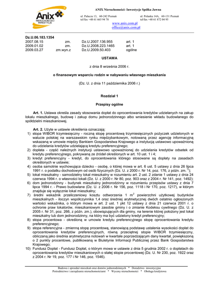 ANIX Nieruchomości- Inwestycje Spółka Jawna ul. Palacza 13, 60-242 Poznań tel/fax +48 61 665 94 70 ul. Polanka 14A, 60-131 Poznań tel/fax +48 61 872 04 95 www.anix.com.pl [email protected] Dz.U.06.183.1354 2007.08.15 zm. 2009.01.02 zm. 2009.03.27 zm.wyn.z Dz.U.2007.136.955 Dz.U.2008.223.1465 Dz.U.2009.50.403 art. 1 art. 1 ogólne USTAWA z dnia 8 września 2006 r. o finansowym wsparciu rodzin w nabywaniu własnego mieszkania (Dz. U. z dnia 11 października 2006 r.) Rozdział 1 Przepisy ogólne Art. 1. Ustawa określa zasady stosowania dopłat do oprocentowania kredytów udzielanych na zakup lokalu mieszkalnego, budowę i zakup domu jednorodzinnego albo wniesienie wkładu budowlanego do spółdzielni mieszkaniowej. Art. 2. Użyte w ustawie określenia oznaczają: 1) stopa WIBOR trzymiesięczny - roczną stopę procentową trzymiesięcznych pożyczek udzielonych w walucie polskiej na warszawskim rynku międzybankowym, notowaną przez agencję informacyjną wskazaną w umowie między Bankiem Gospodarstwa Krajowego a instytucją ustawowo upoważnioną do udzielania kredytów udzielającą kredytu preferencyjnego; 2) dopłata - część należnych instytucji ustawowo upoważnionej do udzielania kredytów odsetek od kredytu preferencyjnego, pokrywaną ze źródeł określonych w art. 10 ust. 1 i 4; 3) kredyt preferencyjny - kredyt, do oprocentowania którego stosowane są dopłaty na zasadach określonych w ustawie; 4) osoba samotnie wychowująca dziecko - osobę, o której mowa w art. 6 ust. 5 ustawy z dnia 26 lipca 1) 1991 r. o podatku dochodowym od osób fizycznych (Dz. U. z 2000 r. Nr 14, poz. 176, z późn. zm. ); 5) lokal mieszkalny - samodzielny lokal mieszkalny w rozumieniu art. 2 ust. 2 zdanie 1 ustawy z dnia 24 czerwca 1994 r. o własności lokali (Dz. U. z 2000 r. Nr 80, poz. 903 oraz z 2004 r. Nr 141, poz. 1492); 6) dom jednorodzinny - budynek mieszkalny jednorodzinny w rozumieniu przepisów ustawy z dnia 7 lipca 1994 r. - Prawo budowlane (Dz. U. z 2006 r. Nr 156, poz. 1118 i Nr 170, poz. 1217), w którym znajduje się wyłącznie lokal mieszkalny; 2 7) średni wskaźnik przeliczeniowy kosztu odtworzenia 1 m powierzchni użytkowej budynków mieszkalnych - iloczyn współczynnika 1,4 oraz średniej arytmetycznej dwóch ostatnio ogłoszonych wartości wskaźnika, o którym mowa w art. 2 ust. 1 pkt 12 ustawy z dnia 21 czerwca 2001 r. o ochronie praw lokatorów, mieszkaniowym zasobie gminy i o zmianie Kodeksu cywilnego (Dz. U. z 2005 r. Nr 31, poz. 266, z późn. zm.), obowiązujących dla gminy, na terenie której położony jest lokal mieszkalny lub dom jednorodzinny, na który ma być udzielony kredyt preferencyjny; 8) stopa procentowa - określoną w umowie kredytu preferencyjnego stopę oprocentowania kredytu preferencyjnego; 9) stopa referencyjna - zmienną stopę procentową, stanowiącą podstawę ustalenia wysokości dopłat do oprocentowania kredytów preferencyjnych, równą przeciętnej stopie WIBOR trzymiesięczny, obliczaną jako średnia arytmetyczna notowań w kwartale poprzedzającym dany kwartał, powiększoną o 2 punkty procentowe, publikowaną w Biuletynie Informacji Publicznej przez Bank Gospodarstwa Krajowego; 10) Fundusz Dopłat - Fundusz Dopłat, o którym mowa w ustawie z dnia 5 grudnia 2002 r. o dopłatach do oprocentowania kredytów mieszkaniowych o stałej stopie procentowej (Dz. U. Nr 230, poz. 1922 oraz z 2004 r. Nr 19, poz. 177 i Nr 146, poz. 1546). Budowa i sprzedaż mieszkań oraz domów jednorodzinnych * Doradztwo inwestycyjne Pośrednictwo i zarządzanie nieruchomościami * Wyceny nieruchomości * Obsługa kredytowa ANIX Nieruchomości- Inwestycje Spółka Jawna ul. Palacza 13, 60-242 Poznań tel/fax +48 61 665 94 70 ul. Polanka 14A, 60-131 Poznań tel/fax +48 61 872 04 95 www.anix.com.pl [email protected] Rozdział 2 Zasady stosowania dopłat Art. 3. 1. Dopłaty mogą być stosowane, jeżeli kredyt preferencyjny został udzielony na podstawie umowy zawartej z instytucją ustawowo upoważnioną do udzielania kredytów przez: 1) oboje małżonków; 2) osobę samotnie wychowującą przynajmniej jedno: a) małoletnie dziecko, b) dziecko, bez względu na jego wiek, na które, zgodnie z ustawą z dnia 28 listopada 2003 r. o świadczeniach rodzinnych (Dz. U. z 2006 r. Nr 139, poz. 992, z późn. zm.), jest pobierany zasiłek pielęgnacyjny, c) dziecko do ukończenia przez nie 25 roku życia, uczące się w szkołach, w zakładach kształcenia nauczycieli oraz kolegiach pracowników służb społecznych, o których mowa w ustawie z dnia 7 2) września 1991 r. o systemie oświaty (Dz. U. z 2004 r. Nr 256, poz. 2572, z późn. zm. ), a także w szkołach wyższych w rozumieniu ustawy z dnia 27 lipca 2005 r. - Prawo o szkolnictwie wyższym 3) (Dz. U. Nr 164, poz. 1365, z późn. zm. ), oraz szkołach wyższych i wyższych seminariach duchownych, prowadzonych przez Kościół Katolicki, inne kościoły i związki wyznaniowe na podstawie przepisów o stosunku państwa do Kościoła Katolickiego w Rzeczypospolitej Polskiej oraz przepisów o stosunku państwa do innych kościołów i związków wyznaniowych - zwanych dalej "docelowymi kredytobiorcami". 1a. Jeżeli w ocenie instytucji ustawowo upoważnionej do udzielania kredytów docelowy kredytobiorca nie posiada zdolności kredytowej w rozumieniu art. 70 ust. 1 ustawy z dnia 29 sierpnia 1997 r. - Prawo bankowe (Dz. U. z 2002 r. Nr 72, poz. 665, z późn. zm.) umowa o kredyt preferencyjny może być zawarta również przez inne osoby niż docelowy kredytobiorca. Mogą nimi być zstępni, wstępni, rodzeństwo, ojczym, macocha lub teściowie docelowego kredytobiorcy. 2. Dopłat nie stosuje się, jeżeli którakolwiek z osób, o których mowa w ust. 1, jest lub była stroną innej umowy kredytu preferencyjnego w charakterze docelowego kredytobiorcy. Art. 4. 1. Dopłaty mogą być stosowane, jeżeli docelowy kredytobiorca w dniu zawarcia umowy kredytu preferencyjnego nie jest: 1) właścicielem lub współwłaś