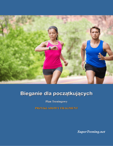 Bieganie dla początkujących Plan Treningowy PRZYKŁADOWY FRAGMENT SuperTrening.net Spis treści Wstęp....................................................................................................................................................2 Rola diety..............................................................................................................................................3 Plan Treningowy...................................................................................................................................5 Zasady treningu:...................................................................................................................................6 Dni z zalecanym odpoczynkiem lub innym sportem.......................................................................7 Znaczenie Treningu siłowego..........................................................................................................7 Dodatek A: Rozgrzewka przed bieganiem...........................................................................................8 Dodatek B: Ćwiczenia rozciągające...................................................................................................11 Dodatek C: Trening siłowy biegaczy.................................................................................................14 Plan pochodzi z serwisu SuperTrening.net 2 Wstęp Wstęp Chcesz rozpocząć swoją przygodę z bieganiem? Plan ten został zaprojektowany z myślą o tym, by bieganie stało się Twoim nawykiem, a nawet przyjemnością. Przewiduje on 3 treningi w tygodniu, wykorzystujące treningi interwałowe składające się z naprzemiennego biegania i chodu. Skonstruowany w ten sposób schemat ma za zadanie powoli zwiększyć Twoją wytrzymałość, byś zaczynając od 30 sekund mógł przebiec 30 minut bez przerwy! Ponadto poradnik składa się z przykładowych ćwiczeń rozgrzewających, rozciągających oraz ćwiczeń siłowych, wzbogacony o zasady zdrowej diety, która jest nieodłączną częścią aktywnego stylu życia. Plan pochodzi z serwisu SuperTrening.net 3 Rola diety Rola diety Zdrowa, zbilansowana dieta jest bardzo ważnym elementem aktywnego trybu życia, gdyż dzięki niej wzmacniamy swój układ odpornościowy, utrzymujemy wysoki poziom energii przez cały dzień i czujemy się po prostu świetnie! Oto kilka ważnych wskazówek zdrowego odżywiania: 1. Jedz regularnie 5 -6 razy dziennie. 2. Śpij nie mniej niż 7- 8 godzin. 3. Pij co najmniej 8 szklanek wody dziennie. 4. Dbaj o odpowiedni skład diety. Twoja codzienna dieta powinna składać się z: • 10 - 35% białek • 45 - 60% węglowodanów Ciąg dalszy Poradnika dostępny jest w pełnej wersji planu treningowego dostępnego w serwisie SuperTrening.net Plan pochodzi z serwisu SuperTrening.net 4 Plan Treningowy Plan Treningowy Każdy rozwija się w treningu biegowym w swoim własnym tempie – niektórzy potrzebują więcej czasu a niektórzy mniej. Poniższy plan nastawiony jest na postępy tygodniowe – dlatego każdy tydzień składa się z 3 dni treningów biegowych o tej samej intensywności. DZIEŃ I 30 sek biegania/ 3min Tydzień chodzenia I 6 razy DZIEŃ II Odpoczynek albo Inny sport* 30-40 min DZIEŃ III 30 sek biegania/ 3min chodzenia 6 razy DZIEŃ IV DZIEŃ V Trening siłowy odpoczynek albo Inny sport 20-40 min DZIEŃ VI DZIEŃ VII 30 sek biegania/ 3min chodzenia odpoczynek 6 razy Tydzień II Tydzień III Tydzień IV Tydzień V Tydzień VI Ciąg dalszy planu treningowego na kolejne dni dostępny jest w pełnej wersji planu treningowego dostępnego w serwisie SuperTrening.net Tydzień VII Tydzień VIII Tydzień IX Tydzień X Zasady treningu: 1. Tempo biegu powinno być równe 60%- 70% Twojego maksymalnego tętna (maxHR). Prędkość odpowiadająca w przybliżeniu 65 procent Twojego tętna maksymalnego(maxHR) jest dość wygodnym tempem, dzięki któremu będziesz budować stopniowo swoją kondycję, Plan pochodzi z serwisu SuperTrening.net 5 Zasady treningu: jak również pomoże Ci dodatkowo spalić nadmiar tkanki tłuszczowej. Ciąg dalszy planu treningowego na kolejne dni dostępny jest w pełnej wersji planu treningowego dostępnego w serwisie SuperTrening.net Plan pochodzi z serwisu SuperTrening.net 6 Dodatek A: Rozgrzewka przed bieganiem Dodatek A: Rozgrzewka przed bieganiem Ćwiczenia rozgrzewające przygotowują nasz organizm do zwiększonego wysiłku oraz rozgrzewają nasze mięśnie i stawy. To podczas rozgrzewki krew pompowana jest do mięśni i stawów, zaopatrując je w substancje odżywcze i tlen. Właśnie dlatego główną jej zaletą jest zmniejszenie ryzyka urazów podczas treningów, jak również zwiększenie wydajności wykonywanych ćwiczeń. Wykrok do przodu po 5 razy na każdą nogę Wykonaj krok w przód prawą nogą, uginając kolano do kąta 90 stopni, kolano lewej nogi powinno niemal dotknąć podłoża. Następnie powróć do pozycji wyjściowej i powtórz ćwiczenie drugą nogą. Plecy powinny być wyprostowane przez cały czas trwania ćwiczenia. Ćwiczone mięśnie: mięśnie czworogłowe uda, mięśnie pośladków Wykrok w przód ze skrętem tułowia: 5 x każda noga Wykonaj krok w przód prawą nogą, uginając kolano do kąta 90 stopni, kolano lewej nogi powinno niemal dotknąć podłoża. Wykonaj skręt tułowia w prawo. Następnie powróć do pozycji wyjściowej i powtórz ćwiczenie drugą nogą. Plecy powinny być wyprostowane przez czas trwania całego ćwiczenia. Ćwiczone mięśnie: mięśnie czworogłowe uda, mięsień pośladkowy wielki, biceps, mięśnie skośne brzucha Ciąg dalszy dostępny jest w pełnej wersji planu treningowego dostępnego w serwisie SuperTrening.net Plan pochodzi z serwisu SuperTrening.net 7 Dodatek B: Ćwiczenia rozciągające Dodatek B: Ćwiczenia rozciągające Celem ćwiczeń rozciągających jest uspokojenie i rozluźnienie ciała po biegu, dzięki czemu mięśnie będą się szybciej regenerować. Ćwiczenia