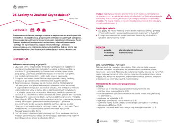 26. Lecimy na Jowisza! Czy to daleko? Janusz Fiett KATEGORIE Proponowane działanie pomaga uczniom w zapoznaniu się z rodzajami ciał niebieskich, ich liczebnością, proporcjami wielkości i wzajemnych odległości. Koncentruje się na Układzie Słonecznym, jako najbliższym otoczeniu Ziemi. Pozwala doskonalić umiejętności rachunkowe, zdolność szacowania i pomaga we wprowadzeniu pojęcia roku świetlnego i jednostki astronomicznej oraz rozmiarów kątowych obiektów. Już nie zmylą nas zaburzenia proporcji na ilustracjach pokazujących obiekty kosmiczne! Uwaga: Napotykając kolejne planety mów o ich budowie, temperaturze na powierzchni – wyjaśniaj jak zależy od odległości od Słońca i posiadania atmosfery. Zobaczcie ile, jak dużych i jak odległych księżyców posiadają. Znajdźcie na mapie miasto, w którym moglibyście umieścić mikroskopijny model sondy Voyager 1. Inspirujące pytania Czy gdyby do naszej instalacji chcieć dodać najbliższa Słońcu gwiazdę – Proxima Centauri – wystarczyłoby poprosić znajomych w Australii? Z czego można wykonać model pierścieni Saturna, by ich średnica i grubość zachowywały skalę? POJĘCIA gwiazda rok świetlny planetoida planeta i planeta karłowata rozmiar kątowy INSTRUKCJA (rekomendowana pracy w grupach) 1. Używając tablic, encyklopedii, Wikipedii, wynotuj dane o liczebności, rozmiarach i odległości ciał niebieskich, wybierz te, które przybliżysz uczniom. Przyjmij taką skalę, by Ziemia miała rozmiary piłeczki do ping-ponga. Zgromadź przedmioty mogące w wybranej skali pełnić role modeli ciał niebieskich – piłki, kulki, owoce, nasiona itp. 2. Przygotuj z uczniami model Słońca mający ponad 4 metry średnicy, umocujcie go na widocznej z daleka ścianie budynku szkoły. 3. Zacznijcie spacer, oddalając się od modelu Słońca. Modele planet i ich księżyców oraz planet karłowatych i planetoid rozłóż wcześniej w odpowiednich miejscach, lub weźcie ze sobą. Jeśli jesteście w mieście, „ciała niebieskie” ukryj w parku, albo w zaprzyjaźnionych instytucjach – w sklepie, na poczcie, w urzędzie. Merkurego (wielkości paznokcia), spotkacie po 180 metrach, Wenus (bliźniaczkę Ziemi), prawie dwa razy dalej. 4. Pozycję Ziemi wyznaczycie dzięki… symulacji zaćmienia Słońca! Przygotuj listwę długości 120 cm. Zamocujcie na jednym jej końcu czterocentymetrową Ziemię, na drugim – jedenastomilimetrowy Księżyc. Opowiedz o zaćmieniach, zwróć uwagę na zbliżone rozmiary kątowe Słońca i Księżyca. Poszukajcie miejsca, z którego, mając oko przy modelu Ziemi, można model Słońca dokładnie zasłonić malutkim Księżycem. Tak wyznaczycie orbitę Ziemi. 5. „Lot” do Jowisza (wielkości piłki plażowej) to 2,5 km wędrówki. Neptuna możecie odwiedzić przy okazji, lub korzystając z doświadczenia uczniów dojeżdżających do szkoły z odległości 14 km. SPIS MATERIAŁÓW I POMOCY Taśma miernicza, mapa lub plan okolicy. Piłki, piłeczki, kulki, owoce, nasiona, modelina lub plastelina do prezentowania rozmiarów planet, księżyców i planetoid. Materiały do wykonania modelu Słońca, np. rurki PCV, papier pakowy i farba lub żółta płachta malarska. Drewniana listwa, taśma klejąca, klej. Książka o astronomii, odpowiednie tablice, plansze, komputer z dostępem do Internetu i rzutnik multimedialny. Odniesienie do podstawy programowej UCZEŃ: - orientuje się w otaczającej go przestrzeni przyrodniczej (III), - orientuje plan, mapę w terenie (2.3), - określa wzajemne położenie obiektów na planie, mapie topograficznej i w terenie (2.4), - posługuje się podziałką (2.5), - wykonuje pomiary np. taśmą mierniczą (2.6), - wymienia nazwy planet Układu Słonecznego i porządkuje je według odległości od Słońca (11.2), - wyjaśnia założenia teorii heliocentrycznej Mikołaja Kopernika (11.3). Projekt jest współfinansowany ze środków Unii Europejskiej w ramach Europejskiego Funduszu Społecznego.