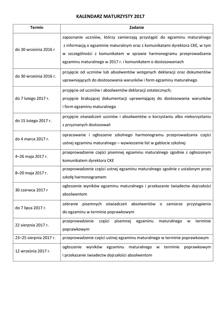 KALENDARZ MATURZYSTY 2017