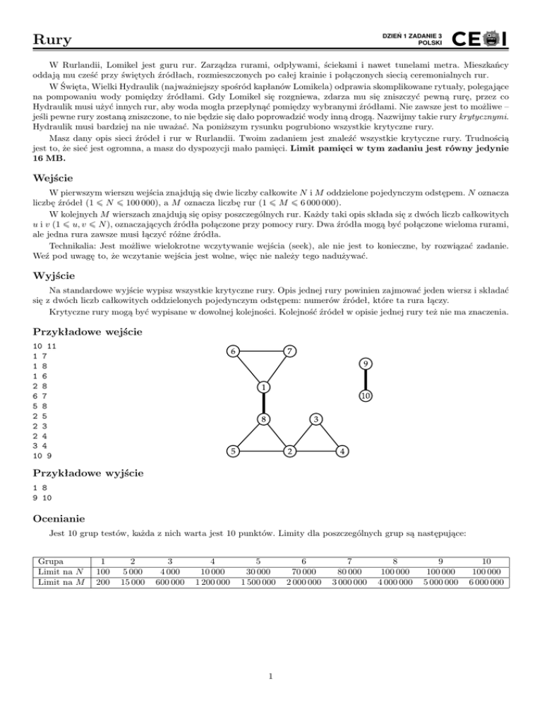DZIEŃ 1 ZADANIE 3 POLSKI Rury W Rurlandii, Lomikel jest guru rur. Zarządza rurami, odpływami, ściekami i nawet tunelami metra. Mieszkańcy oddają mu cześć przy świętych źródłach, rozmieszczonych po całej krainie i połączonych siecią ceremonialnych rur. W Święta, Wielki Hydraulik (najważniejszy spośród kapłanów Lomikela) odprawia skomplikowane rytuały, polegające na pompowaniu wody pomiędzy źródłami. Gdy Lomikel się rozgniewa, zdarza mu się zniszczyć pewną rurę, przez co Hydraulik musi użyć innych rur, aby woda mogła przepłynąć pomiędzy wybranymi źródłami. Nie zawsze jest to możliwe – jeśli pewne rury zostaną zniszczone, to nie będzie się dało poprowadzić wody inną drogą. Nazwijmy takie rury krytycznymi. Hydraulik musi bardziej na nie uważać. Na poniższym rysunku pogrubiono wszystkie krytyczne rury. Masz dany opis sieci źródeł i rur w Rurlandii. Twoim zadaniem jest znaleźć wszystkie krytyczne rury. Trudnością jest to, że sieć jest ogromna, a masz do dyspozycji mało pamięci. Limit pamięci w tym zadaniu jest równy jedynie 16 MB. Wejście W pierwszym wierszu wejścia znajdują się dwie liczby całkowite N i M oddzielone pojedynczym odstępem. N oznacza liczbę źródeł (1 ¬ N ¬ 100 000), a M oznacza liczbę rur (1 ¬ M ¬ 6 000 000). W kolejnych M wierszach znajdują się opisy poszczególnych rur. Każdy taki opis składa się z dwóch liczb całkowitych u i v (1 ¬ u, v ¬ N ), oznaczających źródła połączone przy pomocy rury. Dwa źródła mogą być połączone wieloma rurami, ale jedna rura zawsze musi łączyć różne źródła. Technikalia: Jest możliwe wielokrotne wczytywanie wejścia (seek), ale nie jest to konieczne, by rozwiązać zadanie. Weź pod uwagę to, że wczytanie wejścia jest wolne, więc nie należy tego nadużywać. Wyjście Na standardowe wyjście wypisz wszystkie krytyczne rury. Opis jednej rury powinien zajmować jeden wiersz i składać się z dwóch liczb całkowitych oddzielonych pojedynczym odstępem: numerów źródeł, które ta rura łączy. Krytyczne rury mogą być wypisane w dowolnej kolejności. Kolejność źródeł w opisie jednej rury też nie ma znaczenia. Przykładowe wejście 10 11 1 7 1 8 1 6 2 8 6 7 5 8 2 5 2 3 2 4 3 4 10 9 Przykładowe wyjście 1 8 9 10 Ocenianie Jest 10 grup testów, każda z nich warta jest 10 punktów. Limity dla poszczególnych grup są następujące: Grupa Limit na N Limit na M 1 100 200 2 5 000 15 000 3 4 000 600 000 4 10 000 1 200 000 5 30 000 1 500 000 1 6 70 000 2 000 000 7 80 000 3 000 000 8 100 000 4 000 000 9 100 000 5 000 000 10 100 000 6 000 000