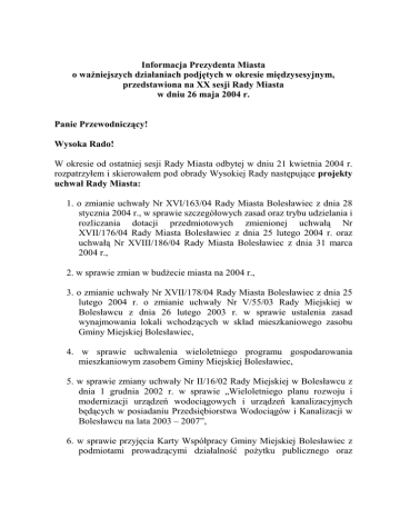 Informacja Prezydenta Miasta RZD*QLHMV]\FKG]LDáDQLDFKSRGM W\FKZRNUHVLHPL G]\VHV\MQ\P przedstawiona na XX sesji Rady Miasta w dniu 26 maja 2004 r. 3DQLH3U]HZRGQLF]F\ Wysoka Rado! W okresie od ostatniej sesji Rady Miasta odbytej w dniu 21 kwietnia 2004 r. UR]SDWU]\áHPLVNLHURZDáHPSRGREUDG\:\VRNLHM5DG\QDVW SXMFHprojekty XFKZDá5DG\0LDVWD 1. R]PLDQLHXFKZDá\1U;9,5DG\0LDVWD%ROHVáDZLHF]GQLD VW\F]QLDUZVSUDZLHV]F]HJyáRZ\FK]DVDGRUD]WU\EXXG]LHODQLDL rozliczaQLD GRWDFML SU]HGPLRWRZ\FK ]PLHQLRQHM XFKZDá 1U ;9,, 5DG\ 0LDVWD %ROHVáDZLHF ] GQLD OXWHJR U RUD] XFKZDá 1U ;9,,, 5DG\ 0LDVWD %ROHVáDZLHF ] GQLD PDUFD 2004 r., ZVSUDZLH]PLDQZEXG*HFLHPLDVWDQDU 3. o zmianie uchwDá\1U;9,,5DG\0LDVWD%ROHVáDZLHF]GQLD OXWHJR U R ]PLDQLH XFKZDá\ 1U 9 5DG\ 0LHMVNLHM Z %ROHVáDZFX ] GQLD OXWHJR U Z VSUDZLH XVWDOHQLD ]DVDG Z\QDMPRZDQLD ORNDOL ZFKRG]F\FK Z VNáDG PLHV]NDQLRZHJR ]DVREX Gminy Miejskiej BoOHVáDZLHF 4. w sprawie uchwalenia wieloletniego programu gospodarowania PLHV]NDQLRZ\P]DVREHP*PLQ\0LHMVNLHM%ROHVáDZLHF ZVSUDZLH]PLDQ\XFKZDá\1U,,5DG\0LHMVNLHMZ%ROHVáDZFX] dnia 1 grudnia 2002 r. w sprawie „Wieloletniego planu rozwoju i PRGHUQL]DFML XU]G]H ZRGRFLJRZ\FK L XU]G]H NDQDOL]DF\MQ\FK E GF\FKZSRVLDGDQLX3U]HGVL ELRUVWZD:RGRFLJyZL.DQDOL]DFMLZ %ROHVáDZFXQDODWD– 2007”, ZVSUDZLHSU]\M FLD.DUW\:VSyáSUDF\*PLQ\0LHMVNLHM%ROHVáDZLHF] SRGPLRWDPL SURZDG]F\PL G]LDáDOQRü SR*\WNX SXEOLF]QHJR RUD] 3URJUDPX ZVSyáSUDF\ *PLQ\ 0LHMVNLHM %ROHVáDZLHF ] SRGPLRWDPL SURZDG]F\PLG]LDáDOQRüSR*\WNXSXEOLF]QHJRZURNX R ]PLDQLH XFKZDá\ 1U 9,,, 5DG\ 0LDVWD %ROHVáDZLHF ] GQLD maja 2003 r. w sprawie Z\UD*HQLD]JRG\QDXWZRU]HQLH0áRG]LH*RZHM 5DG\0LDVWD%ROHVáDZLHF ZVSUDZLHXWZRU]HQLDREZRGyZJáRVRZDQLDZV]SLWDODFKXVWDOHQLDLFK numerów i granic oraz siedzib obwodowych komisji wyborczych dla SU]HSURZDG]HQLD JáRVRZDQLD Z Z\ERUDFK X]XSHáQLDMF\Fh do Senatu Rzeczypospolitej Polskiej, :\GDáHPUyZQLH*ZW\PF]DVLH]DU]G]HNWyUHGRW\F]\á\ - Z VSUDZLH SU]H]QDF]HQLD GR VSU]HGD*\ UDWDOQHM - na rzecz najemcy ORNDOX X*\WNRZHJR QU SU]\ XO % 3UXVD Z %ROHVáDZFX ZUD] ] RGGDQLHP Z X*\WNRZDQLH ZLHF]\VWH XáDPNRZHM F] FL JUXQWX zabudowanego budynkiem-w drodze bezprzetargowej; - Z VSUDZLH SU]H]QDF]HQLD GR VSU]HGD*\ - na rzecz najemcy - lokalu X*\WNRZHJR QU SU]\ XO *yUQH 0á\Q\ QU Z %ROHVáDZFX ZUD] ] RGGDQLHP Z X*\WNRZDQLH ZLHF]\VWH XáDPNRZHM F] FL JUXQWX zabudowanego budynkiem-w drodze bezprzetargowej; -Z VSUDZLH SRZLHU]HQLD SURZDG]HQLD SRVW SRZDQLD Z VSUDZLH ZLDGF]H rodzinnych; -Z VSUDZLH SU]H]QDF]HQLD GR VSU]HGD*\ QLHUXFKRPRFL JUXQWRZHM SRáR*RQHMSU]\XO'U]\PDá\Z%ROHVáDZFu - w drodze bezprzetargowej; - Z VSUDZLH SU]H]QDF]HQLD JUXQWX SRáR*RQHJR SU]\ XO 0DVDUVNLHM Z %ROHVáDZFX GR RGGDQLD Z G]LHU*DZ QD RNUHV ODW - w drodze bezprzetargowej; -w sprawie zmiany niektórych siedzib obwodowych komisji wyborczych VWDá\FK REZRGyZ JáRVRZDQLD XWZRU]RQ\FK QD REV]DU]H PLDVWD %ROHVáDZLHF -Z VSUDZLH SRZRáDQLD .RPLVML .RQNXUVRZ\FK GR Z\áRQLHQLD Z GURG]H konkursu kandydatów na stanowisko dyrektora Miejskiego Przedszkola 2 3XEOLF]QHJR QU 0LHMVNLHJR 3U]HGV]NROD 3XEOLF]QHJR QU 6]NRá\ PRGVWDZRZHMQUZ%ROHVáDZFX - ZVSUDZLHVSáDW\ZLHU]\WHOQRFL]W\WXáXQDMPXORNDOXPLHV]NDOQHJRSU]\ XO.XWX]RZDPZ%ROHVáDZFX - w sprawie niewykonania prawa pierwokupu w stosunku do QLHUXFKRPRFLSRáR*RQ\FKZ%ROHVáDZFXSU]\XO*GDVNLHM- i przy ulicy 0DVDUVNLHM]DU]G]HQLD -ZVSUDZLHSU]H]QDF]HQLDQLHUXFKRPRFLQLH]DEXGRZDQ\FKSRáR*RQ\FKZ %ROHVáDZFX SU]\ XO =JRU]HOHFNLHM L XO -HPLRáRZHM - do oddania w X*\WNRZDQLHZLHF]\VWH– w drodze bezprzetargowej - ZVSUDZLH]PLDQZEXG*HFLHPiasta na 2004 r; -Z VSUDZLH SU]H]QDF]HQLD QLHUXFKRPRFL QLH]DEXGRZDQHM SRáR*RQHM Z %ROHVáDZFXSU]\XO,U\VyZ-GRVSU]HGD*\ZGURG]HEH]SU]HWDUJRZHM - Z VSUDZLH SU]H]QDF]HQLD JUXQWX ]DEXGRZDQHJR SRáR*RQHJR Z %ROHVáDZFXSU]\3ODFX:ROQRFL- do oddania w G]LHU*DZ QDRNUHVURNX w drodze bezprzetargowej; -Z VSUDZLH SRZRáDQLD .RPLWHWX 2UJDQL]DF\MQHJR 9 0áRG]LH*RZ\FK 0LVWU]RVWZZLDWDZ.U JODUVWZLH.ODV\F]Q\P%ROHVáDZLHF - Z VSUDZLH SU]H]QDF]HQLD JUXQWX ]DEXGRZDQHJR SRáR*RQHJR Z %ROHVáDZFXSU]\XO'DV]\VNLHJR-GRRGGDQLDZG]LHU*DZ QDRNUHV lat w drodze bezprzetargowej; - Z VSUDZLH SU]H]QDF]HQLD JUXQWX QLH]DEXGRZDQHJR SRáR*RQHJR SU]\ XO *DáF]\VNLHJRZ%ROHVáDZFXGRRGGDQLDZX*\WNRZDQLHZLHF]\VWHQD lat – w drodze bezprzetargowej; - w sSUDZLH SU]H]QDF]HQLD GR VSU]HGD*\ - na rzecz najemców lokali PLHV]NDOQ\FK ZUD] ] RGGDQLHP Z X*\WNRZDQLH ZLHF]\VWH XáDPNRZ\FK F] FLJUXQWX]DEXGRZDQHJREXG\QNDPLL]HVSU]HGD*XáDPNRZ\FKF] FL gruntu zabudowanego budynkami - w trybie bezprzetargowym; - Z VSUDZLH SU]H]QDF]HQLD QLHUXFKRPRFL JUXQWRZHM SRáR*RQ\FK SU]\ XO 0RGáRZHMZ%ROHVáDZFXGRRGGDQLDZX*\F]HQLH–QDRNUHVPLHVL F\ 3 -ZVSUDZLHSU]H]QDF]HQLDJUXQWXSRáR*RQHJRSU]\XO*yUQH0á\Q\Z %ROHVáDZFX-GRRGGDQLDZG]LHU*DZ ZGURG]HEH]SUzetargowej; - Z VSUDZLH QDE\FLD Z VNáDG PLHQLD NRPXQDOQHJR QLHUXFKRPRFL JUXQWRZHMQLH]DEXGRZDQHM]DU]G]HQLD - Z VSUDZLH SU]\M FLD SODQX Z\NRU]\VWDQLD JPLQQHJR ]DVREX QLHUXFKRPRFL - Z VSUDZLH SRZRáDQLD .RRUG\QDF\MQHJR =HVSRáX GV :\ERUyZ GR Parlamentu Europejskiego; -ZVSUDZLHSU]H]QDF]HQLDJUXQWXGRRGGDQLDZG]LHU*DZ QDRNUHVODW SRáR*RQHJR SU]\ XOLF\ .RFLXV]NL Z %ROHVáDZFX - w drodze bezprzetargowej; - Z VSUDZLH SU]H]QDF]HQLD JUXQWX ]DEXGRZDQHJR SRáR*RQHJR Z %ROHVáDZFX SU]\ XO :LGRN E GR RGGDQLD Z G]LHU*DZ Z WU\ELH bezprzetargowym; - Z VSUDZLH SU]H]QDF]HQLD JUXQWX GR RGGDQLD Z G]LHU*DZ Z GURG]H bezprzetargowej; -ZVSUDZLHSRZRáDQLD.RPLVML3U]HWDUJRZHM W sprawach gospodarki komunalnej: 1. Odebrano wspólnie z przedstawicielem Ambasady Federacji Rosyjskiej Z 5]HF]SRVSROLWHM 3ROVNLHM UHPRQW NZDWHU )RáQLerzy Radzieckich na &PHQWDU]X:RMHQQ\PSU]\XO:LOORZHMZ%ROHVáDZFX 3RGSLVDQR SRUR]XPLHQLH ] $PEDVDG )HGHUDFML 5RV\MVNLHM Z 5]HF]SRVSROLWHM 3ROVNLHM Z VSUDZLH ZVSyáG]LDáDQLa w II etapie modernizacji i remontu Cmentarza Wojennego przy ul. Willowej w %ROHVáDZFX–Z\PLDQDRJURG]HQLDEXGRZDFLH*HNUHPRQWREHOLVND 8VWDORQR ]DNUHV\ ]DGD QLH]E GQ\FK GR UHDOL]DFML QD WHUHQLH PLasta w ramach planu rozwoju sieci EnergiaPro Koncern Energetyczny S.A. :URFáDZZODWDFKGR 4 3U]HSURZDG]RQRZL]M 