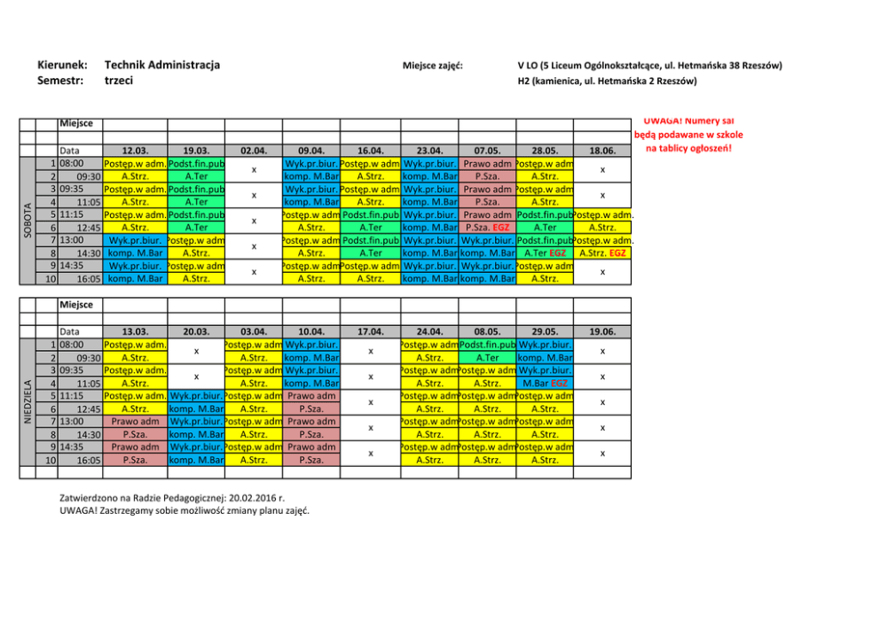 Kierunek: Semestr: Technik Administracja trzeci Miejsce zajęć: V LO (5 Liceum Ogólnokształcące, ul. Hetmańska 38 Rzeszów) H2 (kamienica, ul. Hetmańska 2 Rzeszów) UWAGA! Numery sal będą podawane w szkole na tablicy ogłoszeń! SOBOTA Miejsce 1 2 3 4 5 6 7 8 9 10 Data 08:00 09:30 09:35 11:05 11:15 12:45 13:00 14:30 14:35 16:05 12.03. 19.03. Postęp.w adm. Podst.fin.pub A.Strz. A.Ter Postęp.w adm. Podst.fin.pub A.Strz. A.Ter Postęp.w adm. Podst.fin.pub A.Strz. A.Ter Wyk.pr.biur. Postęp.w adm. komp. M.Bar A.Strz. Wyk.pr.biur. Postęp.w adm. komp. M.Bar A.Strz. 02.04. x x x x x 09.04. 16.04. 23.04. 07.05. 28.05. 18.06. Wyk.pr.biur. Postęp.w adm. Wyk.pr.biur. Prawo adm Postęp.w adm. x komp. M.Bar A.Strz. komp. M.Bar P.Sza. A.Strz. Wyk.pr.biur. Postęp.w adm. Wyk.pr.biur. Prawo adm Postęp.w adm. x komp. M.Bar A.Strz. komp. M.Bar P.Sza. A.Strz. Postęp.w adm.Podst.fin.pub Wyk.pr.biur. Prawo adm Podst.fin.pubPostęp.w adm. A.Strz. A.Ter komp. M.Bar P.Sza. EGZ A.Ter A.Strz. Postęp.w adm.Podst.fin.pub Wyk.pr.biur. Wyk.pr.biur. Podst.fin.pubPostęp.w adm. A.Strz. A.Ter komp. M.Bar komp. M.Bar A.Ter EGZ A.Strz. EGZ Postęp.w adm.Postęp.w adm. Wyk.pr.biur. Wyk.pr.biur.Postęp.w adm. x A.Strz. A.Strz. komp. M.Bar komp. M.Bar A.Strz. NIEDZIELA Miejsce 1 2 3 4 5 6 7 8 9 10 Data 13.03. 20.03. 03.04. 10.04. 08:00 Postęp.w adm. Postęp.w adm.Wyk.pr.biur. x A.Strz. A.Strz. komp. M.Bar 09:30 09:35 Postęp.w adm. Postęp.w adm.Wyk.pr.biur. x A.Strz. A.Strz. komp. M.Bar 11:05 11:15 Postęp.w adm. Wyk.pr.biur.Postęp.w adm. Prawo adm A.Strz. komp. M.Bar A.Strz. P.Sza. 12:45 13:00 Prawo adm Wyk.pr.biur.Postęp.w adm. Prawo adm P.Sza. komp. M.Bar A.Strz. P.Sza. 14:30 14:35 Prawo adm Wyk.pr.biur.Postęp.w adm. Prawo adm P.Sza. komp. M.Bar A.Strz. P.Sza. 16:05 Zatwierdzono na Radzie Pedagogicznej: 20.02.2016 r. UWAGA! Zastrzegamy sobie możliwość zmiany planu zajęć. 17.04. x x x x x 24.04. 08.05. 29.05. Postęp.w adm.Podst.fin.pub Wyk.pr.biur. A.Strz. A.Ter komp. M.Bar Postęp.w adm. Postęp.w adm.Wyk.pr.biur. A.Strz. A.Strz. M.Bar EGZ Postęp.w adm. Postęp.w adm. Postęp.w adm. A.Strz. A.Strz. A.Strz. Postęp.w adm. Postęp.w adm. Postęp.w adm. A.Strz. A.Strz. A.Strz. Postęp.w adm. Postęp.w adm. Postęp.w adm. A.Strz. A.Strz. A.Strz. 19.06. x x x x x
