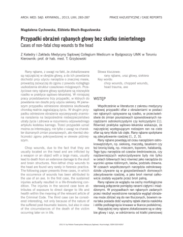ARCH. MED. SĄD. KRYMINOL., 2013, LXIII, 283-287 PRACE KAZUISTYCZNE / CASE REPORTS Magdalena Cychowska, Elżbieta Bloch-Bogusławska Przypadki obrażeń rąbanych głowy bez skutku śmiertelnego Cases of non-fatal chop wounds to the head Z Katedry i Zakładu Medycyny Sądowej Collegium Medicum w Bydgoszczy UMK w Toruniu Kierownik: prof. dr hab. med. T. Grzybowski Rany rąbane, z uwagi na fakt, że zlokalizowane są najczęściej w obrębie głowy, a do ich powstania dochodzi przy użyciu narzędzia o znacznej masie, prowadzą zazwyczaj do zgonu z powodu rozległego uszkodzenia struktur czaszkowo-mózgowych. Przeżyciowe rany rąbane głowy spotykane są niezwykle rzadko w praktyce sądowo-lekarskiej. W niniejszej pracy przedstawiono trzy przypadki, w których do powstania ran doszło przy użyciu siekiery. W pierwszym przypadku odniesione obrażenia skutkowały chorobą realnie zagrażającą życiu. W drugim przypadku odniesione obrażenia wyczerpywały znamiona narażenia na bezpośrednie niebezpieczeństwo utraty życia i zdrowia w rozumieniu odpowiedniego artykułu kodeksu karnego. Trzeci przypadek uznać można za interesujący, nie tylko z uwagi na charakter doznanych zmian pourazowych, ale również okoliczności zgonu pokrzywdzonej w okresie późniejszym. Chop wounds, due to the fact that they are usually located on the head and are inflicted by a weapon or an object with a large mass, usually lead to death from an extensive damage to the skull and brain structures. Non-lethal chop wounds to the head are found very rarely in forensic practice. The following paper presents three cases, in which the occurrence of wounds has been attributed to the use of an axe. In the first case, the sustained injuries actually resulted in a life-threatening condition. The injuries in the second case bore attributes of exposure to direct danger to life and health within the meaning of the relevant article of the Criminal Code. The third case can be considered interesting, not only because of the nature of the suffered post-traumatic lesions, but also in view of the circumstances of the death of the victim occurring later on in life. Słowa kluczowe: rany rąbane, uraz głowy, siekiera Key words: chop wounds, chopped wounds, head trauma, axe WSTĘP Współcześnie w literaturze z zakresu medycyny sądowej przypadki ofiar z obrażeniami w postaci ran rąbanych opisywane są rzadko, w przeciwieństwie do zmian pourazowych spowodowanych narzędziami ostrokończystymi czy kończystymi [1]. Również praktyka sądowo-lekarska wskazuje, że najczęściej występującym rodzajem ran na ciele ofiar są rany kłute lub cięte. Rany rąbane spotykane są zdecydowanie rzadziej [1, 2, 3]. Rany rąbane powstają od ciosu narzędziem ostrokrawędzistym, np. siekierą, maczetą, tasakiem czy też bronią białą, np. mieczem, toporem, halabardą. Tego typu narzędzia od czasów średniowiecza, czy najdawniejszych wykorzystywane były nie tylko w celach bitewnych lecz również jako narzędzia do wycinki upraw roślinnych, lasów, podziału drewna. W czasach współczesnych narzędzia ostrokrawędziste używane są w gospodarstwach domowych zdecydowanie rzadziej, a jako broń niemal całkowicie zostały wyparte przez broń palną. Rany rąbane ze względu na cechy morfologiczne stanowią połączenie pomiędzy ranami ciętymi i miażdżonymi. W przypadkach ran rąbanych zadanych przez niezbyt wyostrzone narzędzia wygląd obrażenia może zbliżać się do ran tłuczonych, bowiem rana taka posiada dość wyraźny rąbek otarcia naskórka i obfite podbiegnięcia krwawe w tkance podskórnej. Najczęściej rany rąbane zlokalizowane są w obrębie głowy i szyi, w odróżnieniu od klatki piersiowej 2013 © by Polskie Towarzystwo Medycyny Sądowej i Kryminologii, ISSN 0324-8267 284 Magdalena Cychowska, Elżbieta Bloch-Bogusławska i brzucha, gdzie z kolei najczęściej zlokalizowane są rany kłute. Rany rąbane zazwyczaj obejmują nie tylko skórę, ale także tkanki głębiej położone np. kości. W kościach czaszki obrażenia zadane przy użyciu narzędzia w postaci np. siekiery występują w postaci rysowatych włamań lub też głębokich szczelin, od których odchodzą linie złamań. Cechy morfologiczne obrażeń skóry (tj. brzegi, kąty, towarzyszące otarcia naskórka) oraz tkanek głębiej położonych (tj. złamania i wgłobienia) ułatwiają określenie kąta, pod jakim zostało przyłożone narzędzie, jak również jego indywidualne cechy [2, 3, 4, 5]. Rany rąbane zazwyczaj powstają w wyniku działania ręki obcej. Rzadziej są wynikiem działań samobójczych [1]. Przy działaniu osób trzecich są one liczne, o wielokierunkowym przebiegu i często współistnieją z rozległymi włamaniami kości czaszki. Lokalizacja ran rąbanych na głowie oraz fakt, że do ich powstania dochodzi przy użyciu narzędzia o znacznej masie, powoduje zazwyczaj zgon w następstwie rozległego uszkodzenia struktur czaszkowo-mózgowych [6, 7]. W niniejszej pracy przedstawiono trzy przypadki przeżyciowych ran rąbanych głowy. Do ich powstania doszło w wyniku działania osób trzecich. We wszystkich przypadkach użyto siekiery. Przypadek 1 52-letni mężczyzna został zaatakowany przez sąsiada siekierą na przystanku autobusowym w centrum miasta. Wskutek zadania trzech ciosów doszło do powstania ran rąbanych głowy. Świadkowie zdarzenia tj. grupa mężczyzn, przejeżdżających niedaleko samochodem powiadomili zarówno organy ścigania jak i pogotowie ratunkowe. Do Zakładu Medycyny Sądowej dostarczono siekierę o łącznej długości trzonka i części roboczej 38 cm. Wysokość części roboczej wynosiła 14 cm, długość krawędzi tnącej (ostrej) 9 cm. Jednakże z uwagi na brak zlecenia badania śladów biologicznych, nie przeprowadzono tego rodzaju badań na tym narzędziu. Jak wynikało z dokumentacji medycznej zawartej w aktach sprawy u pokrzywdzonego stwierdzono obrażenia na powłokach ciała w postaci