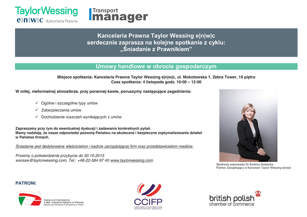 Kancelaria Prawna Taylor Wessing e|n|w|c serdecznie zaprasza na kolejne spotkanie z cyklu: „Śniadanie z Prawnikiem” Umowy handlowe w obrocie gospodarczym Miejsce spotkania: Kancelaria Prawna Taylor Wessing e|n|w|c, ul. Mokotowska 1, Zebra Tower, 10 piętro Czas spotkania: 4 listopada godz. 10:00 – 12:00 W miłej, nieformalnej atmosferze, przy porannej kawie, poruszymy następujące zagadnienia: Ogólne i szczególne typy umów Zabezpieczenia umów Dochodzenie roszczeń wynikających z umów Zapraszamy przy tym do ewentualnej dyskusji i zadawania konkretnych pytań. Mamy nadzieję, że nasze odpowiedzi pozwolą Państwu na skuteczne i bezpieczne zoptymalizowanie działań w Państwa firmach. Śniadanie jest dedykowane właścicielom i kadrze zarządzającej firm oraz przedstawicielom mediów. Prosimy o potwierdzenie przybycia do 30.10.2013 [email protected], Tel.: +48-22-584 97 40 www.taylorwessing.com Spotkanie poprowadzi Dr Ewelina Stobiecka Partner Zarządzający w Kancelarii Taylor Wessing e|n|w|c PATRONI: