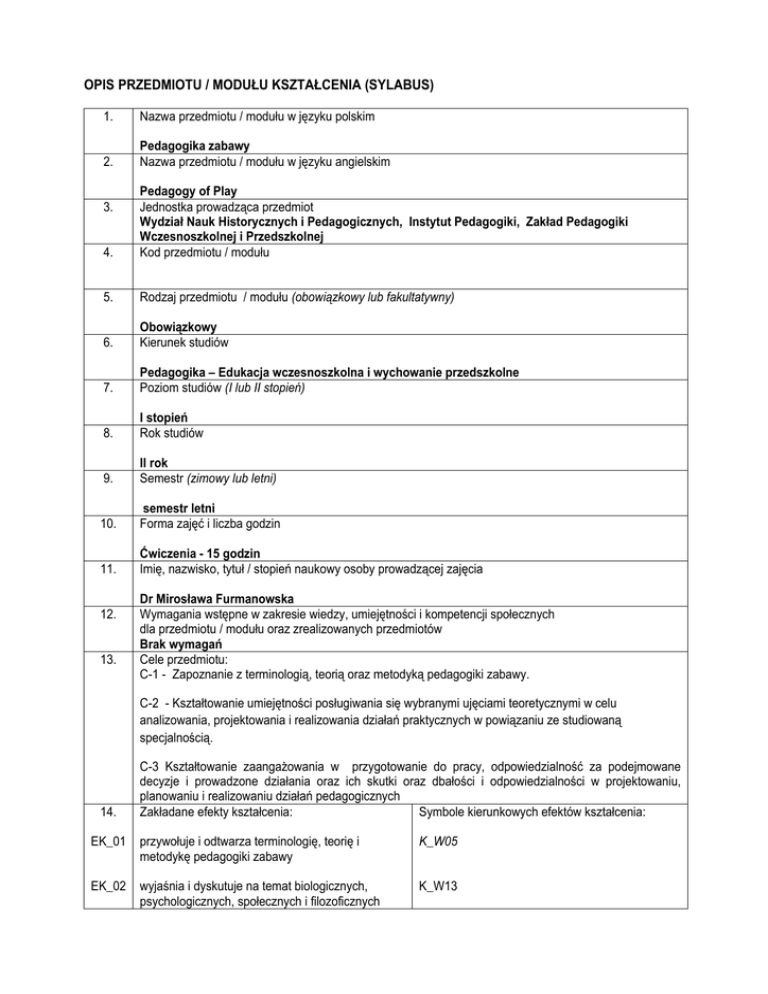 OPIS PRZEDMIOTU / MODUŁU KSZTAŁCENIA (SYLABUS) 1. Nazwa przedmiotu / modułu w języku polskim 2. Pedagogika zabawy Nazwa przedmiotu / modułu w języku angielskim 4. Pedagogy of Play Jednostka prowadząca przedmiot Wydział Nauk Historycznych i Pedagogicznych, Instytut Pedagogiki, Zakład Pedagogiki Wczesnoszkolnej i Przedszkolnej Kod przedmiotu / modułu 5. Rodzaj przedmiotu / modułu (obowiązkowy lub fakultatywny) 6. Obowiązkowy Kierunek studiów 7. Pedagogika – Edukacja wczesnoszkolna i wychowanie przedszkolne Poziom studiów (I lub II stopień) 8. I stopień Rok studiów 9. II rok Semestr (zimowy lub letni) 10. semestr letni Forma zajęć i liczba godzin 11. Ćwiczenia - 15 godzin Imię, nazwisko, tytuł / stopień naukowy osoby prowadzącej zajęcia 3. 12. 13. Dr Mirosława Furmanowska Wymagania wstępne w zakresie wiedzy, umiejętności i kompetencji społecznych dla przedmiotu / modułu oraz zrealizowanych przedmiotów Brak wymagań Cele przedmiotu: C-1 - Zapoznanie z terminologią, teorią oraz metodyką pedagogiki zabawy. C-2 - Kształtowanie umiejętności posługiwania się wybranymi ujęciami teoretycznymi w celu analizowania, projektowania i realizowania działań praktycznych w powiązaniu ze studiowaną specjalnością. 14. C-3 Kształtowanie zaangażowania w przygotowanie do pracy, odpowiedzialność za podejmowane decyzje i prowadzone działania oraz ich skutki oraz dbałości i odpowiedzialności w projektowaniu, planowaniu i realizowaniu działań pedagogicznych Zakładane efekty kształcenia: Symbole kierunkowych efektów kształcenia: EK_01 przywołuje i odtwarza terminologię, teorię i metodykę pedagogiki zabawy K_W05 EK_02 wyjaśnia i dyskutuje na temat biologicznych, psychologicznych, społecznych i filozoficznych K_W13 podstaw procesu rozwoju, kształcenia i wychowania EK_03 posługuje się wybranymi ujęciami teoretycznymi w K_U09 celu analizowania, projektowania i realizowania działań praktycznych w powiązaniu ze studiowaną specjalnością, potrafi wykrywać błędy i zaniedbania w praktyce EK_04 dobiera i stosuje właściwe środki i metody pracy w celu efektywnego wykonania pojawiających się zadań zawodowych, wykorzystuje wychowawcze aspekty promocji zdrowia i aktywności fizycznej w profilaktyce wykluczenia i niedostosowania społecznego. K_U11 K_K05 EK_05 postępuje zgodnie z wartościami, celami i zadaniami realizowanymi w praktyce pedagogicznej, wykazuje dbałość i odpowiedzialność w projektowaniu, planowaniu i realizowaniu działań pedagogicznych. EK_06 angażuje się w przygotowanie do pracy, wykazuje K_K08 odpowiedzialność za podejmowane decyzje i prowadzone działania oraz ich skutki. 15. Treści programowe: - Teoretyczne podstawy pedagogiki zabawy. - Zabawa jako zjawisko kulturowe, społeczne i kreacyjne - Rodzaje zabaw (integracyjne, plastyczne, muzyczne, ruchowe, z chustą animacyjną KLANZY) - Zabawy w sytuacjach psychoedukacyjnych - Zabawa jako czynnik integrując grupę. - Metody i techniki: integracyjne, diagnostyczne dyskusyjne, twórczego myślenia i twórczego - Zasady prawidłowego doboru zabaw. - Cechy zabawy dobrze przygotowanej i dobrze przeprowadzonej - Sylwetka animatora 16. Zalecana literatura (podręczniki) Literatura podstawowa: Czaja-Chudyba I., Pedagogika zabawy w osobowym i profesjonalnym przygotowaniu do zawodu nauczyciela, Kraków 2006 Kędzior-Niczyporuk E. (red.), Wprowadzenie do pedagogiki zabawy, Lublin 1998. Okoń W. Zabawa a rzeczywistość Warszawa 1987. Literatura uzupełniająca: Andrychowska-Biegacz J., Gry i zabawy rozwijające dla dzieci młodszych: 50 przykładów zajęć do praktycznego wykorzystania, Rzeszów 2006. Kulikowska K., Hopsanki zabawianki: zabawy taneczne w domu i w przedszkolu, Warszawa 2010. Napierała M., Zbiór zabaw i gier ruchowych, Bydgoszcz 2001. Portmann R., Gry i zabawy kształtujące pewność siebie. Kielce 2001. Szponar W., Wesołe zabawy i ćwiczenia dla dzieci czteroletnich, Warszawa 2003. 17. Forma zaliczenia poszczególnych komponentów przedmiotu / modułu, sposób sprawdzenia osiągnięcia zamierzonych efektów kształcenia: - ocena nabytej przez studenta wiedzy z zakresu pedagogiki zabawy – EK_01, EK_02 - umiejętność planowania, przeprowadzania i modyfikowania działań pedagogicznych – EK_03, EK-04 - umiejętność odpowiedzialnego działania i diagnozowania własnych błędów - EK_05 - umiejętność planowania własnego rozwoju zawodowego i osobistego – EK_06 Kryteria oceny: - ocena bardzo dobra – student ma ugruntowaną wiedzę z zakresu pedagogiki zabawy, opanował umiejętność planowania, organizowania, przeprowadzania i modyfikacji zabaw, właściwie dobiera zabawy dokonując pedagogicznej analizy sytuacji wychowanka. Potrafi analizować i oceniać własne oddziaływania wychowawcze, skutkujące diagnozą popełnianych błędów z jednoczesną umiejętnością planowania własnego rozwoju zawodowego i osobistego; - ocena dobra – student ma wystarczająca wiedzę z zakresu pedagogiki zabawy, opanował na dobrym poziomie umiejętność planowania, organizowania, przeprowadzania i modyfikacji zabaw. Właściwie dobiera zabawy dokonując pedagogicznej analizy sytuacji wychowanka. Potrafi analizować i oceniać własne oddziaływania wychowawcze, skutkujące diagnozą popełnianych błędów z jednoczesną umiejętnością planowania własnego rozwoju zawodowego i osobistego; - ocena dostateczna - student ma podstawową wiedzę z zakresu pedagogiki zabawy, opanował na dostatecznym poziomie umiejętność planowania, organizowania, przeprowadzania i modyfikacji zabaw. Poprawnie dobiera zabawy. Na wystarczającym poziomie dokonuje analizy pedagogicznej sytuacji wychowanka, ma świadomość popełnianych błędów oraz dostrzega konieczność rozwoju zawodowe i osobistego; - ocena niedostateczna - student legitymuje się brakiem wystarczającej wiedzy z pedagogiki zabawy niezbędnej do poprawnego planowania, organizowania, przeprowadzania i mod