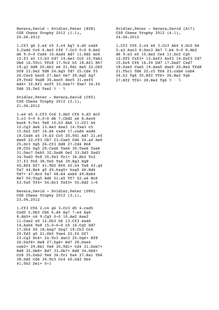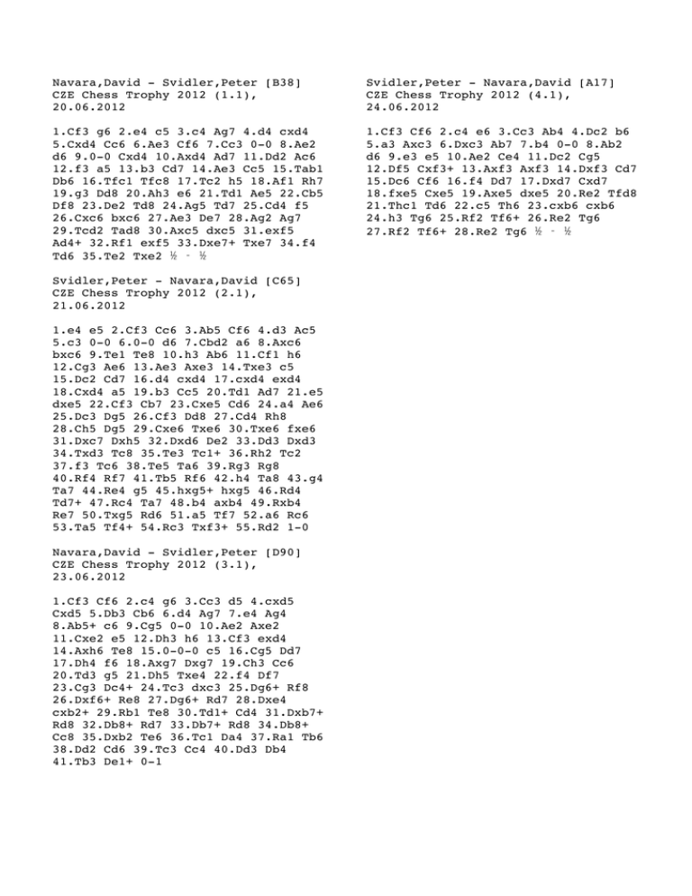 Navara,David - Svidler,Peter [B38] CZE Chess Trophy 2012 (1.1), 20.06.2012 Svidler,Peter - Navara,David [A17] CZE Chess Trophy 2012 (4.1), 24.06.2012 1.Cf3 g6 2.e4 c5 3.c4 Ag7 4.d4 cxd4 5.Cxd4 Cc6 6.Ae3 Cf6 7.Cc3 0-0 8.Ae2 d6 9.0-0 Cxd4 10.Axd4 Ad7 11.Dd2 Ac6 12.f3 a5 13.b3 Cd7 14.Ae3 Cc5 15.Tab1 Db6 16.Tfc1 Tfc8 17.Tc2 h5 18.Af1 Rh7 19.g3 Dd8 20.Ah3 e6 21.Td1 Ae5 22.Cb5 Df8 23.De2 Td8 24.Ag5 Td7 25.Cd4 f5 26.Cxc6 bxc6 27.Ae3 De7 28.Ag2 Ag7 29.Tcd2 Tad8 30.Axc5 dxc5 31.exf5 Ad4+ 32.Rf1 exf5 33.Dxe7+ Txe7 34.f4 Td6 35.Te2 Txe2 ½ - ½ 1.Cf3 Cf6 2.c4 e6 3.Cc3 Ab4 4.Dc2 b6 5.a3 Axc3 6.Dxc3 Ab7 7.b4 0-0 8.Ab2 d6 9.e3 e5 10.Ae2 Ce4 11.Dc2 Cg5 12.Df5 Cxf3+ 13.Axf3 Axf3 14.Dxf3 Cd7 15.Dc6 Cf6 16.f4 Dd7 17.Dxd7 Cxd7 18.fxe5 Cxe5 19.Axe5 dxe5 20.Re2 Tfd8 21.Thc1 Td6 22.c5 Th6 23.cxb6 cxb6 24.h3 Tg6 25.Rf2 Tf6+ 26.Re2 Tg6 27.Rf2 Tf6+ 28.Re2 Tg6 ½ - ½ Svidler,Peter - Navara,David [C65] CZE Chess Trophy 2012 (2.1), 21.06.2012 1.e4 e5 2.Cf3 Cc6 3.Ab5 Cf6 4.d3 Ac5 5.c3 0-0 6.0-0 d6 7.Cbd2 a6 8.Axc6 bxc6 9.Te1 Te8 10.h3 Ab6 11.Cf1 h6 12.Cg3 Ae6 13.Ae3 Axe3 14.Txe3 c5 15.Dc2 Cd7 16.d4 cxd4 17.cxd4 exd4 18.Cxd4 a5 19.b3 Cc5 20.Td1 Ad7 21.e5 dxe5 22.Cf3 Cb7 23.Cxe5 Cd6 24.a4 Ae6 25.Dc3 Dg5 26.Cf3 Dd8 27.Cd4 Rh8 28.Ch5 Dg5 29.Cxe6 Txe6 30.Txe6 fxe6 31.Dxc7 Dxh5 32.Dxd6 De2 33.Dd3 Dxd3 34.Txd3 Tc8 35.Te3 Tc1+ 36.Rh2 Tc2 37.f3 Tc6 38.Te5 Ta6 39.Rg3 Rg8 40.Rf4 Rf7 41.Tb5 Rf6 42.h4 Ta8 43.g4 Ta7 44.Re4 g5 45.hxg5+ hxg5 46.Rd4 Td7+ 47.Rc4 Ta7 48.b4 axb4 49.Rxb4 Re7 50.Txg5 Rd6 51.a5 Tf7 52.a6 Rc6 53.Ta5 Tf4+ 54.Rc3 Txf3+ 55.Rd2 1-0 Navara,David - Svidler,Peter [D90] CZE Chess Trophy 2012 (3.1), 23.06.2012 1.Cf3 Cf6 2.c4 g6 3.Cc3 d5 4.cxd5 Cxd5 5.Db3 Cb6 6.d4 Ag7 7.e4 Ag4 8.Ab5+ c6 9.Cg5 0-0 10.Ae2 Axe2 11.Cxe2 e5 12.Dh3 h6 13.Cf3 exd4 14.Axh6 Te8 15.0-0-0 c5 16.Cg5 Dd7 17.Dh4 f6 18.Axg7 Dxg7 19.Ch3 Cc6 20.Td3 g5 21.Dh5 Txe4 22.f4 Df7 23.Cg3 Dc4+ 24.Tc3 dxc3 25.Dg6+ Rf8 26.Dxf6+ Re8 27.Dg6+ Rd7 28.Dxe4 cxb2+ 29.Rb1 Te8 30.Td1+ Cd4 31.Dxb7+ Rd8 32.Db8+ Rd7 33.Db7+ Rd8 34.Db8+ Cc8 35.Dxb2 Te6 36.Tc1 Da4 37.Ra1 Tb6 38.Dd2 Cd6 39.Tc3 Cc4 40.Dd3 Db4 41.Tb3 De1+ 0-1