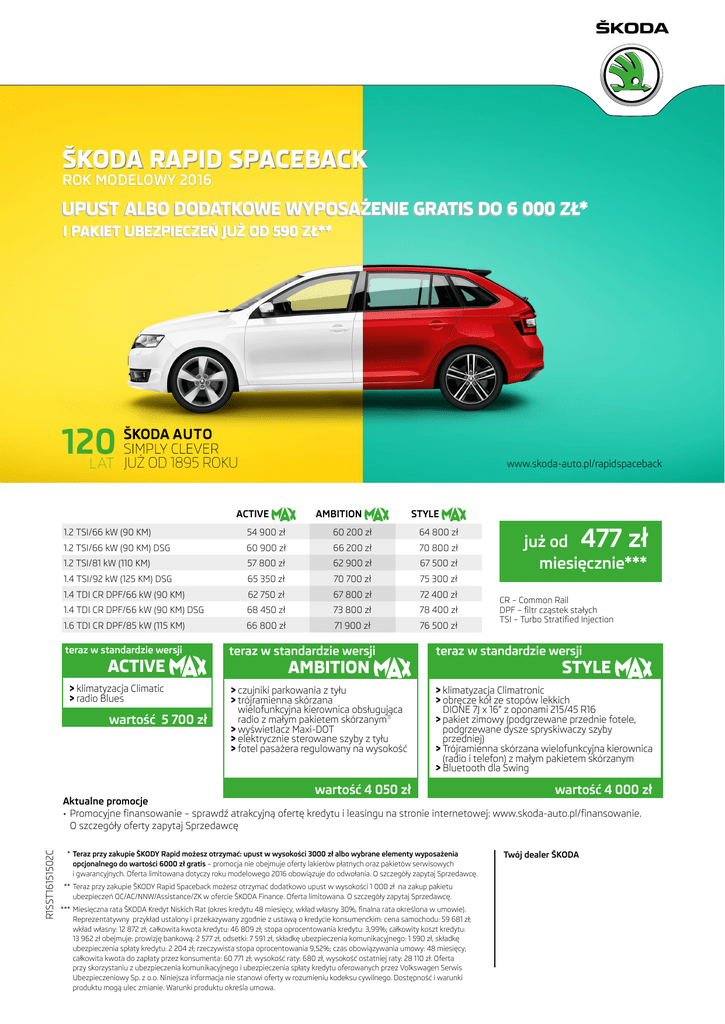 ŠKODA RAPID SPACEBACK ROK MODELOWY 2016 LAT JUŻ OD 1895 ROKU www.skoda-auto.pl/rapidspaceback ACTIVE AMBITION STYLE 1.2 TSI/66 kW (90 KM) 54 900 zł 60 200 zł 64 800 zł 1.2 TSI/66 kW (90 KM) DSG 60 900 zł 66 200 zł 70 800 zł 1.2 TSI/81 kW (110 KM) 57 800 zł 62 900 zł 67 500 zł 1.4 TSI/92 kW (125 KM) DSG 65 350 zł 70 700 zł 75 300 zł 1.4 TDI CR DPF/66 kW (90 KM) 62 750 zł 67 800 zł 72 400 zł 1.4 TDI CR DPF/66 kW (90 KM) DSG 68 450 zł 73 800 zł 78 400 zł 1.6 TDI CR DPF/85 kW (115 KM) 66 800 zł 71 900 zł 76 500 zł teraz w standardzie wersji ACTIVE > klimatyzacja Climatic > radio Blues wartość 5 700 zł 477 zł już od miesięcznie*** CR – Common Rail DPF – filtr cząstek stałych TSI – Turbo Stratified Injection teraz w standardzie wersji teraz w standardzie wersji > czujniki parkowania z tyłu > trójramienna skórzana wielofunkcyjna kierownica obsługująca radio z małym pakietem skórzanym11 > wyświetlacz Maxi-DOT > elektrycznie sterowane szyby z tyłu > fotel pasażera regulowany na wysokość > klimatyzacja Climatronic > obręcze kół ze stopów lekkich DIONE 7J x 16” z oponami 215/45 R16 > pakiet zimowy (podgrzewane przednie fotele, podgrzewane dysze spryskiwaczy szyby przedniej) > Trójramienna skórzana wielofunkcyjna kierownica (radio i telefon) z małym pakietem skórzanym > Bluetooth dla Swing AMBITION STYLE wartość 4 050 zł wartość 4 000 zł R1SST16151502C Aktualne promocje • Promocyjne finansowanie – sprawdź atrakcyjną ofertę kredytu i leasingu na stronie internetowej: www.skoda-auto.pl/finansowanie. O szczegóły oferty zapytaj Sprzedawcę * Teraz przy zakupie ŠKODY Rapid możesz otrzymać: upust w wysokości 3000 zł albo wybrane elementy wyposażenia opcjonalnego do wartości 6000 zł gratis – promocja nie obejmuje oferty lakierów płatnych oraz pakietów serwisowych i gwarancyjnych. Oferta limitowana dotyczy roku modelowego 2016 obowiązuje do odwołania. O szczegóły zapytaj Sprzedawcę. **Teraz przy zakupie ŠKODY Rapid Spaceback możesz otrzymać dodatkowo upust w wysokości 1 000 zł na zakup pakietu ubezpieczeń OC/AC/NNW/Assistance/ZK w ofercie ŠKODA Finance. Oferta limitowana. O szczegóły zapytaj Sprzedawcę. ***Miesięczna rata ŠKODA Kredyt Niskich Rat (okres kredytu 48 miesięcy, wkład własny 30%, finalna rata określona w umowie). Reprezentatywny przykład ustalony i przekazywany zgodnie z ustawą o kredycie konsumenckim: cena samochodu: 59 681 zł; wkład własny: 12 872 zł; całkowita kwota kredytu: 46 809 zł; stopa oprocentowania kredytu: 3,99%; całkowity koszt kredytu: 13 962 zł obejmuje: prowizję bankową: 2 577 zł, odsetki: 7 591 zł, składkę ubezpieczenia komunikacyjnego: 1 590 zł, składkę ubezpieczenia spłaty kredytu: 2 204 zł; rzeczywista stopa oprocentowania 9,52%; czas obowiązywania umowy: 48 miesięcy; całkowita kwota do zapłaty przez konsumenta: 60 771 zł; wysokość raty: 680 zł, wysokość ostatniej raty: 28 110 zł. Oferta przy skorzystaniu z ubezpieczenia komunikacyjnego i ubezpieczenia spłaty kredytu oferowanych przez Volkswagen Serwis Ubezpieczeniowy Sp. z o.o. Niniejsza informacja nie stanowi oferty w rozumieniu kodeksu cywilnego. Dostępność i warunki produktu mogą ulec zmianie. Warunki produktu określa umowa. Twój dealer ŠKODA ŠKODA RAPID ROK MODELOWY 2016 LAT JUŻ OD 1895 ROKU www.skoda-auto.pl/rapid ACTIVE AMBITION STYLE 1.2 TSI/66 kW (90 KM) 54 900 zł 60 200 zł 65 150 zł 1.2 TSI/66 kW (90 KM) DSG 60 900 zł 66 300 zł 71 150 zł 1.2 TSI/81 kW (110 KM) 57 800 zł 62 900 zł 67 850 zł 1.4 TSI/92 kW (125 KM) DSG 65 350 zł 70 700 zł 75 650 zł 1.4 TDI CR DPF/66 kW (90 KM) 62 650 zł 67 800 zł 72 750 zł 1.4 TDI CR DPF/66 kW (90 KM) DSG 68 450 zł 73 800 zł 78 750 zł 1.6 TDI CR DPF/85 kW (115 KM) 66 800 zł 71 900 zł 76 850 zł teraz w standardzie wersji ACTIVE > klimatyzacja Climatic > radio Blues wartość 5 700 zł TEST 2014 487 zł już od miesięcznie** CR – Common Rail DPF – filtr cząstek stałych TSI – Turbo Stratified Injection teraz w standardzie wersji teraz w standardzie wersji > czujniki parkowania z tyłu > trójramienna skórzana wielofunkcyjna kierownica obsługująca radio z małym pakietem skórzanym11 > wyświetlacz Maxi-DOT > elektrycznie sterowane szyby z tyłu > fotel pasażera regulowany na wysokość > klimatyzacja Climatronic > obręcze kół ze stopów lekkich DIONE 7J x 16” z oponami 215/45 R16 > pakiet zimowy (podgrzewane przednie fotele, podgrzewane dysze spryskiwaczy szyby przedniej) > Trójramienna skórzana wielofunkcyjna kierownica (radio i telefon) z małym pakietem skórzanym > Bluetooth dla Swing AMBITION STYLE wartość 4 050 zł wartość 4 000 zł R1SST16151502C Aktualne promocje • Promocyjne finansowanie – sprawdź atrakcyjną ofertę kredytu i leasingu na stronie internetowej: www.skoda-auto.pl/finansowanie. O szczegóły oferty zapytaj Sprzedawcę * Teraz przy zakupie ŠKODY Rapid możesz otrzymać: upust w wysokości 3000 zł albo wybrane elementy wyposażenia opcjonalnego do wartości 6000 zł gratis – promocja nie obejmuje oferty lakierów płatnych oraz pakietów serwisowych i gwarancyjnych. Oferta limitowana dotyczy roku modelowego 2016 obowiązuje do odwołania. O szczegóły zapytaj Sprzedawcę. **Miesięczna rata ŠKODA Kredyt Niskich Rat (okres kredytu 48 miesięcy, wkład własny 30%, finalna rata określona w umowie). Reprezentatywny przykład ustalony i przekazywany zgodnie z ustawą o kredycie konsumenckim: cena samochodu: 59 681 zł; wkład własny: 12 872 zł; całkowita kwota kredytu: 46 809 zł; stopa oprocentowania kredytu: 3,99%; całkowity koszt kredytu: 13 962 zł obejmuje: prowizję bankową: 2 577 zł, odsetki: 7 591 zł, składkę ubezpieczenia komunikacyjnego: 1 590 zł, składkę ubezpieczenia spłaty kredytu: 2 204 zł; rzeczywista stopa oprocentowania 9,52%; czas obowiązywania umowy: 48 miesięcy; całkowita kwota do zapłaty przez konsumenta: 60 771 zł; wysokość ra