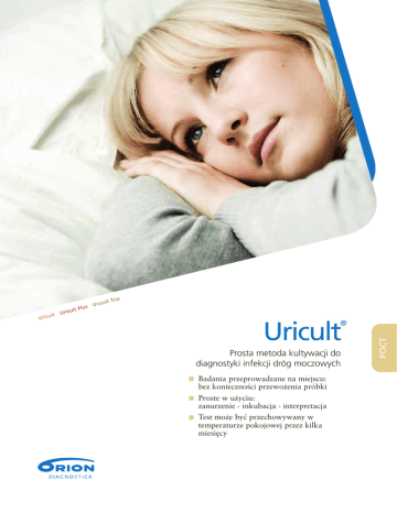 ricu lt U Uricu o lt Tri Uricult ® Prosta metoda kultywacji do diagnostyki infekcji dróg moczowych Badania przeprowadzane na miejscu: bez konieczności przewożenia próbki Proste w użyciu: zanurzenie - inkubacja - interpretacja Test może być przechowywany w temperaturze pokojowej przez kilka miesięcy PoCT Uricu s lt Plu Uricult ® Prosta metoda kultywacji do diagnostyki infekcji dróg moczowych. Infekcja dróg moczowych (ZUM) jest jednym z najczęstszych zakażeń bakteryjnych. Prawidłowe postawienie diagnozy jest bardzo ważne, bowiem nieleczone infekcje dróg moczowych mogą prowadzić do poważnego uszkodzenia nerek. Aby dokładnie postawić diagnozę, ważne jest przeprowadzenie hodowli na próbce moczu, która została prawidłowo pobrana i przewieziona. Niewłaściwy transport próbki moczu z miejsca pobrania do laboratorium i niewłaściwa manipulacja z próbką może doprowadzić do rozmnożenia bakterii, a w wyniku tego do otrzymania błędnych wyników. Uricult to prosta metoda kultywacji przeznaczona do diagnostyki infekcji dróg moczowych. Testy mogą być przeprowadzone w gabinecie lekarskim natychmiast po pobraniu próbki moczu. Próbka moczu inokulowana na płytce Uricult zapewnia otrzymanie wiarygodnych wyników niezbędnych do postawienia właściwej diagnozy. Płytki Uricult mogą być przewożone do laboratorium w celu przeprowadzenia inkubacji i interpretacji bez specjalnych środków ostrożności. Uricult to płytka testowa, która jest z obu stron pokryta agarem. Płytkę można zanurzyć w próbce lub próbkę można nanieść na płytkę. Inokulowaną płytkę należy wsunąć z powrotem do plastikowego naczynia i jest gotowa do przeprowadzenia inkubacji lub do transportu. Produkt Nr kat. Uricult • do wykrycia infekcji dróg moczowych • CLED/MacConkey agar • większość bakterii, które powodują zakażenie dróg moczowych rosną na agarze CLED • agar MacConkey jest selektywny dla bakterii Gramujemnych 67404 Uricult® Plus • specjalnie zaprojektowany do wykrywania enterokoków • CLED/MacConkey + agar specyficzny dla enterokoków • enterokoki rosną w postaci czerwonych kolonii na agarze, który jest specyficzny dla enterokoków 67465 Uricult® Trio • specjalnie zaprojektowany do wykrywania E. coli • CLED/MacConkey + agar dla E.coli • bakterie E.coli wytwarzające ß-glukuronidazę rosną jako ciemne kolonie na agarze dla E.coli 68197 ® Uricult jest zastrzeżonym znakiem towarowym spółki Orion Diagnostica Oy. yciu! ż u ew t s o r P Uricult® Uricult® Plus bki o pró zu tkę d oc ły m p ę k rz Zanu lub prób k, aby ta zu c ę o k t m łą pły ył ca j na pokr ru. nale wicie ga całko zchnię a ier pow Uricult® Trio Inkubacja w inkubatorze Cultura M pozwala odczytać wyniki w ciągu 1–2 dni! Orion Diagnostica Oy, Finlandia oczu ął iar m spłyn Nadm aw, aby opli r t k s ę o poz reszt tki a rem ż z pły papie nie włó z c ą tęp s ods a N . m do e m t y o c ssą owr nia. ęzp aczy płytk owego n ik t s pla z prze ynie nacz j u b Inku godzin w 2 °C 36 ± 4 16 –2 aturze + ze r r e u t p era tem dni. temp z 1–3 ć lub w wej prze ysła w jo a o n pok moż do ynie Nacz orium orat ia b la dzen do a w pro prze cji. ba inku iu tkę czen ij pły okoń Po d cji, wyjm j wna a ó b r u o ip lą ink tabe ynia z z c a ii zn lon ść ko o t s gę ą. elow mod Przedstawicielstwo dla CZ, HU, PL, SK, Bělohorská 57, 169 00 Praga 6, Republika Czeska Tel: +48 664 382 811, Faks: +420 233 350 532, www.oriondiagnostica.pl 782-02PL, 09/2013