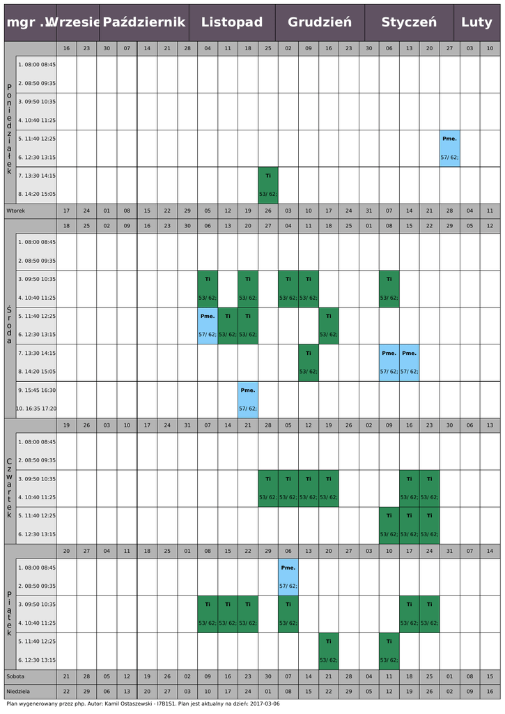 mgr ... Wrzesień Październik 16 23 30 07 14 21 28 Listopad 04 11 18 Grudzień 25 02 09 16 23 Styczeń 30 06 13 20 Luty 27 03 10 1. 08:00 08:45 P o n i e d z i a ł e k 2. 08:50 09:35 3. 09:50 10:35 4. 10:40 11:25 5. 11:40 12:25 Pme. 6. 12:30 13:15 57/ 62; 7. 13:30 14:15 Ti 8. 14:20 15:05 53/ 62; Wtorek 17 24 01 08 15 22 29 05 12 19 26 03 10 17 24 31 07 14 21 28 04 11 18 25 02 09 16 23 30 06 13 20 27 04 11 18 25 01 08 15 22 29 05 12 Ti Ti 16 23 30 06 13 Ti Ti 31 07 14 1. 08:00 08:45 2. 08:50 09:35 Ś r o d a 3. 09:50 10:35 Ti Ti 4. 10:40 11:25 53/ 62; 53/ 62; 5. 11:40 12:25 Pme. 6. 12:30 13:15 Ti 53/ 62; 53/ 62; Ti 53/ 62; 7. 13:30 14:15 Ti 8. 14:20 15:05 53/ 62; Pme. 10. 16:35 17:20 57/ 62; 19 26 03 10 17 24 31 07 14 21 53/ 62; Ti 57/ 62; 53/ 62; 53/ 62; 9. 15:45 16:30 Ti Pme. Pme. 57/ 62; 57/ 62; 28 05 12 19 Ti Ti Ti Ti 26 02 09 1. 08:00 08:45 C z w a r t e k 2. 08:50 09:35 3. 09:50 10:35 4. 10:40 11:25 53/ 62; 53/ 62; 53/ 62; 53/ 62; 53/ 62; 53/ 62; 5. 11:40 12:25 Ti 6. 12:30 13:15 Ti 53/ 62; 53/ 62; 53/ 62; 20 P i ą t e k Ti 27 04 11 18 25 01 08 15 22 29 06 1. 08:00 08:45 Pme. 2. 08:50 09:35 57/ 62; 3. 09:50 10:35 Ti 4. 10:40 11:25 Ti Ti 13 20 27 03 10 Ti 53/ 62; 53/ 62; 53/ 62; 53/ 62; 17 24 Ti Ti 53/ 62; 53/ 62; 5. 11:40 12:25 Ti Ti 6. 12:30 13:15 53/ 62; 53/ 62; Sobota 21 28 05 12 19 26 02 09 16 23 30 07 14 21 28 04 11 18 25 01 08 15 Niedziela 22 29 06 13 20 27 03 10 17 24 01 08 15 22 29 05 12 19 26 02 09 16 Plan wygenerowany przez php. Autor: Kamil Ostaszewski - I7B1S1. Plan jest aktualny na dzień: 2017-03-06