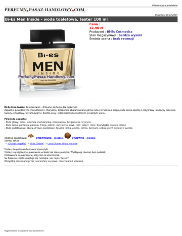 Informacje o produkcie Utworzono 06-03-2017 Bi-Es Men Inside - woda toaletowa, tester 100 ml Cena : 12,90 zł Producent : Bi-Es Cosmetics Stan magazynowy : bardzo wysoki Średnia ocena : brak recenzji Bi-Es Men Inside to orientalno - drzewne perfumy dla mężczyzn Zapach z prawdziwym charakterem i charyzmą. Doskonale zbalansowana górna nuta cytrusowa z ciepłą nutą serca opartą o przyprawy i zapachy drzewne. Świeży, zmysłowy, wyrafinowany i bardzo sexy. Odpowiedni dla mężczyzn w każdym wieku. Piramida zapachu: - Nuta głowy: imbir, lawenda, mandarynka, brzoskwinia, bergamotka i cytryna - Nuta serca: gardenia, paczula, frezja, jaśmin, wetyweria, anyż, cedr, pieprz, róża i brazylijskie drzewo różane - Nuta podstawowa: skóra, drzewo sandałowe, fasolka tonka, ambra, piżmo, benzoes, kokos, mech dębowy i wanilia Rodzina zapachowa: Zobacz także : Chanel [męskie] ORIENTALNE - męskie, Linia Chanel DRZEWNE - męskie Linia Chanel Allure Homme Testery to pełnowartościowe kosmetyki. Testery są najczęściej pakowane w białe lub szare pudełka. Występują również bez pudełek. Pozbawione są najczęściej zatyczki na atomizerze. Na flakonie często znajduje się naklejka, lub napis "tester". Wszystkie oferowane przez nas testery są nowe, nieużywane i sprawne Wygenerowano w programie www.oscGold.com