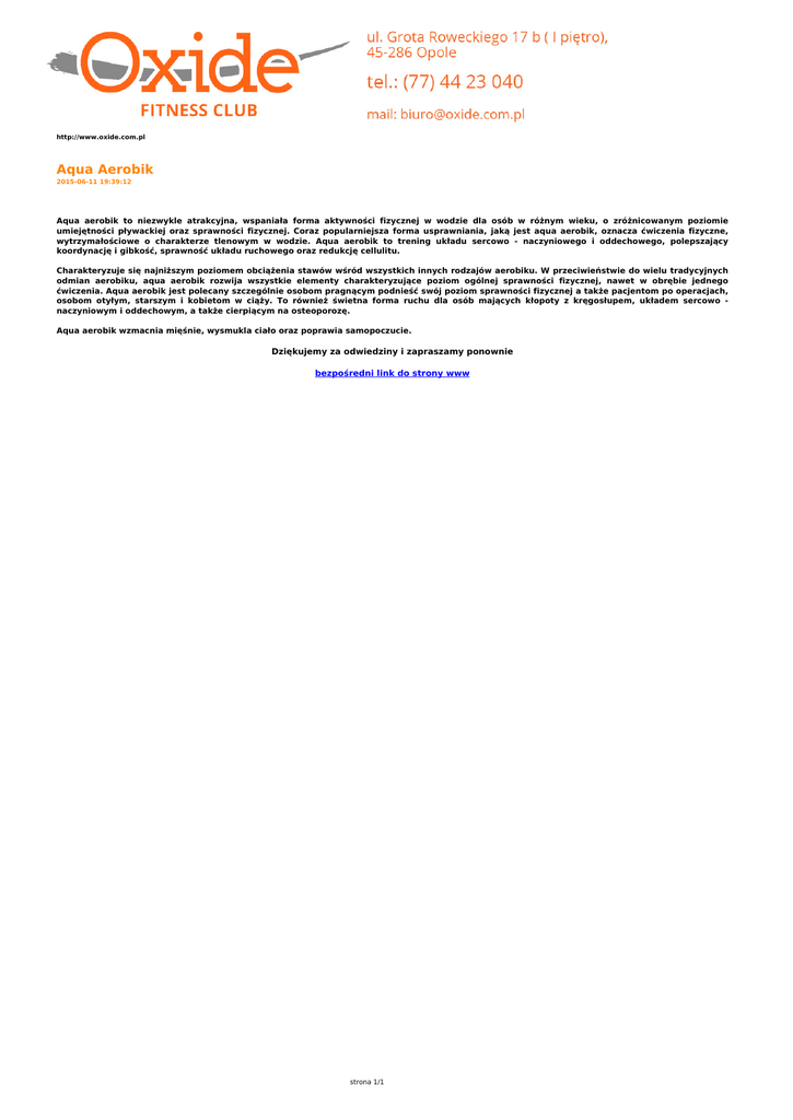 http://www.oxide.com.pl Aqua Aerobik 2015-06-11 19:39:12 Aqua aerobik to niezwykle atrakcyjna, wspaniała forma aktywności fizycznej w wodzie dla osób w różnym wieku, o zróżnicowanym poziomie umiejętności pływackiej oraz sprawności fizycznej. Coraz popularniejsza forma usprawniania, jaką jest aqua aerobik, oznacza ćwiczenia fizyczne, wytrzymałościowe o charakterze tlenowym w wodzie. Aqua aerobik to trening układu sercowo - naczyniowego i oddechowego, polepszający koordynację i gibkość, sprawność układu ruchowego oraz redukcję cellulitu. Charakteryzuje się najniższym poziomem obciążenia stawów wśród wszystkich innych rodzajów aerobiku. W przeciwieństwie do wielu tradycyjnych odmian aerobiku, aqua aerobik rozwija wszystkie elementy charakteryzujące poziom ogólnej sprawności fizycznej, nawet w obrębie jednego ćwiczenia. Aqua aerobik jest polecany szczególnie osobom pragnącym podnieść swój poziom sprawności fizycznej a także pacjentom po operacjach, osobom otyłym, starszym i kobietom w ciąży. To również świetna forma ruchu dla osób mających kłopoty z kręgosłupem, układem sercowo naczyniowym i oddechowym, a także cierpiącym na osteoporozę. Aqua aerobik wzmacnia mięśnie, wysmukla ciało oraz poprawia samopoczucie. Dziękujemy za odwiedziny i zapraszamy ponownie bezpośredni link do strony www strona 1/1 Powered by TCPDF (www.tcpdf.org)