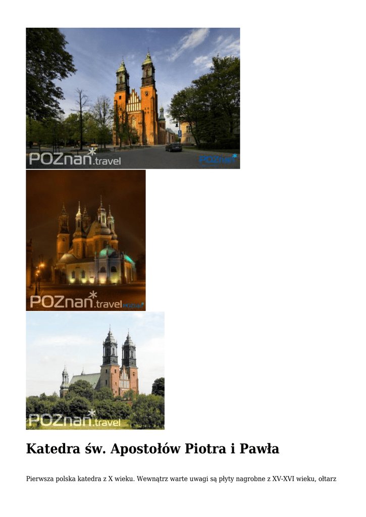 Katedra św. Apostołów Piotra i Pawła Pierwsza polska katedra z X wieku. Wewnątrz warte uwagi są płyty nagrobne z XV-XVI wieku, ołtarz główny gotycki z 1512 r. oraz XIX-wieczna Złota Kaplica, w której znajduje się sarkofag oraz pomnik pierwszych polskich władców Mieszka I i Bolesława Chrobrego. W podziemiach można zobaczyć relikty pierwszej katedry, grobowce pierwszych władców oraz baptysterium. Obok katedry powstało nowoczesne Interaktywne Centrum Historii Ostrowa Tumskiego. Tuż po utworzeniu pierwszego biskupstwa (968) w pobliżu palatium książęcego i kaplicy fundowanej w 965 r. na Ostrowie Tumskim Mieszko I rozpoczął budowę trójnawowej bazyliki wczesnoromańskiej. Główne wejście do katedry znajduje się w fasadzie frontowej i prowadzi przez gotycki portal z XV w. i drzwi z brązu ze scenami z życia św. Piotra i św. Pawła. Nad portalem wysokie okno gotyckie z rozetą, wyżej schodkowy szczyt z blendami. Katedra to trójnawowy kościół bazylikowy z ambitem i nawami bocznymi, do których przylega 12 kaplic, 2 zakrystie i kruchta. Prezbiterium i ambit nakryte są sklepieniem żebrowym, a nawa główna i boczne gwiaździstym. Pośrodku znajduje się późnogotycki ołtarz główny - poliptyk z 1512 r. z rzeźbami Maryi z Dzieciątkiem, św. Barbary i św. Katarzyny w części środkowej; na skrzydłach bocznych cztery kwatery z rzeźbami 12 świętych niewiast, a po stronie przeciwnej malowane sceny Męki Pańskiej oraz sylwetki świętych. W prezbiterium zwróć uwagę na pięknie rzeźbione późnogotyckie stalle z XVI w. W posadzce przed prezbiterium zobaczysz płytę z brązu upamiętniającą pierwszego biskupa Jordana oraz imiona 7 władców spoczywających w katedrze. Nawę zamyka chór muzyczny z organami. Wiele cennych dzieł sztuki znajduje się w nawach bocznych, ambicie i kaplicach, które w większości zachowały barokowy charakter. Koniecznie zobacz w nawach bocznych 5 gotyckich i renesansowych spiżowych płyt nagrobnych z XIV i XV w. z norymberskiego warsztatu Vischerów, jedne z najcenniejszych dzieł sztuki w katedrze. Zrabowane przez Niemców w czasie wojny, odnalezione po wielu perypetiach powróciły w 1990 r. z Sankt Petersburga. W kaplicach zwróć uwagę przede wszystkim na okazały renesansowy nagrobek rodu Górków z 1574 r., dzieło Hieronima Canavesiego w kaplicy Najświętszego Sakramentu oraz obraz Wjazd św. Marcina do Amiens, dzieło Krzysztota Boguszewskiego z 1628 r. w kaplicy św. Marcina. Szczególne znaczenie mają dwie kaplice - Złota, czyli Królów Polskich i św. Stanisława, zwana też Królewską. W Złotej Kaplicy, wzorowanej na architekturze bizantyjskiej, znajduje się sarkofag z 1840 r. ze szczątkami pierwszych polskich władców Mieszka I i Bolesława Chrobrego oraz ich pomnik, dzieło Christiana Raucha z 1841 r. W kaplicy Królewskiej (gdzie niegdyś znajdował się nagrobek króla Przemysła II) można zobaczyć monumentalne epitafium króla z 1995 r. Zajrzyj do podziemi katedry! Znajdziesz tam relikty katedry wczesnoromańskiej i romańskiej, odkryte w latach 1946 i 1951-56 oraz domniemane grobowce Mieszka I i Bolesława Chrobrego. W dalszej części krypty, pod zachodnią częścią prezbiterium utworzono lapidarium kamiennych nagrobków i epitafiów, a w ostatniej w 1963 r. utworzono kryptę grobową poznańskich arcybiskupów i sufraganów.