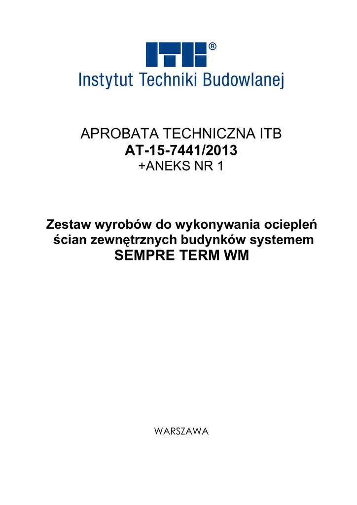 APROBATA TECHNICZNA ITB AT-15-7441/2013 +ANEKS NR 1 Zestaw wyrobów do wykonywania ociepleń ścian zewnętrznych budynków systemem SEMPRE TERM WM WARSZAWA Aprobata techniczna została opracowana w Zakładzie Aprobat Technicznych przez mgr inż. Annę POLKOWSKĄ Projekt okładki: Ewa Kossakowska GW V Kopiowanie aprobaty technicznej jest dozwolone jedynie w całości Wykonano z oryginałów bez opracowania wydawniczego © Copyright by Instytut Techniki Budowlanej Warszawa 2014 ISBN 978-83-249-7472-6 Dział Upowszechniania Wiedzy 02-656 Warszawa, ul. Ksawerów 21, tel.: 22 843 35 19 Format pdf wydano w maju 2014 r. zam. 365/2014 Seria: APROBATY TECHNICZNE APROBATA TECHNICZNA ITB AT-15-7441/2013 Na podstawie rozporządzenia Ministra Infrastruktury z dnia 8 listopada 2004 r. w sprawie aprobat technicznych oraz jednostek organizacyjnych upoważnionych do ich wydawania (Dz. U. Nr 249 z 2004 r., poz. 2497), w wyniku postępowania aprobacyjnego dokonanego w Instytucie Techniki Budowlanej w Warszawie na wniosek firmy: SEMPRE FARBY Sp. z o.o. ul. Gen. J. Kustronia 60, 43-301 Bielsko-Biała stwierdza się przydatność do stosowania w budownictwie wyrobów pod nazwą: Zestaw wyrobów do wykonywania ociepleń ścian zewnętrznych budynków systemem SEMPRE TERM WM w zakresie i na zasadach określonych w Załączniku, który jest integralną częścią niniejszej Aprobaty Technicznej ITB. DYREKTOR Instytutu Techniki Budowlanej Termin ważności: 23 września 2018 r. Jan Bobrowicz Załącznik: Postanowienia ogólne i techniczne Warszawa, 23 września 2013 r. Aprobata Techniczna ITB AT-15-7441/2013 jest nowelizacją Aprobaty Technicznej ITB AT-15-7441/2007. Dokument Aprobaty Technicznej ITB AT-15-7441/2013 zawiera 13 stron. Tekst tego dokumentu można kopiować tylko w całości. Publikowanie lub upowszechnianie w każdej innej formie fragmentów tekstu Aprobaty Technicznej wymaga pisemnego uzgodnienia z Instytutem Techniki Budowlanej. ® AT-15-7441/2013 2/13 ZAŁĄCZNIK POSTANOWIENIA OGÓLNE I TECHNICZNE SPIS TREŚCI 1. PRZEDMIOT APROBATY.................................................................................................... 3 2. PRZEZNACZENIE, ZAKRES I WARUNKI STOSOWANIA .................................................. 4 3. WŁAŚCIWOŚCI TECHNICZNE. WYMAGANIA ................................................................... 5 3.1. Wyroby wchodzące w skład zestawu SEMPRE TERM WM......................................... 5 3.2. Układy ociepleniowe SEMPRE TERM WM .................................................................. 7 4. PAKOWANIE, PRZECHOWYWANIE I TRANSPORT ......................................................... 7 5. OCENA ZGODNOŚCI .......................................................................................................... 8 5.1. Zasady ogólne .............................................................................................................. 8 5.2. Wstępne badanie typu .................................................................................................. 9 5.3. Zakładowa kontrola produkcji ....................................................................................... 9 5.4. Badania gotowych wyrobów ....................................................................................... 10 5.5. Częstotliwość badań ................................................................................................... 10 5.6. Metody badań ............................................................................................................. 11 5.7. Pobieranie próbek do badań ...................................................................................... 11 5.8. Ocena wyników badań ............................................................................................... 11 6. USTALENIA FORMALNO - PRAWNE ............................................................................... 11 7. TERMIN WAŻNOŚCI ........................................................................................................ 12 INFORMACJE DODATKOWE ............................................................................................... 12 ® AT-15-7441/2013 3/13 1. PRZEDMIOT APROBATY Przedmiotem Aprobaty Technicznej ITB jest zestaw wyrobów do wykonywania ociepleń ścian zewnętrznych budynków systemem SEMPRE TERM WM, polegającym na umocowaniu do istniejących ścian, od zewnątrz, warstwowego układu, składającego się z płyt z wełny mineralnej jako materiału termoizolacyjnego, warstwy zbrojonej wykonanej z zaprawy klejącej i siatki zbrojącej oraz warstwy wykończeniowej (wyprawy tynkarskiej). Płyty z wełny mineralnej powinny być mocowane do ścian za pomocą łączników mechanicznych i zaprawy klejącej. Producentem zestawu wyrobów SEMPRE TERM WM jest firma SEMPRE FARBY Sp. z o.o, ul. Gen. J. Kustronia 60, 43-301 Bielsko-Biała. W skład zestawu wyrobów SEMPRE TERM WM wchodzą następujące wyroby, które Producent powinien dostarczać odbiorcom w komplecie: 1) Zaprawa klejąca „TESOROMONT WM-200 Zaprawa klejowa do przyklejania wełny mineralnej i zatapiania siatki”, przeznaczona do mocowania płyt z wełny mineralnej oraz do wykonywania na nich warstwy zbrojonej. Zaprawa dostarczana jest w postaci suchej mieszanki, którą przed użyciem należy wymieszać z wodą w proporcji wagowej 100 : 21. 2) Preparat gruntujący o nazwie handlowej „MARESIL GRUNT”, przeznaczony do gruntowania warstwy zbrojonej pod krzemianową wyprawę tynkarską. Preparat dostarczany jest w postaci gotowej do stosowania, w kolorze białym lub w kolorze masy tynkarskiej. Orientacyjne zużycie preparatu gruntującego wynosi 0,15 ÷ 0,25 kg/m2. 3) Krzemianowa masa tynkarska o nazwie handlowej „MARESIL TYNK”, przeznaczona do wykonywania wypraw tynkarskich. Masa dostarczana jest w postaci gotowej do stosowania. Rodzaj faktury, maksymalne frakcje oraz orientacyjne zużycie masy podano tablicy 1. Tablica 1 Masa ty