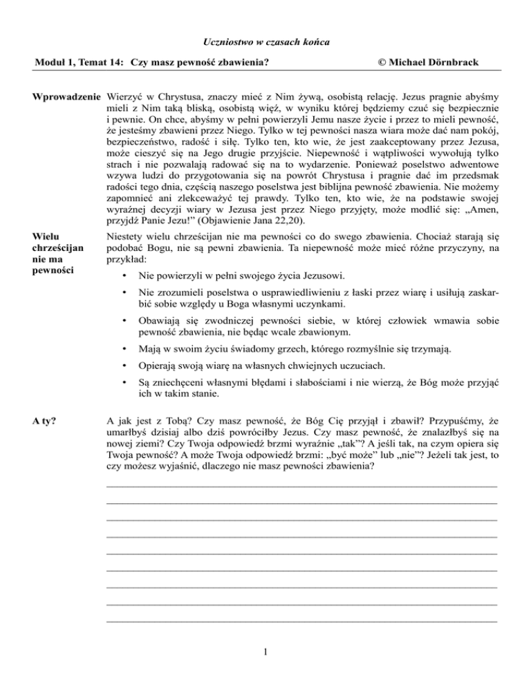 Uczniostwo w czasach końca Moduł 1, Temat 14: Czy masz pewność zbawienia? © Michael Dörnbrack Wprowadzenie Wierzyć w Chrystusa, znaczy mieć z Nim żywą, osobistą relację. Jezus pragnie abyśmy mieli z Nim taką bliską, osobistą więź, w wyniku której będziemy czuć się bezpiecznie i pewnie. On chce, abyśmy w pełni powierzyli Jemu nasze życie i przez to mieli pewność, że jesteśmy zbawieni przez Niego. Tylko w tej pewności nasza wiara może dać nam pokój, bezpieczeństwo, radość i siłę. Tylko ten, kto wie, że jest zaakceptowany przez Jezusa, może cieszyć się na Jego drugie przyjście. Niepewność i wątpliwości wywołują tylko strach i nie pozwalają radować się na to wydarzenie. Ponieważ poselstwo adwentowe wzywa ludzi do przygotowania się na powrót Chrystusa i pragnie dać im przedsmak radości tego dnia, częścią naszego poselstwa jest biblijna pewność zbawienia. Nie możemy zapomnieć ani zlekceważyć tej prawdy. Tylko ten, kto wie, że na podstawie swojej wyraźnej decyzji wiary w Jezusa jest przez Niego przyjęty, może modlić się: „Amen, przyjdź Panie Jezu!” (Objawienie Jana 22,20). Wielu chrześcijan nie ma pewności A ty? Niestety wielu chrześcijan nie ma pewności co do swego zbawienia. Chociaż starają się podobać Bogu, nie są pewni zbawienia. Ta niepewność może mieć różne przyczyny, na przykład: • Nie powierzyli w pełni swojego życia Jezusowi. • Nie zrozumieli poselstwa o usprawiedliwieniu z łaski przez wiarę i usiłują zaskarbić sobie względy u Boga własnymi uczynkami. • Obawiają się zwodniczej pewności siebie, w której człowiek wmawia sobie pewność zbawienia, nie będąc wcale zbawionym. • Mają w swoim życiu świadomy grzech, którego rozmyślnie się trzymają. • Opierają swoją wiarę na własnych chwiejnych uczuciach. • Są zniechęceni własnymi błędami i słabościami i nie wierzą, że Bóg może przyjąć ich w takim stanie. A jak jest z Tobą? Czy masz pewność, że Bóg Cię przyjął i zbawił? Przypuśćmy, że umarłbyś dzisiaj albo dziś powróciłby Jezus. Czy masz pewność, że znalazłbyś się na nowej ziemi? Czy Twoja odpowiedź brzmi wyraźnie „tak”? A jeśli tak, na czym opiera się Twoja pewność? A może Twoja odpowiedź brzmi: „być może” lub „nie”? Jeżeli tak jest, to czy możesz wyjaśnić, dlaczego nie masz pewności zbawienia? _________________________________________________________________________ _________________________________________________________________________ _________________________________________________________________________ _________________________________________________________________________ _________________________________________________________________________ _________________________________________________________________________ _________________________________________________________________________ _________________________________________________________________________ _________________________________________________________________________ 1 To jest możliwe! Biblia wyraża się w tym względzie całkiem wyraźnie! Jest to możliwe, aby nie tylko mieć nadzieję czy przeczuwać, lecz także wiedzieć, że doświadczyło się odkupienia przez Jezusa Chrystusa. Ten kto oddał swoje życie Jezusowi, może wiedzieć, że ma życie wieczne. Nie tylko możemy, lecz nawet powinniśmy mieć pewność zbawienia, ponieważ Bóg obiecał nam to bezpieczeństwo. Co apostoł Jan napisał o pewności zbawienia? Pod jakim warunkiem możemy ją mieć? _________________________________________________________________________ 1 List Jana 5,11-13 _________________________________________________________________________ _________________________________________________________________________ Jan pisze: „Kto ma Syna, ten ma żywot, kto nie ma Syna Bożego, ten nie ma żywota”, po czym dodaje: „To napisałem wam, którzy wierzycie w imię Syna Bożego, abyście wiedzieli, że macie żywot wieczny”. Nasza pewność tego, że mamy życie wieczne, zależna jest od naszego wyraźnego opowiedzenia się za Jezusem Chrystusem. Kiedy oddajemy Mu swoje życie, On wypełnia swoją obietnicę w stosunku do nas i darowuje nam pewność zbawienia. Bez tego całkowitego oddania się Chrystusowi pozostaje tylko niepewność lub zwodnicza pewność zbawienia. Pewność zbawienia nie jest zatem zależna od tego, czy jesteśmy już wystarczająco dobrzy, lecz od tego czy przychodzimy z naszą słabością do Jezusa i w pełni pokładamy nadzieję w Nim. Podstawą naszej pewności zbawienia nie jest to, na ile wzrośliśmy już w uświęceniu, lecz usprawiedliwienie, które następuje tylko z łaski przez wiarę. Pewność zbawienia ja JA Niepewność lub fałszywa pewność zbawienia Fascynujące, radosne, przynoszące owoc życie chrześcijańskie jest niemożliwe bez pewności zbawienia. Dręczące myśli o tym czy Bóg nas przyjął, okradają nas z radości wiary i odwagi świadczenia. Tak jak małżeństwo może naprawdę wzrastać dopiero wtedy, gdy obaj małżonkowie mają pewność, że są akceptowani bezwarunkowo przez swoich partnerów, podobnie i my możemy wzrastać w naszej wierze dopiero wówczas, kiedy wiemy, że Bóg nas przyjął. Jednakże ta pewność zbawienia nie oznacza, że jest ono zagwarantowane na zawsze. Możemy ponownie utracić życie wieczne. Biblijna pewność zbawienia nie oznacza „raz zbawiony, na zawsze zbawiony”. Nie dotyczy ona jutra i wieczności, lecz dnia dzisiejszego, tej chwili. 2 Jak poniższe teksty biblijne opisują pewność, którą mogą mieć wierzący? Ew. Jana 6,47:_____________________________________________________________ _________________________________________________________________________ _________________________________________________________________________ List do Rzymian 5,1:________________________________________________________ ________________________