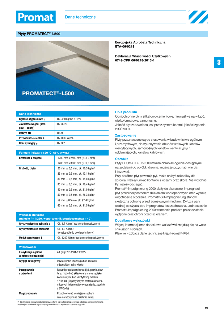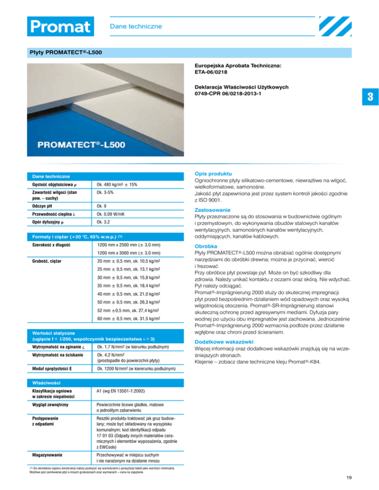 Dane techniczne Płyty PROMATECT®-L500 Europejska Aprobata Techniczna: ETA-06/0218 Deklaracja Właściwości Użytkowych 0749-CPR 06/0218-2013-1 Dane techniczne Gęstość objętościowa ρ Ok. 480 kg/m3 ± 15% Zawartość wilgoci (stan pow. – suchy) Ok. 3-5% Odczyn pH Ok. 9 Przewodność cieplna λ Ok. 0,09 W/mK Opór dyfuzyjny μ Ok. 3,2 Formaty i ciężar (+20 °C, 65% w.w.p.) Szerokość x długość (1) 1200 mm x 2500 mm (± 3,0 mm) 1200 mm x 3000 mm (± 3,0 mm) Grubość, ciężar 20 mm ± 0,5 mm, ok. 10,5 kg/m2 25 mm ± 0,5 mm, ok. 13,1 kg/m2 30 mm ± 0,5 mm, ok. 15,8 kg/m2 35 mm ± 0,5 mm, ok. 18,4 kg/m2 40 mm ± 0,5 mm, ok. 21,0 kg/m2 50 mm ± 0,5 mm, ok. 26,3 kg/m2 52 mm ±0,5 mm, ok. 27,4 kg/m2 60 mm ± 0,5 mm, ok. 31,5 kg/m2 Wartości statyczne (ugięcie f Ł l/250, współczynnik bezpieczeństwa ν ł 3) Wytrzymałość na zginanie ς Ok. 1,7 N/mm2 (w kierunku podłużnym) Wytrzymałość na ściskanie Ok. 4,2 N/mm2 (prostopadle do powierzchni płyty) Moduł sprężystości E Ok. 1200 N/mm2 (w kiererunku podłużnym) 3 Opis produktu Ogniochronne płyty silikatowo-cementowe, niewrażliwe na wilgoć, wielkoformatowe, samonośne. Jakość płyt zapewniona jest przez system kontroli jakości zgodnie z ISO 9001. Zastosowanie Płyty przeznaczone są do stosowania w budownictwie ogólnym i przemysłowym, do wykonywania obudów stalowych kanałów wentylacyjnych, samonośnych kanałów wentylacyjnych, oddymiających, kanałów kablowych. Obróbka Płyty PROMATECT®-L500 można obrabiać ogólnie dostępnymi narzędziami do obróbki drewna; można je przycinać, wiercić i frezować. Przy obróbce płyt powstaje pył. Może on być szkodliwy dla zdrowia. Należy unikać kontaktu z oczami oraz skórą. Nie wdychać. Pył należy odciągać. Promat®-Imprägnierung 2000 służy do skutecznej impregnacji płyt przed bezpośrednim działaniem wód opadowych oraz wysoką wilgotnością otoczenia. Promat®-SR-lmprägnierung stanowi skuteczną ochronę przed agresywnymi mediami. Dyfuzja pary wodnej po użyciu obu impregnatów jest zachowana. Jednocześnie Promat®-Imprägnierung 2000 wzmacnia podłoże przez działanie wgłębne oraz chroni przed ścieraniem. Dodatkowe wskazówki Więcej informacji oraz dodatkowe wskazówki znajdują się na wcześniejszych stronach. Klejenie – zobacz dane techniczne kleju Promat®-K84. Właściwości Klasyfikacja ogniowa w zakresie niepalności A1 (wg EN 13501-1:2002) Wygląd zewnętrzny Powierzchnie licowe gładkie, matowe o jednolitym zabarwieniu Postępowanie z odpadami Resztki produktu traktować jak gruz budowlany; może być składowany na wysypisku komunalnym; kod identyfikacji odpadu 17 01 03 (Odpady innych materiałów ceramicznych i elementów wyposażenia, zgodnie z EWCode) Magazynowanie Przechowywać w miejscu suchym i nie narażonym na działanie mrozu Do określenia ciężaru konstrukcji należy posłużyć się wartościami z powyższej tabeli jako wartości minimalne. Możliwe jest zamówienie płyt o innych grubościach oraz wymiarach – cena na zapytanie. (1) 19