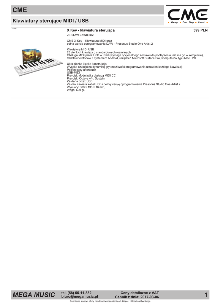 CME Klawiatury sterujące MIDI / USB 14694 X Key klawiatura sterująca 399 PLN ZESTAW ZAWIERA: CME XKey – Klawiatura MIDI oraz pełna wersja oprogramowania DAW Presonus Studio One Artist 2 Klawiatura MIDI USB 25 cienkich klawiszy o standardowych rozmiarach Obsługa MIDI przez USB w iPad (wymaga opcjonalnego zestawu do podłączenia, nie ma go w komplecie), tabletów/telefonów z systemem Android, urządzeń Microsoft Surface Pro, komputerów typu Mac i PC. Ultra cienka i lekka konstrukcja Wysoka czułość na dynamikę gry (możliwość programowania ustawień każdego klawisza) Polifoniczny aftertouch USBMIDI Przycisk Modulacji z obsługą MIDI CC Przyciski Octave +/ , Sustain Zasilana przez USB Zestaw zawiera kabel USB i pełną wersję oprogramowania Presonus Studio One Artist 2 Wymiary: 388 x 135 x 16 mm, Waga: 600 gr. MEGA MUSIC tel. (58) 5511882 [email protected] Ceny detaliczne z VAT Cennik z dnia: 20170306 Cennik nie stanowi oferty handlowej w rozumieniu art. 66 par. 1 Kodeksu Cywilnego 1