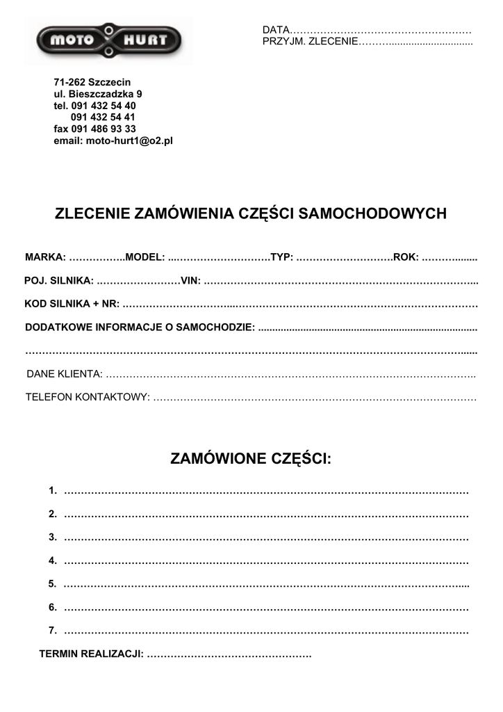 DATA……………………………………………… PRZYJM. ZLECENIE……….............................. 71-262 Szczecin ul. Bieszczadzka 9 tel. 091 432 54 40 091 432 54 41 fax 091 486 93 33 email: [email protected] ZLECENIE ZAMÓWIENIA CZĘŚCI SAMOCHODOWYCH MARKA: ……………..MODEL: ...……………………….TYP: .……………………….ROK: .………........ POJ. SILNIKA: .……………………VIN: .……………………………………………………………………... KOD SILNIKA + NR: .…………………………...……………………………………………………………… DODATKOWE INFORMACJE O SAMOCHODZIE: .............................................................................. …………………………………………………………………………………………………………………...... DANE KLIENTA: ……………………………………………………………………………………………….. TELEFON KONTAKTOWY: …………………………………………………………………………………… ZAMÓWIONE CZĘŚCI: 1. ………………………………………………………………………………………………………… 2. ………………………………………………………………………………………………………… 3. ………………………………………………………………………………………………………… 4. ………………………………………………………………………………………………………… 5. ……………………………………………………………………………………………………….... 6. ………………………………………………………………………………………………………… 7. ………………………………………………………………………………………………………… TERMIN REALIZACJI: ………………………………………….