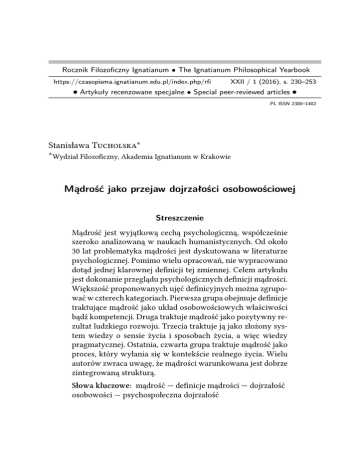 Rocznik Filozoficzny Ignatianum • The Ignatianum Philosophical Yearbook https://czasopisma.ignatianum.edu.pl/index.php/rfi XXII / 1 (2016), s. 230–253 • Artykuły recenzowane specjalne • Special peer-reviewed articles • PL ISSN 2300–1402 Stanisława T∗ ∗ Wydział Filozoficzny, Akademia Ignatianum w Krakowie Mądrość jako przejaw dojrzałości osobowościowej Streszczenie Mądrość jest wyjątkową cechą psychologiczną, współcześnie szeroko analizowaną w naukach humanistycznych. Od około 30 lat problematyka mądrości jest dyskutowana w literaturze psychologicznej. Pomimo wielu opracowań, nie wypracowano dotąd jednej klarownej definicji tej zmiennej. Celem artykułu jest dokonanie przeglądu psychologicznych definicji mądrości. Większość proponowanych ujęć definicyjnych można zgrupować w czterech kategoriach. Pierwsza grupa obejmuje definicje traktujące mądrość jako układ osobowościowych właściwości bądź kompetencji. Druga traktuje mądrość jako pozytywny rezultat ludzkiego rozwoju. Trzecia traktuje ją jako złożony system wiedzy o sensie życia i sposobach życia, a więc wiedzy pragmatycznej. Ostatnia, czwarta grupa traktuje mądrość jako proces, który wyłania się w kontekście realnego życia. Wielu autorów zwraca uwagę, że mądrości warunkowana jest dobrze zintegrowaną strukturą. Słowa kluczowe: mądrość — definicje mądrości — dojrzałość osobowości — psychospołeczna dojrzałość Mądrość jako przejaw dojrzałości osobowościowej 231 Wprowadzenie Mądrość to szczególna właściwość przynależąca człowiekowi ceniona w wielu kulturach i cywilizacjach. Problematyka mądrości przez stulecia była przedmiotem opracowań i badań prowadzonych głównie na gruncie filozofii i religii, gdzie traktowana była jako cnota. Powszechne jest przekonanie, że mądrość to konstrukt trudny do ujęcia m.in. z racji swojej złożoności. Dowodem przemawiającym za jej wielowymiarowością jest to, iż na przestrzeni wieków przedstawiciele różnych kultur akcentowali jej odmienne aspekty. Przykładowo w kulturze zachodu (szczególnie u Greków) podkreślano jej racjonalną naturę, zaś przedstawiciele kultur wschodnich, azjatyckich (głównie Chińczycy i Hindusi) upatrywali jej istotę w spokoju i emocjonalnej równowadze1 . Pomimo unikalności i znaczącej roli dla funkcjonowania człowieka, przez bardzo długi czas mądrość nie była przedmiotem refleksji, badań i opracowań w naukach społecznych. Złożyło się na to wiele przyczyn. U2 , opierając się na pracach H i C3 oraz B i współpracowników4 , wskazuje na źródła braku zainteresowania psychologów problematyką mądrości. Do najważniejszych zalicza: ● niechęć do filozoficznego podejścia charakteryzującego się mentalistycznym sposobem wyjaśniania, które jest różne od preferowanego na gruncie psychologii ilościowego ujmowania wyizolowanych funkcji psychicznych oraz ich uwarunkowań fizjologicznych i środowiskowych; ● wymóg operacjonalizacji pojęć psychologicznych oraz zasada ich ujmowania w modelach związków przyczynowoskutkowych zgodnie z założeniami pozytywizmu logicznego; 1 2 3 4 Por. T & O, Cultural Foundations of Wisdom, s. 32–60. Por. U, Mądrość, s. 53–68. H & C, Wisdom. B, G & K, Wisdom: Its Structure and Function. 232 Stanisława Tucholska ● mechanicystyczne podejście do procesu rozwoju i degradacji kompetencji ludzkich; ● ujmowanie ludzkiej wiedzy w terminach sprawności poznawczych z równoczesnym pomniejszaniem wiedzy praktycznej i przedświadomej (ukrytej); ● postrzeganie mądrości jako umiejętności poznania „obiektywnie prawdziwych” wartości rodziło obawy, iż psychologia mądrości może rozwijać się jako nauka normatywna. Należy jednak zaznaczyć, iż na gruncie psychologii, zanim podjęto systematyczne badania, kwestie mądrości podejmowane były w pracach E, K, F i M5 . E postrzegał mądrość jako efekt pomyślnego rozwiązania kryzysu przypadającego na ostatni etap życia i traktował ją jako wskaźnik osiągnięcia optymalnego stanu rozwoju przez człowieka6 . K mądrość łączył z osiągnięciem wysokiego poziomu rozwoju moralnego7 . F istotę mądrości upatrywał w poszukiwaniu sensu życia8 . Dla M natomiast mądrość była wskaźnikiem zdrowia psychicznego osoby i wyrazem jej autentyczności9 . Ostatnie dekady przyniosły wyraźną zmianę w tym względzie. Problematyka mądrości stała się przedmiotem dyskusji, badań i opracowań psychologów o różnej orientacji teoretycznej m.in. za sprawą Vivian P. C, która jako pierwsza zapytała o to, czym jest mądrość i jaki jest jej związek z wiekiem życia10 . Podjęła też próbę określenia jej specyfiki i odróżnienia od inteligencji11 . Zdynamizowali ten typ poszukiwań H i C12 oraz S13 , przepro5 6 7 8 9 10 11 12 13 Por. K, J & S, e Meaning of Wisdom, s. 837–881. Por. E.H. E, Dopełniony cykl życia. Por. K, e Claim to Moral Adequacy. Por. F, Homo patiens. Por. M, Motywacja a osobowość. Por. C, Erikson’s eory of Human Development. Por. C, Wisdom and Intelligence. Por. H & C, Wisdom. Por. S, Implicit eories of Intelligence. Mądrość jako przejaw dojrzałości osobowościowej 233 wadzając obszerne badania, w których pytali osoby dorosłe o to, czym charakteryzują się ludzie mądrzy14 . Systematyczne, szeroko zakrojone psychologiczne badania dotyczące mądrości prowadzone są od ponad dwóch dekad przez zespół psychologów pracujących pod kierunkiem Paula B. B w MaxPlanck-Institut ür Bildungsforschung (Institute for Human Development) w Berlinie (tworzą go m.in. Jacqui S, Ute K, Ursula M. S, Judith G). Nawiązują oni do założeń psychologii poznawczej oraz psychologii biegu życia (life-span). Innym ważnym ośrodkiem badawczym podejmującym problematykę mądrości jest, kierowane przez Roberta J. S, Centrum Psychologiczne zajmujące się Zdolnościami, Kompetencjami i Ekspertyzami 