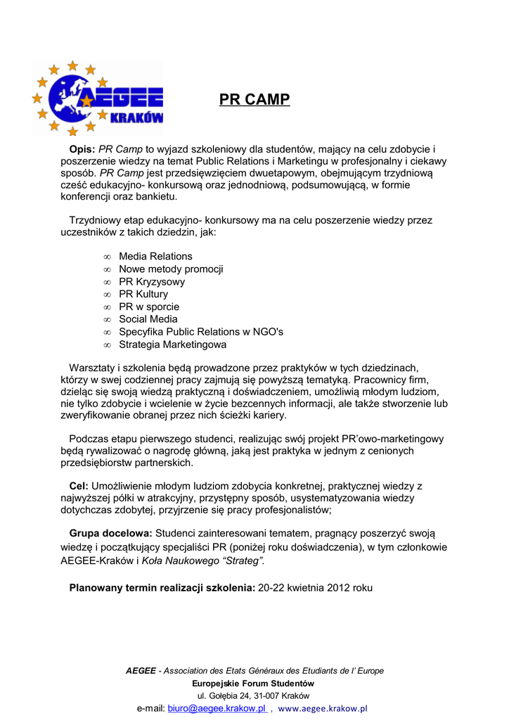 PR CAMP Opis: PR Camp to wyjazd szkoleniowy dla studentów, mający na celu zdobycie i poszerzenie wiedzy na temat Public Relations i Marketingu w profesjonalny i ciekawy sposób. PR Camp jest przedsięwzięciem dwuetapowym, obejmującym trzydniową cześć edukacyjno- konkursową oraz jednodniową, podsumowującą, w formie konferencji oraz bankietu. Trzydniowy etap edukacyjno- konkursowy ma na celu poszerzenie wiedzy przez uczestników z takich dziedzin, jak: • • • • • • • • Media Relations Nowe metody promocji PR Kryzysowy PR Kultury PR w sporcie Social Media Specyfika Public Relations w NGO's Strategia Marketingowa Warsztaty i szkolenia będą prowadzone przez praktyków w tych dziedzinach, którzy w swej codziennej pracy zajmują się powyższą tematyką. Pracownicy firm, dzieląc się swoją wiedzą praktyczną i doświadczeniem, umożliwią młodym ludziom, nie tylko zdobycie i wcielenie w życie bezcennych informacji, ale także stworzenie lub zweryfikowanie obranej przez nich ścieżki kariery. Podczas etapu pierwszego studenci, realizując swój projekt PR’owo-marketingowy będą rywalizować o nagrodę główną, jaką jest praktyka w jednym z cenionych przedsiębiorstw partnerskich. Cel: Umożliwienie młodym ludziom zdobycia konkretnej, praktycznej wiedzy z najwyższej półki w atrakcyjny, przystępny sposób, usystematyzowania wiedzy dotychczas zdobytej, przyjrzenie się pracy profesjonalistów; Grupa docelowa: Studenci zainteresowani tematem, pragnący poszerzyć swoją wiedzę i początkujący specjaliści PR (poniżej roku doświadczenia), w tym członkowie AEGEE-Kraków i Koła Naukowego “Strateg”. Planowany termin realizacji szkolenia: 20-22 kwietnia 2012 roku AEGEE - Association des Etats Généraux des Etudiants de l’ Europe Europejskie Forum Studentów ul. Gołębia 24, 31-007 Kraków e-mail: [email protected] , www.aegee.krakow.pl