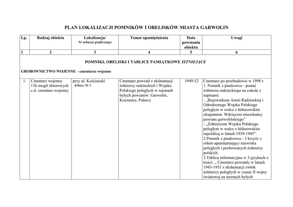 PLAN LOKALIZACJI POMNIKÓW I OBELISKÓW MIASTA GARWOLIN Lp. Rodzaj obiektu Lokalizacja/ Temat upamiętnienia Nr arkusza graficznego 1 2 3 4 Data powstania obiektu 5 Uwagi 6 POMNIKI, OBELISKI I TABLICE PAMIĄTKOWE ISTNIEJĄCE GROBOWNICTWO WOJENNE – cmentarze wojenne 1. Cmentarz wojenny przy ul. Kościuszki 136 mogił zbiorowych Arkusz Nr 1 c.d. cmentarz wojenny Cmentarz powstał z ekshumacji żołnierzy radzieckich i Wojska Polskiego poległych w rejonach byłych powiatów: Garwolin, Kozienice, Puławy 1949-52 Cmentarz po przebudowie w 1998 r. 1. Pomnik z piaskowca - postać żołnierza radzieckiego na cokole z napisami: - „Bojownikom Armii Radzieckiej i Odrodzonego Wojska Polskiego poległym w walce z hitlerowskim okupantem. Wdzięczni mieszkańcy powiatu garwolińskiego” - „Żołnierzom Wojska Polskiego poległym w walce z hitlerowskim najeźdźcą w latach 1939-1945”. 2.Pomnik z piaskowca - 3 krzyże z orłem upamiętniający nazwiska poległych i pochowanych żołnierzy polskich. 3.Tablica informacyjna w 3 językach o treści: „ Cmentarz powstały w latach 1943-1953 z ekshumacji zwłok żołnierzy poległych w czasie II wojny światowej na terenach byłych powiatów: garwolińskiego, kozienickiego i puławskiego . Na cmentarzu spoczywają: 10288 żołnierzy Armii Radzieckiej, 262 jeńców wojennych, 405 żołnierzy Wojska Polskiego, w tym: 301 poległych w 1939 r. 104 poległych w 1944 r. 8 obywateli cywilnych ZSRR. Cmentarz objęty jest opieką Urzędu Miasta w Garwolinie, ul. Staszica 15 gdzie znajduje się imienna ewidencja pochowanych żołnierzy WP i Amii Radzieckiej” 4. Krzyż katolicki z lastriko ,obok głaz narzutowy z płaskorzeźbą orła i napisem: „1939-1945 Garwolin 1990r.” GROBOWNICTWO WOJENNE - mogiły indywidualne i zbiorowe na cmentarzu parafialnym 2. 3. 4. Pomnik na mogile wojennej zbiorowej (1863) Pomnik na mogile wojennej zbiorowej (1920) Cmentarz parafialny Pomnik na mogile wojennej zbiorowej dot. okresu II wojny światowej Cmentarz parafialny W hołdzie powstańcom 1863 - Arkusz Nr 1 Cmentarz parafialny Arkusz Nr 1 Arkusz Nr 1 Mogiła żołnierzy Wojska Polskiego poległych w roku 1920 1930 Nieznanym żołnierzom Wojska Polskiego poległym w 1939 r. w czasie bombardowania miasta Garwolina. 1939 Pomnik z piaskowca wg projektu Jerzego Jarząbka z napisem: „W hołdzie Powstańcom 1863” Nagrobek obłożony kamieniami z tablicą mosiężną i napisem: ”Obrońcom Ojczyzny poległym pod Garwolinem w roku 1920. Miasto Garwolin. 1930” Pomnik granitowy w kształcie miecza z napisem i orłem w koronie. Napis: ”Nieznanym obrońcom Ojczyzny 1939”. 5. Pomnik na mogile Cmentarz parafialny wojennej dot. okresu II Arkusz Nr 1 wojny światowej Mogiła Stanisławy Leśniakowicz, lekarki WP, zmarłej 11.08.1944 r. z ran odniesionych w walkach o wolność Ojczyzny. 1944 6. Pomnik na mogile Cmentarz parafialny wojennej dot. okresu II Arkusz Nr 1 wojny światowej Mogiła Stefana Zyśka ps. „Kruczek” żołnierza AK poległego podczas akcii „Burza” w dniu 27.07.1944 r. 1944 Nagrobek kamienny granitowy z napisem i płaskorzeźbą orła w koronie. Napis: „Stanisława Leśniakowicz. Lekarz Wojska Polskiego. Żyła lat 24. Zmarła 11.VIII.1944 r. z ran odniesionych w walkach o wolność Ojczyzny” Nagrobek kamienny z medalionem, tablicą informacyjną, wizerunkiem Krzyża Walecznych oraz Znaku Polski Walczącej. Napis: „Śp. Stefan Zyśk Kruczek żołnierz Armii Krajowej. Kapral Oddziału Dywersyjnego. Odznaczony Krzyżem Walecznych. Zginął w walce z Niemcami dn. 27 VII.1944r. Koledzy”. MIEJSCA PAMIĘCI NARODOWEJ – mogiły, pomniki, tablice pamiątkowe 7. 8. Pomnik na mogile indywidualnej Cmentarz parafialny Pomnik na mogile zbiorowej dot. okresu II wojny światowej Cmentarz parafialny Arkusz Nr 1 Arkusz Nr 1 Mogiła majora Juliana Mazarakiego oficera wojska polskiego, uczestnika wojny polsko-rosyjskiej 1831 r. odznaczonego Krzyżem Virtuti Militari 1897 Mogiła policjantów poległych w 1940 r. Miejsce pamięci policjantów i milicjantów 1940 Nagrobek - obelisk marmurowy - z obrzeżem granitowym i wypełnieniem z kostki granitowej oraz kutym łańcuchem. Napis: „ Ś.p. Julian Mazaraki obywatel ziemski b.major Wojsk Polskich. Kawaler Orderu Virtuti Militari. ur. 1801 um. 1897. Ś.p. Edmund Mazaraki ur. 1846 um.1893. Pokój ich duszom”. Nagrobek betonowy z lastriko, z tablicą z napisem: „ Ś.p. Stanisław Cieślik i Jan Pakuła polscy policjanci polegli poległych w obronie życia i mienia mieszkańców ziemi garwolińskiej . 9. 10. Tablica pamiątkowa dot. 1920 r. Skwer w centrum miasta Tablice pamiątkowe dot. 1920 r. Skwer im. Marszałka Józefa Piłsudskiego Arkusz Nr2 Arkusz Nr 2 dn.20.02.1940 r. „Miejsce pamięci policjantów i milicjantów poległych na ziemi garwolińskiej w obronie życia i mienia współobywateli”. Tablica pamiątkowa poświęcona 20.08.2000 Tablica mosiężna z orłem w koronie i 80 rocznicy „Cudu nad Wisłą” i napisem mieszczona na głazie wyzwolenie miasta Garwolina narzutowym. Napis: „ w 80-rocznicę spod okupacji bolszewickiej. „Cudu nad Wisłą” i wyzwolenia ziemi garwolińskiej spod okupacji bolszewickiej w dniu 16 sierpnia 1920 roku przez 14 Wielkopolską Dywizję Piechoty generała brygady Daniela Konarzewskiego. Społeczeństwo ziemi garwolińskiej. Garwolin sierpień 2000 roku”. Upamiętnienie pobytu 1936-1942 Głaz narzutowy z 2 tablicami w Garwolinie marszałka Józefa i ponownie mosiężnymi i wizerunkiem marszałka Piłsudskiego w roku 1920 w roku Józefa Piłsudskiego. 1981 Napis 1: Marszałek Piłsudski przebywał tu w dniu 17-18 sierpnia 1920r. "... przyjechałem wieczorem do Garwolina, Pamiętam jak dziś te chwile gdy pijąc herbatę obok przygotowanego do snu łóżka zerwałem się na równe nogi gdym wreszcie usłyszał odgłos życia , odgłos realności, głuchy grzmot armat , nieprzyjaciel był i świadczyła o nim muzyka boju na północy." Napis 2: Przez 4- dziesię