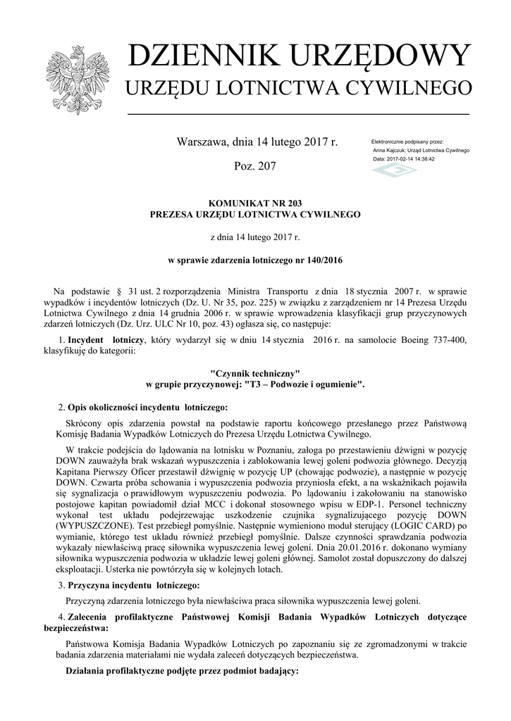 DZIENNIK URZĘDOWY URZĘDU LOTNICTWA CYWILNEGO Warszawa, dnia 14 lutego 2017 r. Elektronicznie podpisany przez: Anna Kajczuk; Urząd Lotnictwa Cywilnego Poz. 207 Data: 2017-02-14 14:38:42 KOMUNIKAT NR 203 PREZESA URZĘDU LOTNICTWA CYWILNEGO z dnia 14 lutego 2017 r. w sprawie zdarzenia lotniczego nr 140/2016 Na podstawie § 31 ust. 2 rozporządzenia Ministra Transportu z dnia 18 stycznia 2007 r. w sprawie wypadków i incydentów lotniczych (Dz. U. Nr 35, poz. 225) w związku z zarządzeniem nr 14 Prezesa Urzędu Lotnictwa Cywilnego z dnia 14 grudnia 2006 r. w sprawie wprowadzenia klasyfikacji grup przyczynowych zdarzeń lotniczych (Dz. Urz. ULC Nr 10, poz. 43) ogłasza się, co następuje: 1. Incydent lotniczy, który wydarzył się w dniu 14 stycznia 2016 r. na samolocie Boeing 737-400, klasyfikuję do kategorii: "Czynnik techniczny" w grupie przyczynowej: "T3 – Podwozie i ogumienie". 2. Opis okoliczności incydentu lotniczego: Skrócony opis zdarzenia powstał na podstawie raportu końcowego przesłanego przez Państwową Komisję Badania Wypadków Lotniczych do Prezesa Urzędu Lotnictwa Cywilnego. W trakcie podejścia do lądowania na lotnisku w Poznaniu, załoga po przestawieniu dźwigni w pozycję DOWN zauważyła brak wskazań wypuszczenia i zablokowania lewej goleni podwozia głównego. Decyzją Kapitana Pierwszy Oficer przestawił dźwignię w pozycję UP (chowając podwozie), a następnie w pozycję DOWN. Czwarta próba schowania i wypuszczenia podwozia przyniosła efekt, a na wskaźnikach pojawiła się sygnalizacja o prawidłowym wypuszczeniu podwozia. Po lądowaniu i zakołowaniu na stanowisko postojowe kapitan powiadomił dział MCC i dokonał stosownego wpisu w EDP-1. Personel techniczny wykonał test układu podejrzewając uszkodzenie czujnika sygnalizującego pozycję DOWN (WYPUSZCZONE). Test przebiegł pomyślnie. Następnie wymieniono moduł sterujący (LOGIC CARD) po wymianie, którego test układu również przebiegł pomyślnie. Dalsze czynności sprawdzania podwozia wykazały niewłaściwą pracę siłownika wypuszczenia lewej goleni. Dnia 20.01.2016 r. dokonano wymiany siłownika wypuszczenia podwozia w układzie lewej goleni głównej. Samolot został dopuszczony do dalszej eksploatacji. Usterka nie powtórzyła się w kolejnych lotach. 3. Przyczyna incydentu lotniczego: Przyczyną zdarzenia lotniczego była niewłaściwa praca siłownika wypuszczenia lewej goleni. 4. Zalecenia profilaktyczne Państwowej Komisji Badania Wypadków Lotniczych dotyczące bezpieczeństwa: Państwowa Komisja Badania Wypadków Lotniczych po zapoznaniu się ze zgromadzonymi w trakcie badania zdarzenia materiałami nie wydała zaleceń dotyczących bezpieczeństwa. Działania profilaktyczne podjęte przez podmiot badający: Dziennik Urzędowy Urzędu Lotnictwa Cywilnego –2– Poz. 207 Personel techniczny wykonał test układu chowania podwozia. Test przebiegł pomyślnie. Wymieniono moduł sterujący (LOGIC CARD), po wymianie którego test układu również przebiegł pomyślnie. Dalsze czynności sprawdzania podwozia wykazały niewłaściwą prace siłownika wypuszczenia lewej goleni. Dnia 20.01.2016 r. dokonano wymiany siłownika wypuszczenia podwozia w układzie lewej goleni głównej. Prezes Urzędu Lotnictwa Cywilnego Piotr Samson