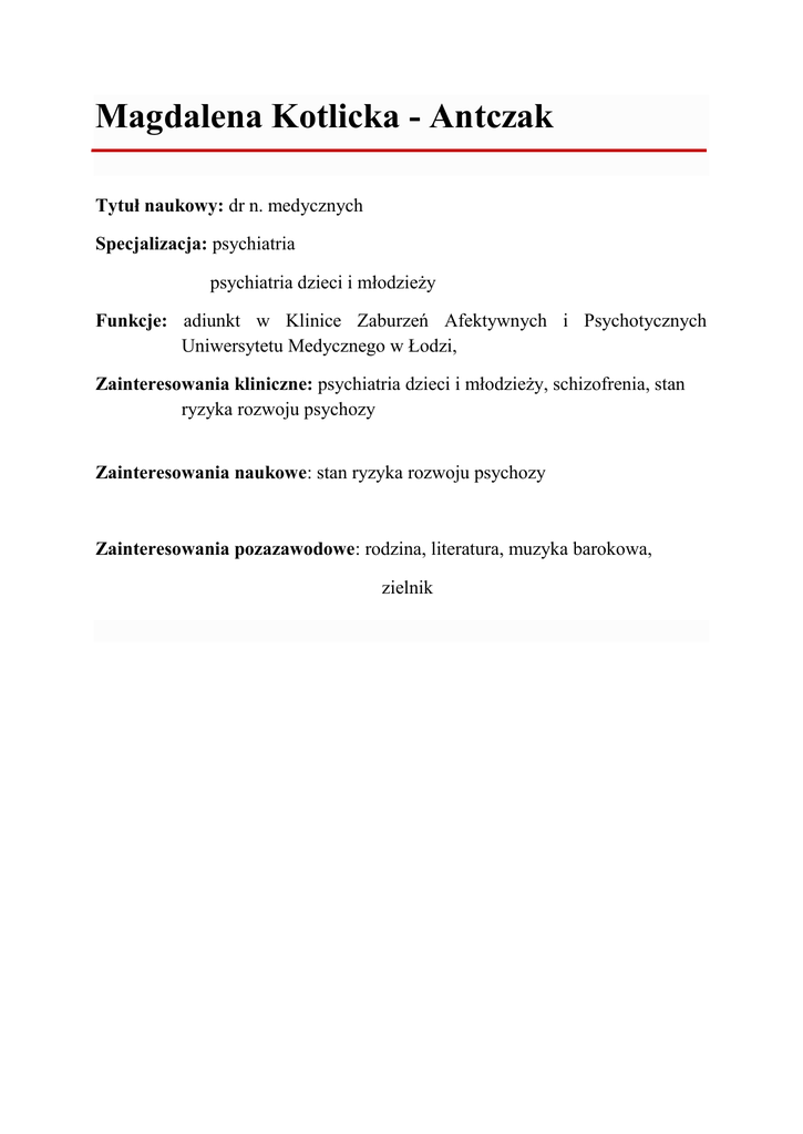 Magdalena Kotlicka - Antczak Tytuł naukowy: dr n. medycznych Specjalizacja: psychiatria psychiatria dzieci i młodzieży Funkcje: adiunkt w Klinice Zaburzeń Afektywnych i Psychotycznych Uniwersytetu Medycznego w Łodzi, Zainteresowania kliniczne: psychiatria dzieci i młodzieży, schizofrenia, stan ryzyka rozwoju psychozy Zainteresowania naukowe: stan ryzyka rozwoju psychozy Zainteresowania pozazawodowe: rodzina, literatura, muzyka barokowa, zielnik