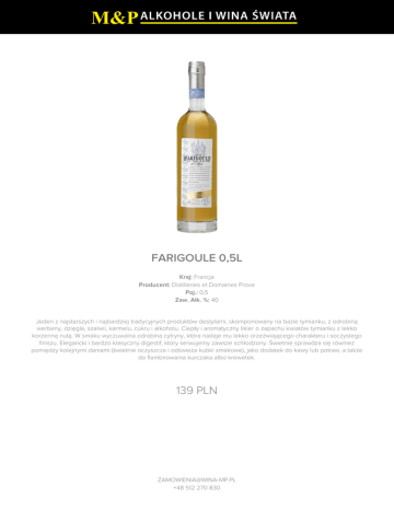 FARIGOULE 0,5L Kraj: Francja Producent: Distilleries et Domaines Prove Poj.: 0,5 Zaw. Alk. %: 40 Jeden z najstarszych i najbardziej tradycyjnych produktów destylarni, skomponowany na bazie tymianku, z odrobiną werbeny, dzięgla, szałwii, karmelu, cukru i alkoholu. Ciepły i aromatyczny likier o zapachu kwiatów tymianku z lekko korzenną nutą. W smaku wyczuwalna odrobina cytryny, która nadaje mu lekko orzeźwiającego charakteru i soczystego finiszu. Elegancki i bardzo klasyczny digestif, który serwujemy zawsze schłodzony. Świetnie sprawdza się również pomiędzy kolejnymi daniami (świetnie oczyszcza i odświeża kubki smakowe), jako dodatek do kawy lub potraw, a także do flambirowania kurczaka albo krewetek. 139 PLN [email protected] +48 512 270 830