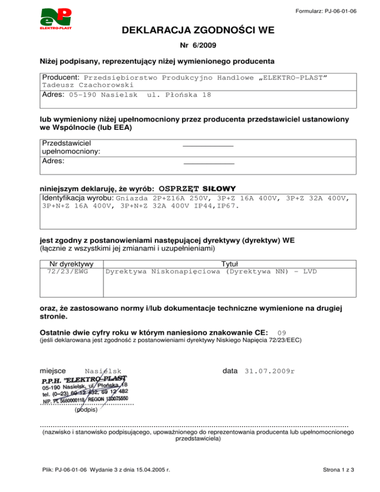 Formularz: PJ-06-01-06 DEKLARACJA ZGODNOŚCI WE Nr 6/2009 Niżej podpisany, reprezentujący niżej wymienionego producenta Producent: Przedsiębiorstwo Produkcyjno Handlowe „ELEKTRO-PLAST” Tadeusz Czachorowski Adres: 05-190 Nasielsk ul. Płońska 18 lub wymieniony niżej upełnomocniony przez producenta przedstawiciel ustanowiony we Wspólnocie (lub EEA) Przedstawiciel upełnomocniony: Adres: ___________ ___________ niniejszym deklaruję, że wyrób: OSPRZĘT SIŁOWY Identyfikacja wyrobu: Gniazda 2P+Z16A 250V, 3P+Z 16A 400V, 3P+Z 32A 400V, 3P+N+Z 16A 400V, 3P+N+Z 32A 400V IP44,IP67. jest zgodny z postanowieniami następującej dyrektywy (dyrektyw) WE (łącznie z wszystkimi jej zmianami i uzupełnieniami) Nr dyrektywy 72/23/EWG Tytuł Dyrektywa Niskonapięciowa (Dyrektywa NN) - LVD oraz, że zastosowano normy i/lub dokumentacje techniczne wymienione na drugiej stronie. Ostatnie dwie cyfry roku w którym naniesiono znakowanie CE: 09 (jeśli deklarowana jest zgodność z postanowieniami dyrektywy Niskiego Napięcia 72/23/EEC) miejsce Nasielsk data 31.07.2009r ............................................ (podpis) ................................................................................................................................................ (nazwisko i stanowisko podpisującego, upoważnionego do reprezentowania producenta lub upełnomocnionego przedstawiciela) Plik: PJ-06-01-06 Wydanie 3 z dnia 15.04.2005 r. Strona 1 z 3 Formularz: PJ-06-01-06 DEKLARACJA ZGODNOŚCI WE Nr 6/2009 Normy i/lub dokumentacje techniczne lub ich części zastosowane do wyrobu, którego dotyczy niniejsza deklaracja zgodności: - normy zharmonizowane: Nr Wydanie PN-EN 60309-1 2002 Tytuł Część*) Gniazda wtyczkowe i wtyczki do instalacji przemysłowych. - inne normy i/lub dokumentacje techniczne: Nr Wydanie Tytuł Inne dokumenty nie występują Część*) - inne rozwiązania techniczne, szczegóły, które zostały włączone do dokumentacji technicznej lub konstrukcyjnej: Gniazdo siłowe przenośne 16A 4p IP 44 nr.kat. 03351 Gniazdo siłowe przenośne 16A 5p IP 44 nr.kat. 03353 Gniazdo siłowe przenośne 32A 4p IP 44 nr.kat. 03355 Gniazdo siłowe przenośne 32A 5p IP 44 nr.kat. 03357 Gniazdo siłowe przenośne 63A 5p IP 67 nr.kat. 03359 Gniazdo siłowe stałe 16A 4p IP 44 nr.kat. 033511 Gniazdo siłowe stałe 16A 5p IP 44 nr.kat.033531 Gniazdo siłowe stałe 32A 4p IP 44 nr.kat. 033551 Gniazdo siłowe stałe 32A 5p IP 44 nr.kat. 033571 Gniazdo siłowe stałe 63A 5p IP 67 nr.kat. 033591 Wtyka siłowa 16A 4p IP 44 nr.kat. 03371 Wtyka siłowa 16A 5p IP 44 nr.kat. 03373 Wtyka siłowa 32A 4p IP 44 nr.kat. 03375 Wtyka siłowa 32A 5p IP 44 nr.kat. 03377 Wtyka siłowa 63A 5p IP 67 nr.kat. 03379 Gniazdo 2P+Z 16A 250V IP44 nr.kat.6041-00 Gniazdo 2P+Z 16A 250V IP67 nr.kat.6041-10 Gniazdo 2P+Z 16A 250V „schuko” IP44 nr.kat.6040-00 Gniazdo 3P+Z 16A 400V IP44 nr.kat.6050-00 Plik: PJ-06-01-06 Wydanie 3 z dnia 15.04.2005 r. Strona 2 z 3 Formularz: PJ-06-01-06 DEKLARACJA ZGODNOŚCI WE Gniazdo 3P+Z 16A 400V IP67 nr.kat.6050-10 Gniazdo 3P+N+Z 16A 400V IP44 nr.kat.6051-00 Gniazdo 3P+N+Z 16A 400V IP67 nr.kat.6051-10 Gniazdo 3P+Z 32A 400V IP44 nr.kat.6052-00 Gniazdo 3P+Z 32A 400V IP67 nr.kat.6052-10 Gniazdo 3P+N+Z 32A 400V IP44 nr.kat.6053-00 Gniazdo 3P+N+Z 32A 400V IP67 nr.kat.6053-10 Inne dokumenty lub informacje wymagane właściwą dyrektywą (dyrektywami) WE: Inne dokumenty nie występują Plik: PJ-06-01-06 Wydanie 3 z dnia 15.04.2005 r. Strona 3 z 3