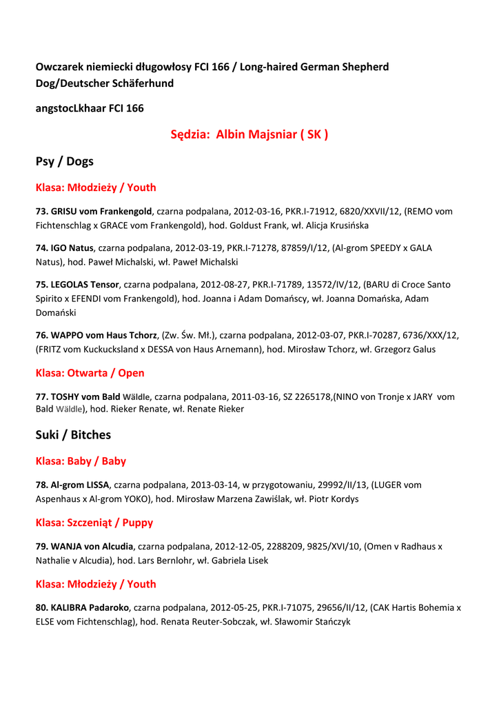 Owczarek niemiecki długowłosy FCI 166 / Long-haired German Shepherd Dog/Deutscher Schäferhund angstocLkhaar FCI 166 Sędzia: Albin Majsniar ( SK ) Psy / Dogs Klasa: Młodzieży / Youth 73. GRISU vom Frankengold, czarna podpalana, 2012-03-16, PKR.I-71912, 6820/XXVII/12, (REMO vom Fichtenschlag x GRACE vom Frankengold), hod. Goldust Frank, wł. Alicja Krusińska 74. IGO Natus, czarna podpalana, 2012-03-19, PKR.I-71278, 87859/I/12, (Al-grom SPEEDY x GALA Natus), hod. Paweł Michalski, wł. Paweł Michalski 75. LEGOLAS Tensor, czarna podpalana, 2012-08-27, PKR.I-71789, 13572/IV/12, (BARU di Croce Santo Spirito x EFENDI vom Frankengold), hod. Joanna i Adam Domańscy, wł. Joanna Domańska, Adam Domański 76. WAPPO vom Haus Tchorz, (Zw. Św. Mł.), czarna podpalana, 2012-03-07, PKR.I-70287, 6736/XXX/12, (FRITZ vom Kuckucksland x DESSA von Haus Arnemann), hod. Mirosław Tchorz, wł. Grzegorz Galus Klasa: Otwarta / Open 77. TOSHY vom Bald Wäldle, czarna podpalana, 2011-03-16, SZ 2265178,(NINO von Tronje x JARY vom Bald Wäldle), hod. Rieker Renate, wł. Renate Rieker Suki / Bitches Klasa: Baby / Baby 78. Al-grom LISSA, czarna podpalana, 2013-03-14, w przygotowaniu, 29992/II/13, (LUGER vom Aspenhaus x Al-grom YOKO), hod. Mirosław Marzena Zawiślak, wł. Piotr Kordys Klasa: Szczeniąt / Puppy 79. WANJA von Alcudia, czarna podpalana, 2012-12-05, 2288209, 9825/XVI/10, (Omen v Radhaus x Nathalie v Alcudia), hod. Lars Bernlohr, wł. Gabriela Lisek Klasa: Młodzieży / Youth 80. KALIBRA Padaroko, czarna podpalana, 2012-05-25, PKR.I-71075, 29656/II/12, (CAK Hartis Bohemia x ELSE vom Fichtenschlag), hod. Renata Reuter-Sobczak, wł. Sławomir Stańczyk Klasa: Pośrednia / Intermediate 81. AKIRA von der Plassenburg, czarna podpalana, 2011-07-21, SZ 2269391,(LENNOX von Regina Pacis x OXANA von der Plassenburg), hod. Wol Hassgal, wł. Wolfgang Hassgal 82. ANDREA vom Fichtenschlag-Zwinger, (MłCHPL, Word Winner 2013;BOS 2013), czarna podpalana, 2011-10-23, PKR.I-70119, 11475/V/11, (YOYO zur Worringer Rheinaue x RONDA vom Fichtenschlag), hod. Evelyne Ossmann, wł. Monika Pustelnik Klasa: Otwarta / Open 83. CORI od Szarika (FCI), czarna podpalana, 2010-06-28, PKR.I-68279, 2770/XXXIII/10, (GHANDI Guapass x PALOMA z Niewiadomskiej Doliny), hod. Adam Gajos, wł. Grzegorz Klocek 84. SUNSHINE vom Frankengold, czarna podpalana, 2011-01-16, PKR.I-72091, 88598/I/11, (VEGAS du Haut Mansard x PIPPI vom Frankengold), hod. Frank Goldust, wł. Ewa Śmigielska Owczarek niemiecki o włosie normalnym FCI 166 / Short-haired German Shepherd Dog/Deutscher Schäferhund Stockhaar FCI 166 Psy / Dogs Klasa: Szczeniąt / Puppy 85. BASCO La Herradura de Suerte, czarna podpalana, 2012-08-14, w przygotowaniu, 29999/II/12, (DEMETRI Temperton x GATTACA Temperton), hod. Anna Pacyna, Krzysztof Siedlik, wł. Krzysztof Łukawski Klasa: Młodzieży / Youth 86. BONO La Herradura de Suerte, czarna podpalana, 2012-08-14, w przygotowaniu, 29960/II/12, (DEMETRI Temperton x GATTACA Temperton), hod. Anna Pacyna, Krzysztof Siedlik, wł. Renata Wijas 87. CORSO Ontopus, czarna podpalana, 2012-03-17, PKR.I-71078, 29650/II/12, (NAZIR ze Skalnego Wzgórza x BOOGIE Ontopus), hod. Robert Rubacha, wł. Krzysztof Mastaj 88. FALKO Wawelno, czarna podpalana, 2012-01-14, PKR.I-70316, 14488/XV/12, (CARLOS vom Radhaus x GEJSZA Wawelno), hod. Bernard Nowotny, wł. Bernard Famuła 89. MESSI Tensor, czarna podpalana, 2012-04-28, PKR.I-71103, 13517/IV/12, (Cobra d"Ulmental x Unique Tensor), hod. Joanna Adam Domanscy, wł. Darek Szoblik Klasa: Pośrednia / Intermediate 90. ENZO Wolf-Max, czarna podpalana, 2011-10-06, PKR.I-71179, 29695/II/11, (RIKO Animar x BETTI Animar), hod. Piotr Studziński, wł. Janusz Starzec 91. HIRO Śmiłowickie Wilki, czarna podpalana, 2011-08-25, PKR.I-69506, 13397/IV/11, (HOMAR dei Colli di Uzzano x ANUSHKA Śmiłowickie Wilki), hod. Renata Horzela, wł. Renata I Piotr Horzela 92. LORD z Sahary, czarna podpalana, 2011-10-25, PKR.I-69840, 46919/VIII/11, (URBO vom Leithawald x HANIA z Sahary), hod. Artur Śliczny, wł. Mirosław Brykalski 93. NORTON Tensor, czarna podpalana, 2011-06-24, PKR.I-68647, 13316/IV/11, (SCHICCO v.d.Freiheit Westerholt x UNGANA Tensor), hod. J.i A. Domańscy, wł. Paweł Błoński, Joanna i Adam Domańscy 94. USHER zur Worringer Rheinaue, czarna podpalana, 2011-09-04, SZ 2275862,(NINO von tronje x FIGLIA zur Worringer Rheinaue), hod. Bruno Itter, wł. Darek Więckowski 95. WOBO Thunder-Poland, czarna podpalana, 2012-03-01, PKR.I-70303, 11778/V/12, (FURBO vd. Kleinen Ranch x MłChPl, ChPl JOVI Thunder-Poland), hod. Tomasz Pazdan, wł. Tomasz Pazdan Klasa: Otwarta / Open 96. AZIR Jarkowski Dwór (FCI), czarna podpalana, 2011-09-12, PKR.I-69833, 39418/II/11, (URBO vom Leithawald x ZENA von der Sandsteinkuste), hod. Jarosław Opozda, wł. Dorota Niemiec 97. DUX Pajęcze Sieci, czarna podpalana, 2010-09-18, PKR.I-67713, 28897/II/10, (ULTIMMO Avax Hof x ROMY z Hamandy), hod. Krzysztof Mirek, wł. Krzysztof Mirek Klasa: Użytkowa / Working 98. DARK Sądeckie Lachy, (IPO-1), czarna podpalana, 2009-05-14, PKR.I-64382, 13763/XV/09, (DRUG vom Zellwaldrand x Bakai-Bátor QUINNIE), hod. Andrzej Woda, wł. Bernard Famuła 99. FOKUS vom ST.- Michaels-Berg, czarna podpalana, 2010-10-10, PKR.I-70784, 3008/XXXIII/10, (REMO vom Fichtenschlag x Hirka vom St.-Michaels-Berg), hod. Andrzej Woda, wł. Andrzej Woda 100. HARRY von der Glockenheide, czarna podpalana, 2010-07-20, PKR.I-61167, 28786/II/10, (AREX von der Wilhelmswarte x von Trafalga), hod. Sigrit Becker, wł. Robert Rubacha 101. JIM von der Sudheimer Linde, czarna podpalana, 2011-03-12, 2265273,(Conbhairean Uno x GINIE von der Sudheim Linde), hod. Ingrid Budde, wł. Mirosław Tchorz Klasa: Weteranów / Veteran 102. XAVAIR vom Christinen Brunnen, (IPO 2 Kkl1 MŁ.CH.PL), czarna podpalana, 2005-06-02, PKR.I56843, 25475/II/05, (NICOS vom Leithawald x SUSSANE vom Christinen Brunnen), hod. Susanne Schomann, wł. Jarosław Opozda Suki / Bitches Klasa: Baby / Baby 103. Al-grom JULKA, 