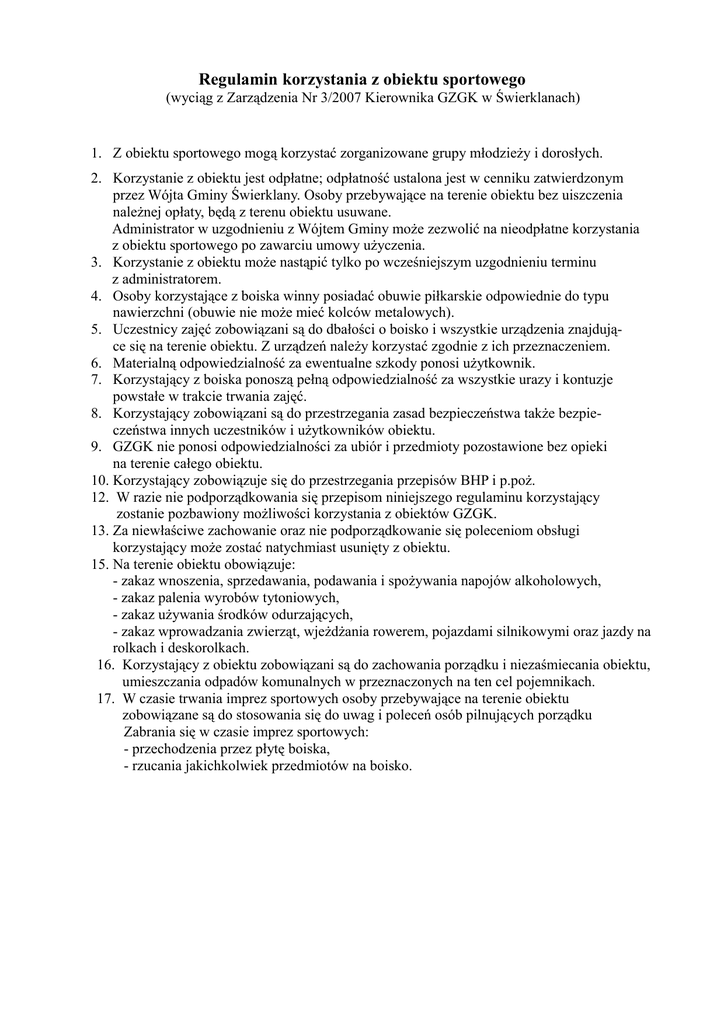 Regulamin korzystania z obiektu sportowego (wyciąg z Zarządzenia Nr 3/2007 Kierownika GZGK w Świerklanach) 1. Z obiektu sportowego mogą korzystać zorganizowane grupy młodzieży i dorosłych. 2. Korzystanie z obiektu jest odpłatne; odpłatność ustalona jest w cenniku zatwierdzonym przez Wójta Gminy Świerklany. Osoby przebywające na terenie obiektu bez uiszczenia należnej opłaty, będą z terenu obiektu usuwane. Administrator w uzgodnieniu z Wójtem Gminy może zezwolić na nieodpłatne korzystania z obiektu sportowego po zawarciu umowy użyczenia. 3. Korzystanie z obiektu może nastąpić tylko po wcześniejszym uzgodnieniu terminu z administratorem. 4. Osoby korzystające z boiska winny posiadać obuwie piłkarskie odpowiednie do typu nawierzchni (obuwie nie może mieć kolców metalowych). 5. Uczestnicy zajęć zobowiązani są do dbałości o boisko i wszystkie urządzenia znajdujące się na terenie obiektu. Z urządzeń należy korzystać zgodnie z ich przeznaczeniem. 6. Materialną odpowiedzialność za ewentualne szkody ponosi użytkownik. 7. Korzystający z boiska ponoszą pełną odpowiedzialność za wszystkie urazy i kontuzje powstałe w trakcie trwania zajęć. 8. Korzystający zobowiązani są do przestrzegania zasad bezpieczeństwa także bezpieczeństwa innych uczestników i użytkowników obiektu. 9. GZGK nie ponosi odpowiedzialności za ubiór i przedmioty pozostawione bez opieki na terenie całego obiektu. 10. Korzystający zobowiązuje się do przestrzegania przepisów BHP i p.poż. 12. W razie nie podporządkowania się przepisom niniejszego regulaminu korzystający zostanie pozbawiony możliwości korzystania z obiektów GZGK. 13. Za niewłaściwe zachowanie oraz nie podporządkowanie się poleceniom obsługi korzystający może zostać natychmiast usunięty z obiektu. 15. Na terenie obiektu obowiązuje: - zakaz wnoszenia, sprzedawania, podawania i spożywania napojów alkoholowych, - zakaz palenia wyrobów tytoniowych, - zakaz używania środków odurzających, - zakaz wprowadzania zwierząt, wjeżdżania rowerem, pojazdami silnikowymi oraz jazdy na rolkach i deskorolkach. 16. Korzystający z obiektu zobowiązani są do zachowania porządku i niezaśmiecania obiektu, umieszczania odpadów komunalnych w przeznaczonych na ten cel pojemnikach. 17. W czasie trwania imprez sportowych osoby przebywające na terenie obiektu zobowiązane są do stosowania się do uwag i poleceń osób pilnujących porządku Zabrania się w czasie imprez sportowych: - przechodzenia przez płytę boiska, - rzucania jakichkolwiek przedmiotów na boisko.