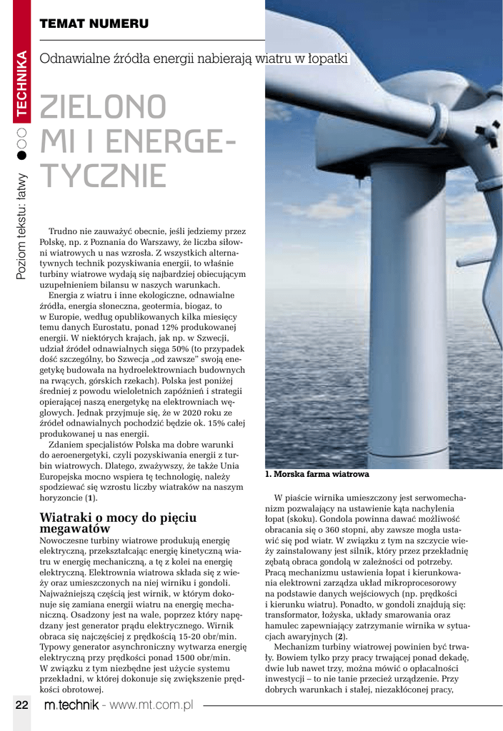 Poziom tekstu: łatwy TECHNIKA TEMAT NUMERU Odnawialne źródła energii nabierają wiatru w łopatki ZIELONO MI I ENERGETYCZNIE Trudno nie zauważyć obecnie, jeśli jedziemy przez Polskę, np. z Poznania do Warszawy, że liczba siłowni wiatrowych u nas wzrosła. Z wszystkich alternatywnych technik pozyskiwania energii, to właśnie turbiny wiatrowe wydają się najbardziej obiecującym uzupełnieniem bilansu w naszych warunkach. Energia z wiatru i inne ekologiczne, odnawialne źródła, energia słoneczna, geotermia, biogaz, to w Europie, według opublikowanych kilka miesięcy temu danych Eurostatu, ponad 12% produkowanej energii. W niektórych krajach, jak np. w Szwecji, udział źródeł odnawialnych sięga 50% (to przypadek dość szczególny, bo Szwecja „od zawsze” swoją enegetykę budowała na hydroelektrowniach budownych na rwących, górskich rzekach). Polska jest poniżej średniej z powodu wieloletnich zapóźnień i strategii opierającej naszą energetykę na elektrowniach węglowych. Jednak przyjmuje się, że w 2020 roku ze źródeł odnawialnych pochodzić będzie ok. 15% całej produkowanej u nas energii. Zdaniem specjalistów Polska ma dobre warunki do aeroenergetyki, czyli pozyskiwania energii z turbin wiatrowych. Dlatego, zważywszy, że także Unia Europejska mocno wspiera tę technologię, należy spodziewać się wzrostu liczby wiatraków na naszym horyzoncie (1). Wiatraki o mocy do pięciu megawatów Nowoczesne turbiny wiatrowe produkują energię elektryczną, przekształcając energię kinetyczną wiatru w energię mechaniczną, a tę z kolei na energię elektryczną. Elektrownia wiatrowa składa się z wieży oraz umieszczonych na niej wirniku i gondoli. Najważniejszą częścią jest wirnik, w którym dokonuje się zamiana energii wiatru na energię mechaniczną. Osadzony jest na wale, poprzez który napędzany jest generator prądu elektrycznego. Wirnik obraca się najczęściej z prędkością 15-20 obr/min. Typowy generator asynchroniczny wytwarza energię elektryczną przy prędkości ponad 1500 obr/min. W związku z tym niezbędne jest użycie systemu przekładni, w której dokonuje się zwiększenie prędkości obrotowej. 22 m.technik - www.mt.com.pl 1. Morska farma wiatrowa W piaście wirnika umieszczony jest serwomechanizm pozwalający na ustawienie kąta nachylenia łopat (skoku). Gondola powinna dawać możliwość obracania się o 360 stopni, aby zawsze mogła ustawić się pod wiatr. W związku z tym na szczycie wieży zainstalowany jest silnik, który przez przekładnię zębatą obraca gondolą w zależności od potrzeby. Pracą mechanizmu ustawienia łopat i kierunkowania elektrowni zarządza układ mikroprocesorowy na podstawie danych wejściowych (np. prędkości i kierunku wiatru). Ponadto, w gondoli znajdują się: transformator, łożyska, układy smarowania oraz hamulec zapewniający zatrzymanie wirnika w sytuacjach awaryjnych (2). Mechanizm turbiny wiatrowej powinien być trwały. Bowiem tylko przy pracy trwającej ponad dekadę, dwie lub nawet trzy, można mówić o opłacalności inwestycji – to nie tanie przecież urządzenie. Przy dobrych warunkach i stałej, niezakłóconej pracy, Zielone technologie 2. Wnętrze turbiny wiatrowej – schemat 23 TECHNIKA TEMAT NUMERU falownik Poziom tekstu: łatwy akumulator sterownik 3. Przydomowa elektrownia wiatrowa turbina może zaspokoić nawet 100% zapotrzebowania na energię elektryczną np. gospodarstwa rolnego (3). Im dłuższe są łopatki turbiny, tym większa siła wiatru naciska na nie i więcej energii elektrycznej powstaje. Teoretycznie można by zbudować nieskończenie długie łopatki, jednak problemem jest ich masa i elastyczność, która w połączeniu z mocą silnych wiatrów może je wygiąć lub nawet zniszczyć. Dlatego najnowsze rozwiązania, takie jak oferuje na przykład General Electric, proponują łopatki wygięte jak łuk, zakrzywione do tyłu o około 2,5 metra. Stojąca w irlandzkiej zatoce Arklow Bay, zbudowana przez GE, turbina ma gondole na wysokości 74 metrów, średnicę wirowania łopatek – 104 metry i generować może 3,6 MW energii elektrycznej (4). Projektuje się już większą konstrukcję, o mocy 5 MW i średnicy łopat 126 metrów. Rozwój wietrznej energetyki to nie tylko rekordy rozmiarów, ale również śmiałe projekty komponujące turbiny w krajobraz i inne konstrukcje. Prawie 40 milionów kilowatogodzin energii rocznie ma produkować wiadukt „Solar Wind” (5), zaprojektowany przez włoskich konstruktorów, Francesco Colarossiego, Giovannę Saracino i Luisę Saracino. Pomiędzy podporami mostu jest miejsce na 26 turbin wiatrowych dostarczających energii. Droga na górze ma być wyposażona w panele słoneczne dające dodatkową energię. Oczywiście, gdy ktoś postawił na energetykę wiatrową, nierozsądne jest całkowite odłączanie się od 4. Turbina Arklow Bay w Irlandii 24 m.technik - www.mt.com.pl krajowej sieci energetycznej, bowiem nawet w najbardziej wietrznej okolicy wiatr czasem nie wieje. Przełączenie się na sieć ogólną to jedno rozwiązanie, inne to oferowane przez producentów akumulatory połączone również z systemem fotoogniw. Fotowoltaika pożądana, ale wciąż mało sprawna I tak gładko przeszliśmy do kolejnej technologii odnawialnej – energii słonecznej. Pomijając, że akurat nasz kraj nie jest słonecznym eldorado, od wielu lat, od całych dekad właściwie, z instalacjami fotowoltaicznymi jest wciąż ten sam problem – słaba wydajność. Pojawiają się wprawdzie wciąż doniesienia o znacznych postępach w tej dziedzinie, takie jak te o firmie Sharp, której udało się uzyskać wydajność ogniw słonecznych na poziomie 43,5%. Udało się tego dokonać dzięki wyposażeniu paneli w soczewki Fresnela skupiające światło trafiające na panel. Jednak na razie ta technologia, jeśli zostanie wprowadzona do użycia, to tylko do zastosowań profesjonalnych, na przykład do paneli słonecznych z