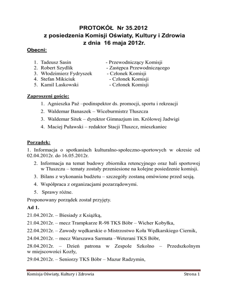 PROTOKÓŁ Nr 35.2012 z posiedzenia Komisji Oświaty, Kultury i Zdrowia z dnia 16 maja 2012r. Obecni: 1. 2. 3. 4. 5. Tadeusz Sasin Robert Szydlik Włodzimierz Fydryszek Stefan Mikiciuk Kamil Laskowski - Przewodniczący Komisji - Zastępca Przewodniczącego - Członek Komisji - Członek Komisji - Członek Komisji Zaproszeni goście: 1. Agnieszka Paź –podinspektor ds. promocji, sportu i rekreacji 2. Waldemar Banaszek – Wiceburmistrz Tłuszcza 3. Waldemar Sitek – dyrektor Gimnazjum im. Królowej Jadwigi 4. Maciej Puławski – redaktor Stacji Tłuszcz, mieszkaniec Porządek: 1. Informacja o spotkaniach kulturalno-społeczno-sportowych w okresie od 02.04.2012r. do 16.05.2012r. 2. Informacja na temat budowy zbiornika retencyjnego oraz hali sportowej w Tłuszczu – tematy zostały przeniesione na kolejne posiedzenie komisji. 3. Bilans z wykonania budżetu – szczegóły zostaną omówione przed sesją. 4. Współpraca z organizacjami pozarządowymi. 5. Sprawy różne. Proponowany porządek został przyjęty. Ad 1. 21.04.2012r. – Biesiady z Książką, 21.04.2012r. – mecz Trampkarze R-98 TKS Bóbr – Wicher Kobyłka, 22.04.2012r. – Zawody wędkarskie o Mistrzostwo Koła Wędkarskiego Ciernik, 24.04.2012r. – mecz Warszawa Sarmata –Weterani TKS Bóbr, 28.04.2012r. – Dzień patrona w Zespole Szkolno – Przedszkolnym w miejscowości Kozły, 29.04.2012r. – Seniorzy TKS Bóbr – Mazur Radzymin, Komisja Oświaty, Kultury i Zdrowia Strona 1 03.05.2012r. – Obchody święta Konstytucji 3 Maja, 03.05.2012r. – Zawody Wędkarskie Koła Ciernik o Puchar P. Dzięcioła, 05.05.2012r. – mecz Trampkarze R-98 TKS Bóbr – Świt Nowy Dwór Mazowiecki, 07.05.2012r. – zebranie Terenowego Koła Pszczelarzy, 08.05.2012r. – zebranie Komitetu Organizacyjnego Drogi Żelaznej Warszawa – Petersburg, Obchodów 150 – lecia 11.05.2012r. – mecz Weterani TKS Bóbr – Aromes Warszawa, 12.05.2012r. – mecz Seniorzy TKS Bóbr – Józefovia, 12.05.2012r. – mecz Trampkarze R-98 TKS Bóbr – UKS Białe Orły Warszawa. Uczestnictwo w rozgrywkach Ligi Bobra. Przewodniczący Komisji Pan Tadeusz Sasin podziękował radnemu Robertowi Szydlikowi za przygotowanie programu artystycznego z okazji Obchodów 221 rocznicy Uchwalenia Konstytucji 3 Maja. Radny Robert Szydlik wyjaśnił, iż były to obowiązki służbowe. Ad 3. Przewodniczący Komisji Oświaty, Kultury i Zdrowia Pan Tadeusz Sasin poinformował, iż materiały dotyczące bilansu z wykonania budżetu za 2011rok zostaną omówione na przyszłych posiedzeniach komisji. W chwili obecnej radny Sasin poprosił o zabranie głosu radnych którzy uczestniczą w posiedzeniach Komisji Budżetu i Inwestycji, aby wypowiedzieli się, czy mają do przełożonych dokumentów odnośnie wykonania zeszłorocznego budżetu jakieś uwagi. Radny Włodzimierz Fydryszek poinformował, iż na chwilę obecną to głównie należy zwrócić uwagę na duże zaległości podatkowe, które nie są regulowane. Na chwilę obecną Komisja Budżetu i Inwestycji nie ustosunkowała się jeszcze do dokumentacji, którą radni otrzymali. Radny Robert Szydlik również poinformował, że Komisja Rewizyjna szczegółowo zajmie się omówieniem materiałów. Radny Tadeusz Sasin zwrócił się do radnych Komisji Oświaty, Kultury i Zdrowia, aby szczególna uwagę zwrócili na wydatki związane na kulturę sport, zdrowiem chodzi o CKSiR. Ad 4. Sprawozdanie z realizacji Programu Współpracy Gminy Tłuszcz z organizacjami pozarządowymi oraz podmiotami określonymi w art. 3 ust. 3 ustawy o działalności pożytku publicznego i wolontariacie za rok 2011 – załącznik nr 1 do niniejszego protokołu. Komisja Oświaty, Kultury i Zdrowia Strona 2 Radny Tadeusz Sasin zwrócił się do radnych, aby ustosunkowali się do ww. sprawozdania. Przewodniczący Komisji przyjmuje to sprawozdanie, ale wnosi, aby minimum w pierwszym kwartale każdego roku konkurs był ogłaszany i rozstrzygany, aby utrzymać bieżącą działalność stowarzyszeń i innych pozarządowych organizacji. Radny Szydlik Robert wspomniał, iż w ubiegłych latach funkcjonowało finansowanie wyprzedzające dla organizacji i zapytał, czy również obecnie byłoby taka możliwość wsparcia? Radny Sasin w odpowiedzi poinformował, iż w chwili obecnej zmieniły się przepisy, Ministerstwo Pracy i Polityki Społecznej zmieniło zarządzenie i nie jest to możliwe. Radny Włodzimierz Fydryszek zwrócił się do wiceburmistrza Waldemara Banaszka z pytaniem co dalej w sprawie dotacji dla Klubu TKS Bóbr, i czy powodem nieprzyznania dotacji był brak jednego podpisu na złożonej ofercie? Wiceburmistrz Banaszek stwierdził, że był źle wypełniony wniosek i, że jest protokół w którym jest napisane dlaczego środki nie zostały przyznane dla TKS BÓBR, można się z nim zapoznać. Pan Fydryszek kontynuując zapytał, czy oznacza to, że powodem nieprzyznania dotacji był brak jednego podpisu i, czy przez dwa miesiące nie było możliwości uzupełnienia tego jednego podpisu? Pan Banaszek poinformował, że nie było takiej możliwości. Radny Włodzimierz Fydryszek po usłyszeniu odpowiedzi podkreślił, że komisja konkursowa stwierdziła brak jednego podpisu i w związku z tym wniosek został odrzucony, i przez 2 miesiące nie było szansy uzupełnienia. Wiceburmistrz Banaszek – nie tylko oferta TKS Bóbr została odrzucona. Będzie ogłoszony drugi konkurs i Klub może złożyć pełną ofertę, aby uzyskać dotację. Radny Fydryszek stwierdził, że wszystko się zgadza, ale jego zdaniem jest jedna zasada, inne stowarzyszenia działają na innych płaszczyznach, a w TKS BÓBR powstają zobowiązania finansowe już od 1 stycznia każdego roku. Biorąc pod uwagę jakieś inne stowarzyszenia i ich działalność (organizacja jednodniowego pikniku lub imprezy) to nie można tego typu działalności porównać z działalnością Klubu. Bobry działają cały rok, zatrudniani są trenerzy oraz nabywane są usługi tr