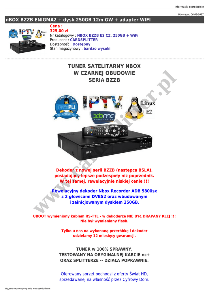 Informacje o produkcie Utworzono 06-03-2017 nBOX BZZB ENIGMA2 + dysk 250GB 12m GW + adapter WIFI Cena : 325,00 zł ar d sp lit te r TUNER SATELITARNY NBOX W CZARNEJ OBUDOWIE SERIA BZZB .p l Nr katalogowy : NBOX BZZB E2 CZ. 250GB + WiFi Producent : CARDSPLITTER Dostępność : Dostępny Stan magazynowy : bardzo wysoki w .c Dekoder z nowej serii BZZB (następca BSLA), posiadający lepsze podzespoły niż poprzednik. W tej samej, rewelacyjnie niskiej cenie !!! w w Rewelacyjny dekoder Nbox Recorder ADB 5800sx z 2 głowicami DVBS2 oraz wbudowanym i zainicjowanym dyskiem 250GB. UBOOT wymieniony kablem RS-TTL - w dekoderze NIE BYŁ DRAPANY KLEJ !!! Nie był wymieniany flash. Tylko u nas na wykonaną przeróbkę i dekoder udzielamy 12 miesięcy gwarancji. TUNER w 100% SPRAWNY, TESTOWANY NA ORYGINALNEJ KARCIE nc+ ORAZ SPLITTERZE -- DZIAŁA POPRAWNIE. Oferowany sprzęt pochodzi z oferty Świat HD, sprzedawanej na własność przez Cyfrowy Dom. Wygenerowano w programie www.oscGold.com Dekodery są odnowione i sprzedawane z gwarancją 12 miesięcy na własność. W każdym tunerze standardowo zostały wymienione kondensatory na zasilaczu i głowicy. sp lit te r .p l Dekoder posiada lepszy wyświetlacz niż ten z serii BSKA, ma podwójną głowicę, lepszą jakość oraz wbudowany i zainicjowany dysk 250GB, dzięki czemu dekoder zyskuje funkcje PVR i Timeshift. TUNER POSIADA DYSK 250GB. Na panelu przednim tunera logo "N" lub "NC+". ar d Na obudowie mogą znajdować się mało widoczne ślady użytkowania. w .c Zobacz tuner w 3D w w Gratis adapter WiFi firmy ABCOM (dedykowany do dekoderów CRYPTOBOX) sp lit te r .p l Informacje o produkcie Specyfikacja adaptera WiFi: ● ● ● Bezprzewodowe połączenie z odbiornika z sieci LAN Prędkość 150 Mbps, częstotliwości 2,4 GHz Standard IEEE 802.11 b/g/n Antena do poprawy odbioru słabego sygnału ar d ● Zestaw zawiera: ● ● w w ● Tuner satelitarny Nbox 5800 BZZB z dyskiem 250GB NOWY Zasilacz NOWY Pilot NC+ (tzw. "grubasek") Adapter WiFi w .c ● ENIGMA JEST WGRANA DO PAMIĘCI NAND, CZYLI WEJŚCIE USB MAMY WOLNE, A CO ZA TYM IDZIE, MOŻNA PODŁĄCZYĆ PENDRIVE, KARTĘ WIFI LUB TUNER TELEWIZJI NAZIEMNEJ DVB-T. Wygenerowano w programie www.oscGold.com Tunery pochodzą z serwisu NC+ i są przez ten serwis odnowione. Jednak sporadycznie mogą posiadać delikatne, praktycznie nie zauważalne ślady użytkowania. sp lit te r .p l DEKODER ZOSTAŁ PRZEPROGRAMOWANY BEZINWAZYJNIE, WIĘC MA ORYGINALNĄ PAMIĘĆ FST. Enigma2_OpenPLI v.8.6.0 NAND: ● ● ● ● ● w .c ● DMnapi, Dream-Explorer, EPGRefresh, IPTV Player, dj crash settings downloader, Open Webif (dzięki temu pluginowi nbox zamienia się w domowe centrum rozrywki), InfinityHD Controler ar d ● Tuner dzięki zainstalowanym systemom operacyjnym i dodatkowym wtyczkom staje się DOMOWYM MULTIMEDIALNYM CENTRUM ROZRYWKI. ● ● ● ● ● ● ● ● ● ● w w Mamy wiele możliwości: odtwarzanie plików video poprzez złącze USB ( filmy DiViX ,MKV , AVI , muzyka MP3, przeglądanie zdjęć), nagrywanie na wbudowany dysk HDD 250GB lub na pendrive poprzez złącze USB, możliwość odczytu nagranych audycji na komputerze, radio internetowe, podgląd online wyników większości lig piłki nożnej, funkcja przesunięcia w czasie tzw. timeshift oraz możliwość nagrywania i odtwarzania oglądanych audycji, nagrywanie z EPG i Timera oraz w standby, 2 głowice DVBS2 pozwalają na jednoczesne oglądanie jednej audycji i nagrywanie innej na dysk dekodera, dowolna edycja list kanałów zarówno za pomocą pilota jak i programem Dreambox Edit ( po sieci LAN lub wifi ), ilość kanałów bez ograniczeń, komunikacja sieciowa LAN oraz wifi ( wymaga karty wifi podpinanej na USB chipset RT3070, RT5370 ), Informacje o produkcie ● ● ● ● ● ● ● ● ● ● czytnik kart uniwersalny i wielosystemowy - akceptuje każdą kartę kodową nieparowaną systemowo, np. Cyfra+ , TNK SD , SMART HD , karty erotyczne... możliwość sparowania karty kodowanej w systemie np. conax , nagravision, szybka zmiana wyglądu menu dekodera za pomocą pluginów ( skórek ), nieograniczona ilość aplikacji dostępnych po sieci internetowej w menu dekodera w dziale pluginy, możliwość oglądania kanału TV na komputerze tzw. "streaming" (można poprzez router skonfigurować sobie własne stacje tv do oglądania w pracy), wbudowana karta sieciowa, a po podłączeniu karty na usb możliwość używania sieci bezprzewodowej, ściąganie napisów do oglądanych filmów, możliwość odtwarzania filmów znajdujących się na innym komputerze za pomocą sieci LAN lub wifi, samodzielne ustalanie prędkości obrotu wentylatora z poziomu menu dekodera, wyświetlacz VFD pokazuje nazwę oglądanego kanału, rewelacyjna jakość obrazu oglądanych kanałów zarówno HD jak i SD oraz menu OSD dekodera, ● ● ● ● ● podłączamy pendrive z oprogramowaniem, naciskamy przycisk zasilania na panelu przednim dekodera i trzymamy wciśnięty, włączamy dekoder do prądu, na wyświetlaczu pojawi się napis "PROG", wtedy puszczamy przycisk, na koniec wgrywania pojawi się napis "OK", odpinamy pendrive i resetujemy dekoder zasilaniem. ar d ● sp lit te r Aktualizacja oprogramowania poprzez USB w sposób bardzo intuicyjny i prosty: .p l ● w w w .c Wpisując IP nboxa w przeglądarkę sterujesz nim i oglądasz programy na swoim komputerze, Ipad lub smartfonie. Wygenerowano w programie www.oscGold.com W razie jakichkolwiek pytań pisz na adres [email protected] lub dzwoń pod numer 531-666-888