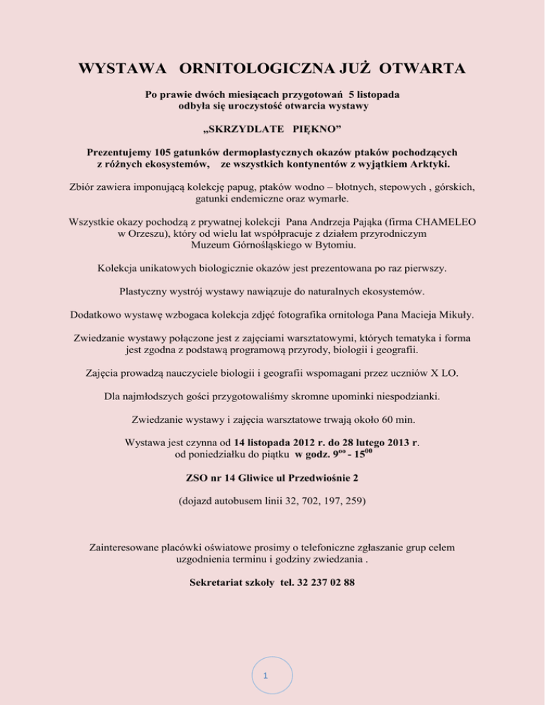 WYSTAWA ORNITOLOGICZNA JUŻ OTWARTA Po prawie dwóch miesiącach przygotowań 5 listopada odbyła się uroczystość otwarcia wystawy „SKRZYDLATE PIĘKNO” Prezentujemy 105 gatunków dermoplastycznych okazów ptaków pochodzących z różnych ekosystemów, ze wszystkich kontynentów z wyjątkiem Arktyki. Zbiór zawiera imponującą kolekcję papug, ptaków wodno – błotnych, stepowych , górskich, gatunki endemiczne oraz wymarłe. Wszystkie okazy pochodzą z prywatnej kolekcji Pana Andrzeja Pająka (firma CHAMELEO w Orzeszu), który od wielu lat współpracuje z działem przyrodniczym Muzeum Górnośląskiego w Bytomiu. Kolekcja unikatowych biologicznie okazów jest prezentowana po raz pierwszy. Plastyczny wystrój wystawy nawiązuje do naturalnych ekosystemów. Dodatkowo wystawę wzbogaca kolekcja zdjęć fotografika ornitologa Pana Macieja Mikuły. Zwiedzanie wystawy połączone jest z zajęciami warsztatowymi, których tematyka i forma jest zgodna z podstawą programową przyrody, biologii i geografii. Zajęcia prowadzą nauczyciele biologii i geografii wspomagani przez uczniów X LO. Dla najmłodszych gości przygotowaliśmy skromne upominki niespodzianki. Zwiedzanie wystawy i zajęcia warsztatowe trwają około 60 min. Wystawa jest czynna od 14 listopada 2012 r. do 28 lutego 2013 r. od poniedziałku do piątku w godz. 9oo - 1500 ZSO nr 14 Gliwice ul Przedwiośnie 2 (dojazd autobusem linii 32, 702, 197, 259) Zainteresowane placówki oświatowe prosimy o telefoniczne zgłaszanie grup celem uzgodnienia terminu i godziny zwiedzania . Sekretariat szkoły tel. 32 237 02 88 1 Informacji na temat wystawy udzielają: · nauczyciel biologii – Alina Konior · nauczyciel biologii – Dagmara Knapik · nauczyciel geografii – Małgorzata Wilk od 3 do 14 grudnia w godz. 16.00 - 19. 00 zapraszamy na wystawę wszystkich zainteresowanych mieszkańców Sośnicy 2 Minister Marek Michalak zwiedza wystawę "Skrzydlate Piękno" Pan Minister Marek Michalak uczestniczył w Sympozjum Korczakowskim, które odbyło się w naszej szkole. Po obradach odwiedził wystawę "Skrzydlate Piękno". Z zachwytem oglądał zgromadzone na niej ptaki i z zaciekawieniem wysłuchał ich historii. Szczególną uwagę zwrócił na unikatowy okaz naszej kolekcji - sępa płowego, który przywędrował na tereny Polski aż z Hiszpanii. Pan Minister gratulował nam pomysłu, wpisał się również do naszej Księgi Gości. Konferencja metodyczna dla nauczycieli przyrody i biologii 28 listopada 2012 roku odbyła się w naszej szkole konferencja metodyczna dla nauczycieli przyrody i biologii. Tematem konferecji było "Wykorzystanie wystawy ornitologicznej na różnych poziomach edukacyjnych". Zaproszeni nauczyciele zwiedzili wystawę, wysłuchali prelekcji Pani Małgorzaty Wilk i Pani Aliny Konior, otrzymali również materiały edukacyjne. Zwiedzanie wystawy "Skrzydlate Piękno" Nasza wystawa cieszy się dużym powodzeniem. W pierwszej kolejności zwiedzili ją uczniowie naszej szkoły. Odbyły się tu lekcje geografii i biologii. Przyjeżdżają do nas uczniowie szkół podstawowych oraz przedszkoli z Gliwic i Sośnicy. Dla każdej grupy wiekowej przygotowane są zajęcia, prezentacja multimedialna oraz zabawy edukacyjne, wszystko na bazie zwiedzanej wystawy. Dla małych gości mamy również zabawy ruchowe i słodkie upominki. Cieszymy się bardzo z tego, że wszystkim wystawa bardzo się podoba. 3 4