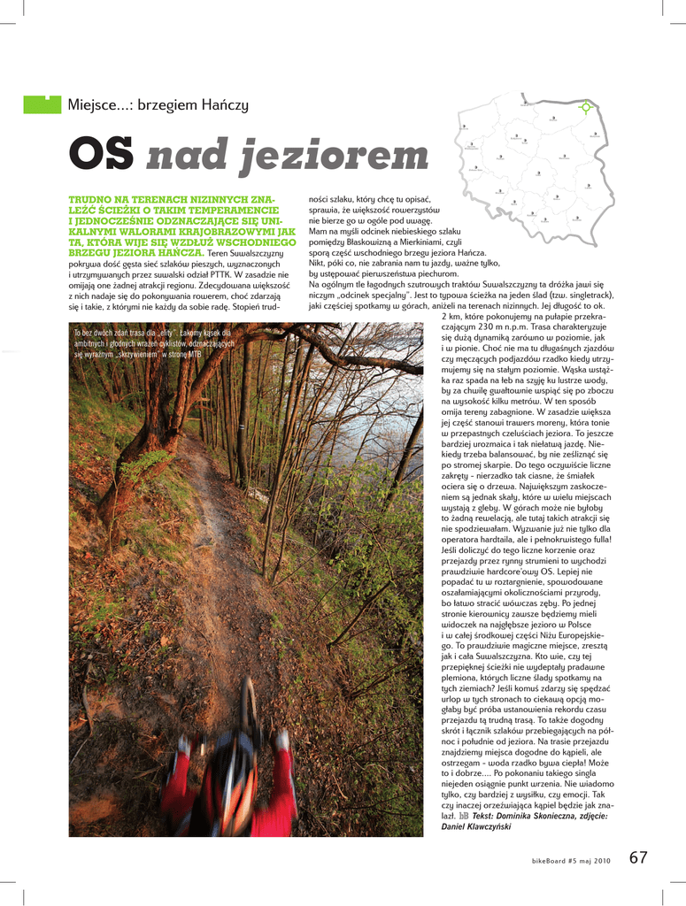 Miejsce...: brzegiem Hańczy Gdańsk Olsztyn OS nad jeziorem Szczecin Białystok Bydgoszcz Toruń Gorzów Wielkopolski Warszawa Poznań Zielona Góra Łódź Lublin TRUDNO NA TERENACH NIZINNYCH ZNALEŹĆ ŚCIEŻKI O TAKIM TEMPERAMENCIE I JEDNOCZEŚNIE ODZNACZAJĄCE SIĘ UNIKALNYMI WALORAMI KRAJOBRAZOWYMI JAK TA, KTÓRA WIJE SIĘ WZDŁUŻ WSCHODNIEGO BRZEGU JEZIORA HAŃCZA. Teren Suwalszczyzny pokrywa dość gęsta sieć szlaków pieszych, wyznaczonych i utrzymywanych przez suwalski odział PTTK. W zasadzie nie omijają one żadnej atrakcji regionu. Zdecydowana większość z nich nadaje się do pokonywania rowerem, choć zdarzają się i takie, z którymi nie każdy da sobie radę. Stopień trudTo bez dwóch zdań trasa dla „elity”. Łakomy kąsek dla ambitnych i głodnych wrażeń cyklistów, odznaczających się wyraźnym „skrzywieniem” w stronę MTB Wrocław ności szlaku, który chcę tu opisać, sprawia, że większość rowerzystów nie bierze go w ogóle pod uwagę. Mam na myśli odcinek niebieskiego szlaku pomiędzy Błaskowizną a Mierkiniami, czyli sporą część wschodniego brzegu jeziora Hańcza. Nikt, póki co, nie zabrania nam tu jazdy, ważne tylko, by ustępować pierwszeństwa piechurom. Na ogólnym tle łagodnych szutrowych traktów Suwalszczyzny ta dróżka jawi się niczym „odcinek specjalny”. Jest to typowa ścieżka na jeden ślad (tzw. singletrack), jaki częściej spotkamy w górach, aniżeli na terenach nizinnych. Jej długość to ok. 2 km, które pokonujemy na pułapie przekraczającym 230 m n.p.m. Trasa charakteryzuje się dużą dynamiką zarówno w poziomie, jak i w pionie. Choć nie ma tu długaśnych zjazdów czy męczących podjazdów rzadko kiedy utrzymujemy się na stałym poziomie. Wąska wstążka raz spada na łeb na szyję ku lustrze wody, by za chwilę gwałtownie wspiąć się po zboczu na wysokość kilku metrów. W ten sposób omija tereny zabagnione. W zasadzie większa jej część stanowi trawers moreny, która tonie w przepastnych czeluściach jeziora. To jeszcze bardziej urozmaica i tak niełatwą jazdę. Niekiedy trzeba balansować, by nie ześliznąć się po stromej skarpie. Do tego oczywiście liczne zakręty - nierzadko tak ciasne, że śmiałek ociera się o drzewa. Największym zaskoczeniem są jednak skały, które w wielu miejscach wystają z gleby. W górach może nie byłoby to żadną rewelacją, ale tutaj takich atrakcji się nie spodziewałam. Wyzwanie już nie tylko dla operatora hardtaila, ale i pełnokrwistego fulla! Jeśli doliczyć do tego liczne korzenie oraz przejazdy przez rynny strumieni to wychodzi prawdziwie hardcore’owy OS. Lepiej nie popadać tu w roztargnienie, spowodowane oszałamiającymi okolicznościami przyrody, bo łatwo stracić wówczas zęby. Po jednej stronie kierownicy zawsze będziemy mieli widoczek na najgłębsze jezioro w Polsce i w całej środkowej części Niżu Europejskiego. To prawdziwie magiczne miejsce, zresztą jak i cała Suwalszczyzna. Kto wie, czy tej przepięknej ścieżki nie wydeptały pradawne plemiona, których liczne ślady spotkamy na tych ziemiach? Jeśli komuś zdarzy się spędzać urlop w tych stronach to ciekawą opcją mogłaby być próba ustanowienia rekordu czasu przejazdu tą trudną trasą. To także dogodny skrót i łącznik szlaków przebiegających na północ i południe od jeziora. Na trasie przejazdu znajdziemy miejsca dogodne do kąpieli, ale ostrzegam - woda rzadko bywa ciepła! Może to i dobrze.... Po pokonaniu takiego singla niejeden osiągnie punkt wrzenia. Nie wiadomo tylko, czy bardziej z wysiłku, czy emocji. Tak czy inaczej orzeźwiająca kąpiel będzie jak znalazł. Tekst: Dominika Skonieczna, zdjęcie: Daniel Klawczyński Kielce Opole Katowice Kraków Rzeszów bikeBoar d #5 maj 2010 67