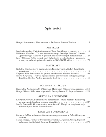 Spis treści Henryk Samsonowicz, Wspomnienie o Profesorze Januszu Tazbirze. . . . . . 5 ARTYKUŁY Maria Barłowska, „Pieśni mięsopustne” Jana Stoińskiego – powrót. . . . . . 11 Waldemar Kowalski, „To jest owczarnia onego Dobrego Pasterza”. Pojęcie „prawdziwego” Kościoła w polskich szesnastowiecznych katechizmach. . . 29 Jacek Wijaczka, Próba zimnej wody (pławienie) w oskarżeniach i procesach o czary w państwie polsko-litewskim w XVI–XVIII wieku. . . . . . . . . 73 MATERIAŁY Radosław Grześkowiak, O dupie Maryni. Rozwiązywanie „Gadki” Jana Kochanowskiego . . . . . . . . . . . . . . . . . . . . . . . . . . . . . . . . . . 111 Zbigniew Bela, Przyczynek do sprawy narodowości Marcina Siennika . . . . . 143 Michał Choptiany, Tradycja rękopiśmienna przepowiedni elekcyjnej Jerzego Joachima Retyka. Analiza przekazów i edycja . . . . . . . . . . . . . . . 155 POLEMIKI I DYSKUSJE Przemysław P. Szpaczyński, Odpowiedź Henrykowi Wisnerowi na recenzję. . 215 Henryk Wisner, Kilka słów odpowiedzi Przemysławowi P. Szpaczyńskiemu. . 225 ARTYKUŁY RECENZYJNE Katarzyna Bożeńska, Bartholomaeus Schachmann i sztuka podróży. Kilka uwag na marginesie katalogu wystawy gdańskiej. . . . . . . . . . . . . . . . . 227 Maciej Ptaszyński, O buntowniczą nowożytność. Uwagi na marginesie najnowszych prac Luise Schorn-Schütte . . . . . . . . . . . . . . . . . . . . 255 RECENZJE I OMÓWIENIA Biernat z Lublina a literatura i kultura wczesnego renesansu w Polsce (Katarzyna Meller). . . . . . . . . . . . . . . . . . . . . . . . . . . . . . . . . . . 273 Tamás Kruppa, Tradíció és propaganda keresztútján. Fejezetek Báthory Zsigmond udvarának kultúrájából (Szymon Brzeziński). . . . . . . . . . . . . . . . 278 Ewangelicyzm reformowany w Pierwszej Rzeczypospolitej. Dialog z Europą i wybory aksjologiczne w świetle literatury i piśmiennictwa XVI–XVII wieku (Urszula Augustyniak) . . . . . . . . . . . . . . . . . . . . . . . . . . . Medici Women. The Making of a Dynasty in Grand Ducal Tuscany (Meredith K. Ray). . . . . . . . . . . . . . . . . . . . . . . . . . . . . . . . . . . Valentina Lepri, Layered Wisdom. Early Modern Collections of Political Precepts (Marco Faini) . . . . . . . . . . . . . . . . . . . . . . . . . . . . . . . . Jennifer Powell McNutt, Calvin Meets Voltaire. The clergy of Geneva in the Age of Enlightenment 1685–1798 (Kazimierz Bem) . . . . . . . . . . . . „Acta Comeniana. International Review of Comenian Studies and Early Modern Intellectual History” (Danilo Facca). . . . . . . . . . . . . . . . . . 287 297 301 306 312 KRONIKA XXVIII Convegno internazionale Città e campagna nel Rinascimento (Chianciano Terme – Montepulciano, 21–23 lipca 2016 r.) (Jean-Louis Charlet). . . . . . . . . . . . . . . . . . . . . . . . . . . . . . . . . . . 317
