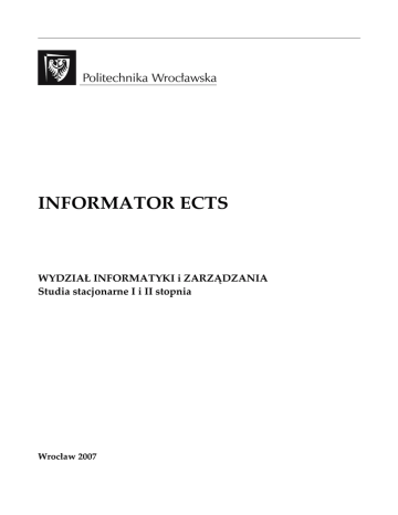 INFORMATOR ECTS WYDZIAŁ INFORMATYKI i ZARZĄDZANIA Studia stacjonarne I i II stopnia Wrocław 2007 Pakiet informacyjny ECTS 2007/2008 ● Politechnika Wrocławska Opracowanie: Krystyna Fryc inż. Urszula Laskowska mgr inż. Andrzej Łubiech Marzena Szegeth Redakcja: inż. Urszula Laskowska Korekta: dr inż. Iwona Dubielewicz Projekt graficzny: Janusz M. Szafran Aktualizacja: 18 stycznia 2011 r. Wydział Informatyki i Zarządzania 3 Politechnika Wrocławska ● Pakiet informacyjny ECTS 2007/2008 Spis treści I. Wydział Informatyki i Zarządzania..................................................................................................................... 6 1. Siedziba ............................................................................................................................................................. 6 2. Władze............................................................................................................................................................... 6 3. Koordynatorzy Wydziałowi ............................................................................................................................ 6 4. Ogólne informacje o Wydziale......................................................................................................................... 6 5. Struktura ........................................................................................................................................................... 7 6. Oferta dydaktyczna na rok akademicki 2007/2008......................................................................................... 8 6.1. Studia stacjonarne ...................................................................................................................................... 8 6.2. Studia niestacjonarne ................................................................................................................................. 9 6.3. Studia doktoranckie ................................................................................................................................... 9 7. Warunki przyjęć na studia ............................................................................................................................... 9 7.1. Warunki przyjęć na studia I stopnia......................................................................................................... 9 7.2. Warunki przyjęć na studia II stopnia........................................................................................................ 9 7.3. Warunki przyjęć na studia III stopnia .....................................................................................................10 8. Zasady oceniania i egzaminowania................................................................................................................10 II. Kierunki kształcenia ...........................................................................................................................................13 1. INFORMATYKA .............................................................................................................................................13 1.1. Ogólna charakterystyka kierunku ...........................................................................................................13 1.2. Sylwetka absolwenta ................................................................................................................................13 1.3. Forma ukończenia i możliwość kontynuacji studiów ............................................................................15 1.4. Plany studiów............................................................................................................................................15 1.4.1. Plan studiów stacjonarnych I stopnia ...................................................................................................15 1.4.2. Plan studiów stacjonarnych II stopnia..................................................................................................21 1.5. Opisy kursów ............................................................................................................................................47 1.5.1 Opisy kursów studiów I stopnia ............................................................................................................47 1.5.1 Opisy kursów studiów II stopnia...........................................................................................................71 2. COMPUTER SCIENCE .................................................................................................................................132 2.1. Ogólna charakterystyka kierunku .........................................................................................................132 General characteristics of the field of study.................................................................................................132 2.2. Sylwetka absolwenta ..............................................................................................................................132 Graduates profile ...........................................................................................................................................132 2.3. Forma ukończenia i możliwość kontynuacji studiów ..........................................................................133 Completing of the studies and possibilities of continuing..........................................................................133 2.4. Plany studiów..........................................................................................................................................133 2.4.1. Plan of the 1st level regular study.......................................................................................................133 2.4.2. Plan of the 2nd level regular study..................................................