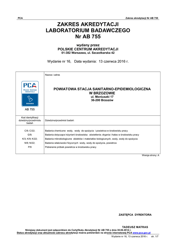 PCA Zakres akredytacji Nr AB 755 ZAKRES AKREDYTACJI LABORATORIUM BADAWCZEGO Nr AB 755 wydany przez POLSKIE CENTRUM AKREDYTACJI 01-382 Warszawa, ul. Szczotkarska 42 Wydanie nr 16, Data wydania: 13 czerwca 2016 r. Nazwa i adres POWIATOWA STACJA SANITARNO-EPIDEMIOLOGICZNA W BRZOZOWIE ul. Moniuszki 17 36-200 Brzozów AB 755 Kod identyfikacji dziedziny/przedmiotu badań C/9; C/22; G/9; K/3; K/9; K/22; N/9; N/22; P/9 Dziedzina/przedmiot badań: Badania chemiczne wody, wody do spożycia i powietrza w środowisku pracy Badania dotyczące inżynierii środowiska: oświetlenie; drgania i hałas w środowisku pracy Badania mikrobiologiczne obiektów i materiałów biologicznych, wody, wody do spożycia Badania właściwości fizycznych wody, wody do spożycia, powietrza Pobieranie próbek powietrza w środowisku pracy Wersja strony: A ZASTĘPCA DYREKTORA TADEUSZ MATRAS Niniejszy dokument jest załącznikiem do Certyfikatu Akredytacji Nr AB 755 z dnia 30.06.2014 r. Status akredytacji oraz aktualność zakresu akredytacji można potwierdzić na stronie internetowej PCA www.pca.gov.pl Wydanie nr 16, 13 czerwca 2016 r. str. 1/7 PCA Zakres akredytacji Nr AB 755 Przedmiot badań / wyrób Woda Woda do spożycia ODDZIAŁ LABORATORYJNY Pracownia Bakteriologii Wody ul. Moniuszki 17 36-200 Brzozów Rodzaj działalności/ badane cechy/ metoda Liczba gronkowców koagulazo – dodatnich Zakres: od 1 jtk/100 ml Obecność gronkowców koagulazo – dodatnich w 100 ml Metoda filtracji membranowej Ogólna liczba mikroorganizmów w 36°C Zakres: od 1 jtk/1 ml Metoda płytkowa ( posiew wgłębny ) Ogólna liczba mikroorganizmów w 22 °C Zakres: od 1 jtk/1 ml Metoda płytkowa ( posiew wgłębny ) Liczba bakterii grupy coli Zakres: od 1 jtk/100 ml Obecność bakterii grupy coli w 100 ml Metoda filtracji membranowej Liczba bakterii grupy coli termotolerancyjnych Zakres: od 1 jtk/100 ml Obecność bakterii grupy coli termotolerancyjnych w 100 ml Metoda filtracji membranowej Liczba bakterii Escherichia coli Zakres: od 1 jtk/100 ml Obecność bakterii Escherichia coli w 100 ml Metoda filtracji membranowej Liczba Clostridium perfringens (łącznie z przetrwalnikami) Zakres: od 1 jtk/100 ml Obecność Clostridium perfringens (łącznie z przetrwalnikami) w 100 ml Metoda filtracji membranowej Liczba enterokoków Zakres: od 1 jtk/100 ml Obecność enterokoków w 100 ml Metoda filtracji membranowej Liczba Pseudomonas aeruginosa Zakres: od 1 jtk / 100 ml Obecność Pseudomonas aeruginosa w 100 ml Metoda filtracji membranowej Dokumenty odniesienia PB/01/M wyd. III Data wydania 2010-05-20 PN-EN ISO 6222:2004 PB/06/M wyd. III Data wydania 2010-05-20 PN-EN ISO 9308-1:2014-12 PB/06/M wyd. III Data wydania 2010-05-20 PB/06/M wyd. III Data wydania 2010-05-20 PN-EN ISO 9308-1:2014-12 Rozporządzenie Ministra Zdrowia z dnia 13.11.2015 r. w sprawie jakości wody przeznaczonej do spożycia przez ludzi (Dz. U. z 2015 r.,poz. 1989), zał. Nr 10 PN-EN ISO 7899-2: 2004 PN-EN ISO 16266:2009 Wersja strony: A Wydanie nr 16, 13 czerwca 2016 r. str. 2/7 PCA Badane obiekty / Grupa obiektów Woda Woda do spożycia Zakres akredytacji Nr AB 755 ODDZIAŁ LABORATORYJNY Pracownia Fizykochemii Wody ul. Moniuszki 17 36-200 Brzozów Badane cechy i metody badawcze/pomiarowe Stężenie żelaza ogólnego Zakres: (0,020 – 2,0) mg/l Metoda spektrofotometryczna Stężenie manganu ogólnego Zakres: (0,014 – 1,5) mg/l Metoda spektrofotometryczna Stężenie azotynów Zakres: (0,020 – 1,0) mg/l Metoda spektrofotometryczna Stężenie jonu amonowego Zakres: (0,05 – 2,6) mg/l Metoda spektrofotometryczna Stężenie azotanów Zakres: (0,1 – 110) mg/l Metoda spektrofotometryczna Przewodność elektryczna właściwa Zakres: (148 – 12800) µS/cm Metoda konduktometryczna pH Zakres: 4,0 – 10,0 Metoda potencjometryczna Mętność Zakres: (0,50 – 20) NTU Metoda nefelometryczna Barwa Zakres: (5 – 60) mg/l Pt Metoda wizualna Normy i/lub udokumentowane procedury badawcze PN-ISO 6332:2001 PN-92/C-04590/03 PN-EN 26777:1999 PN-C-04576-4:1994 PN-82/C-04576/08 PN-EN 27888:1999 PN-EN ISO 10523:2012 PN-EN ISO 7027:2003 pkt. 6.3 PN-EN ISO 7887: 2012 pkt 7 Metoda D Wersja strony: A Wydanie nr 16, 13 czerwca 2016 r. str. 3/7 PCA Badane obiekty / Grupa obiektów Środowisko pracy - drgania mechaniczne działające na organizm człowieka przez kończyny górne Środowisko pracy - drgania mechaniczne o ogólnym działaniu na organizm człowieka Zakres akredytacji Nr AB 755 ODDZIAŁ LABORATORYJNY Pracownia Higieny Pracy ul. Moniuszki 17 36-200 Brzozów Badane cechy i metody badawcze/pomiarowe Skuteczne ważone częstotliwościowo przyspieszenie drgań Zakres: (0,03 – 100) m/s2 Metoda pomiarowa bezpośrednia Ekspozycja dzienna, wyrażona w postaci równoważnej energetycznie dla 8-godz działania sumy wektorowej skutecznych, skorygowanych częstotliwościowo przyspieszeń drgań, wyznaczonych dla trzech składowych kierunkowych (ahwx, ahwy, ahwz) Ekspozycja trwająca 30 minut i krócej, wyrażona w postaci sumy wektorowej skutecznych, ważonych częstotliwościowo przyspieszeń drgań, wyznaczonych dla trzech składowych kierunkowych (ahwx, ahwy, ahwz) (z obliczeń) Skuteczne ważone częstotliwościowo przyspieszenie drgań Zakres: (0,03 – 100) m/s2 Metoda pomiarowa bezpośrednia Normy i/lub udokumentowane procedury badawcze PN-EN ISO 5349-1:2004 PN-EN ISO 5349-2:2004 PN-EN 14253+A1:2011 Ekspozycja dzienna, wyrażona w postaci równoważnego energetycznie dla 8-godz działania skutecznego, skorygowanego częstotliwościowo przyspieszenia drgań, dominującego wśród przyspieszeń drgań, wyznaczonych dla trzech składowych kierunkowych z uwzględnieniem właściwych współczynników (1.4awx, 1.4awy, awz) Ekspozycja trwająca 30 minut i krócej, wyrażona w postaci skutecznego, ważonego częstotliwościowo przyspieszenia drgań, dominującego wśród przyspieszeń drgań, wyznaczonych dla trzech składowych kierunkowych z uwzględnieniem właściwych współczynników (1.4