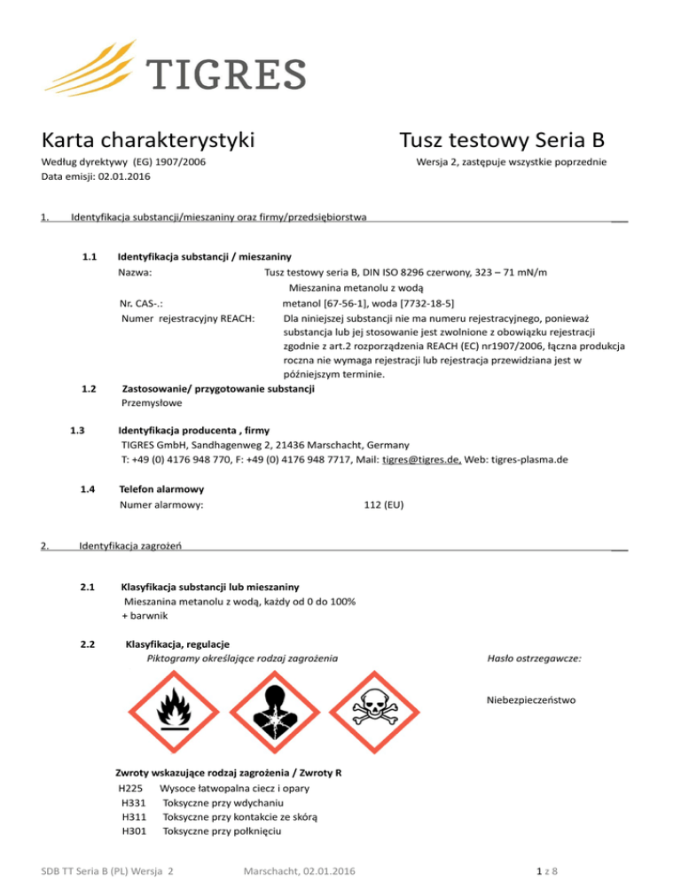 Karta charakterystyki Tusz testowy Seria B Według dyrektywy (EG) 1907/2006 Data emisji: 02.01.2016 1. Identyfikacja substancji/mieszaniny oraz firmy/przedsiębiorstwa 1.1 1.2 1.3 1.4 2. Wersja 2, zastępuje wszystkie poprzednie ___ Identyfikacja substancji / mieszaniny Nazwa: Tusz testowy seria B, DIN ISO 8296 czerwony, 323 – 71 mN/m Mieszanina metanolu z wodą Nr. CAS-.: metanol [67-56-1], woda [7732-18-5] Numer rejestracyjny REACH: Dla niniejszej substancji nie ma numeru rejestracyjnego, ponieważ substancja lub jej stosowanie jest zwolnione z obowiązku rejestracji zgodnie z art.2 rozporządzenia REACH (EC) nr1907/2006, łączna produkcja roczna nie wymaga rejestracji lub rejestracja przewidziana jest w późniejszym terminie. Zastosowanie/ przygotowanie substancji Przemysłowe Identyfikacja producenta , firmy TIGRES GmbH, Sandhagenweg 2, 21436 Marschacht, Germany T: +49 (0) 4176 948 770, F: +49 (0) 4176 948 7717, Mail: [email protected], Web: tigres-plasma.de Telefon alarmowy Numer alarmowy: 112 (EU) Identyfikacja zagrożeń 2.1 2.2 ___ Klasyfikacja substancji lub mieszaniny Mieszanina metanolu z wodą, każdy od 0 do 100% + barwnik Klasyfikacja, regulacje Piktogramy określające rodzaj zagrożenia Hasło ostrzegawcze: Niebezpieczeństwo Zwroty wskazujące rodzaj zagrożenia / Zwroty R H225 Wysoce łatwopalna ciecz i opary H331 Toksyczne przy wdychaniu H311 Toksyczne przy kontakcie ze skórą H301 Toksyczne przy połknięciu SDB TT Seria B (PL) Wersja 2 Marschacht, 02.01.2016 1z8 H370 Szkodliwe dla narządów R11 R23/24/25 Zwroty wskazujące zachowanie ostrożności / Zwroty S P210 Trzymać z dala od źródeł ciepła/iskier/ otwartego płomienia/gorących powierzchni. Zakaz palenia w pobliżu substancji. P233 Przechowywać pojemnik szczelnie zamknięty. P280 Nosić rękawice ochronne/ odzież ochronną/ ochronę oczu/ ochronę twarzy. P302+P352 W przypadku kontaktu ze skórą, natychmiast przemyć skórę wodą z mydłem. P307+310 Gdy zostałeś narażony na wezwij pomoc medyczna lub skontaktuj się z centrum leczenia zatruć. S7-16-36 S37-45 Pełny tekst zwrotów R zawartych w tej sekcji; patrz: sekcja 16. 2.3 3. Inne zagrożenia Nieznane Skład / informacja o składnikach 3.1 ___ Substancja Nazwa : metanol Wzór chemiczny: CH3OH M.= 32,04 g/mol Numer CAS [67-56-1] Nr EC-. (EINECS): 200-659-6 EG-Index-No.: 603-001-00-X TARIC: 2905 11 00 10 Łatwopalna ciecz, kategoria 2, H225 Ostra toksyczność, kategoria 3, H301 Ostra toksyczność, kategoria 3, H331 Ostra toksyczność, kategoria 3, H311 Działanie toksyczne na organy - narażenie jednorazowe, kategoria 1, H370 3.2 4. Skład chemiczny Mieszanina metanolu z wodą, każdy od 0 do 100% Numer CAS-.: metanol [67-56-1], woda [7732-18-5] + barwnik Środki pierwszej pomocy 4.1 Opis środków pierwszej pomocy W żadnym wypadku nie podawać napojów ani wywoływać wymiotów nawet w przypadku utraty przytomności W przypadku inhalacji Wystawić na działania świeżego powietrza w przypadku utrzymywania się dyskomfortu wezwać pomoc lekarską.. W przypadku kontaktu ze skórą Zmyć dużą ilością wody, usunąć skażoną odzież SDB TT Serie C (E) Version 2 Marschacht, 22.12.2015 2 of 1 W przypadku kontaktu z oczami Przemyć dużą ilością wody z szeroko rozwartymi powiekami (min 15 minut). Wezwać pomoc medyczną. Po połknięciu Wystawić poszkodowanego na działanie świeżego powietrza. Podać poszkodowanemu etanol(np. 1 szklanka 40% napoju alkoholowego). Natychmiast wezwać pomoc medyczną(wspomnieć o spożyciu metanolu). Tylko w wyjątkowych przypadkach, jeśli pomoc medyczna jest niedostępna w ciągu godziny wywołać wymioty(tylko u osób w pełni przytomnych) i podać ponownie etanol (ok 0,3ml 40% napoju alkoholowego/ kg masy ciała/ godzinę). 5. Postępowanie w przypadku pożaru ___ 5.1 Środki gaśnicze odpowiednie: proszek, piana gaśnicza, dwutlenek węgla (CO2) nieodpowiednie: brak ograniczeń środków gaszących dla tej mieszaniny 5.2 Szczególne zagrożenia wynikające z właściwości substancji / mieszaniny Substancja łatwopalna. Opary są cięższe od powietrza przez co mogą rozprzestrzeniać się po podłodze. W przypadku wysokich temperatur wraz z powietrzem tworzy mieszaniny wybuchowe. W przypadku pożaru mogą powstać niebezpieczne spaliny i opary. Należy zwrócić uwagę na możliwość cofnięcia się płomienia. Specjalny sprzęt ochronny stosowany do zwalczania pożarów W strefie zagrożenia przebywać tylko w aparatach oddechowych. Należy unikać kontaktu ze skórą poprzez utrzymywanie bezpiecznego dystansu, a także założenie ubrania ochronnego. 5.3 Pozostałe informacje Chłodzić zamknięte zbiorniki narażone na ogień poprzez zraszanie wodą. Uniemożliwić wodzie gaśniczej zanieczyszczenie wód powierzchniowych lub gruntowych. 6. Postępowanie przypadku niezamierzonego uwolnienia do środowiska 6.1 Indywidualne środki ostrożności, wyposażenie ochronne i procedury w sytuacjach awaryjnych: Unikać kontaktu z substancją. Nie wdychać oparów. Zapewnić dopływ świeżego powietrza do zamkniętych pomieszczeń. Trzymać się z dala od źródeł zapłonu. 6.2 Środki ostrożności w zakresie ochrony środowiska Nie odprowadzać do kanalizacji. 6.3 Metody i materiały zapobiegające rozprzestrzenianiu się zagrożenia i służące do jego usuwania Zebrać ciecz przy pomocy substancji absorbującej. Zutylizować we właściwy sposób. Przekazać dalej w celu unieszkodliwienia. Wyczyścić skażone miejsce. Odwołania do innych sekcji Brak 6.4 7. ___ Obsługa i przechowywanie Ogólnie: 7.1 ___ W normalnych warunkach brak szczególnych wymagań. Środki ostrożności dla bezpiecznego używania Wartości poniżej 48 mN/m Nie wdychać. Unikać wdychania i postawania oparów. Wartości poniżej 30 mN/m Trzymać z dala od otwartego ognia, gorących powierzchni i źródeł zapłonu. Podjąć środki ostrożności przed wyładowaniami elektrostatycznymi. SDB TT Seria B (PL) Wersja 2 Marschach