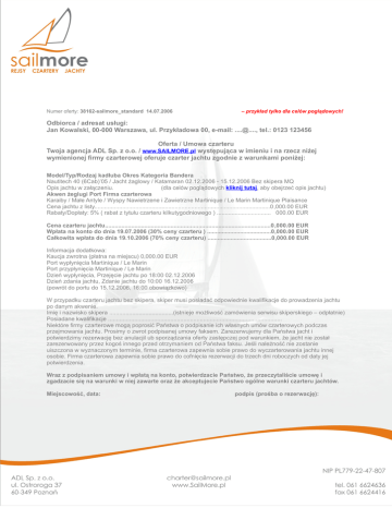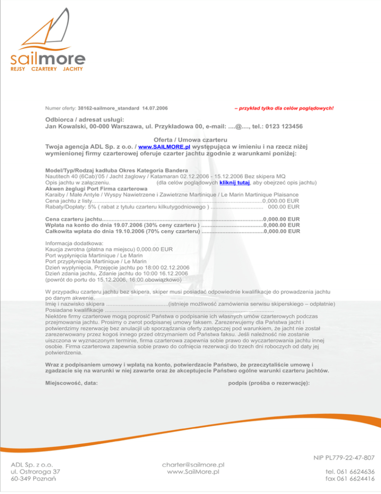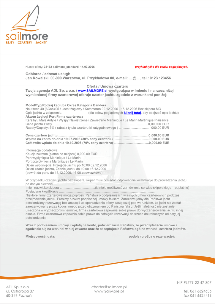 Numer oferty: 38162-sailmore_standard 14.07.2006 – przykład tylko dla celów poglądowych! Odbiorca / adresat usługi: Jan Kowalski, 00-000 Warszawa, ul. Przykładowa 00, e-mail: ....@...., tel.: 0123 123456 Oferta / Umowa czarteru Twoja agencja ADL Sp. z o.o. / www.SAILMORE.pl występująca w imieniu i na rzecz niżej wymienionej firmy czarterowej oferuje czarter jachtu zgodnie z warunkami poniżej: Model/Typ/Rodzaj kadłuba Okres Kategoria Bandera Nautitech 40 (6Cab)’05 / Jacht żaglowy / Katamaran 02.12.2006 - 15.12.2006 Bez skipera MQ Opis jachtu w załączeniu. (dla celów poglądowych kliknij tutaj, aby obejrzeć opis jachtu) Akwen żeglugi Port Firma czarterowa Karaiby / Małe Antyle / Wyspy Nawietrzene i Zawietrzne Martinique / Le Marin Martinique Plaisance Cena jachtu z listy...........................................................................................................0,000.00 EUR Rabaty/Dopłaty: 5% ( rabat z tytułu czarteru kilkutygodniowego ) ................................. 000.00 EUR Cena czarteru jachtu.....................................................................................................0,000.00 EUR Wpłata na konto do dnia 19.07.2006 (30% ceny czarteru ) .......................................0,000.00 EUR Całkowita wpłata do dnia 19.10.2006 (70% ceny czarteru) .......................................0,000.00 EUR Informacja dodatkowa: Kaucja zwrotna (płatna na miejscu) 0,000.00 EUR Port wypłynięcia Martinique / Le Marin Port przypłynięcia Martinique / Le Marin Dzień wypłynięcia, Przejęcie jachtu po 18:00 02.12.2006 Dzień zdania jachtu, Zdanie jachtu do 10:00 16.12.2006 (powrót do portu do 15.12.2006, 16:00 obowiązkowo) W przypadku czarteru jachtu bez skipera, skiper musi posiadać odpowiednie kwalifikacje do prowadzenia jachtu po danym akwenie. Imię i nazwisko skipera .......................................(istnieje możliwość zamówienia serwisu skiperskiego – odpłatnie) Posiadane kwalifikacje .......................................................................................................... Niektóre firmy czarterowe mogą poprosić Państwa o podpisanie ich własnych umów czarterowych podczas przejmowania jachtu. Prosimy o zwrot podpisanej umowy faksem. Zarezerwujemy dla Państwa jacht i potwierdzimy rezerwację bez anulacjil ub sporządzania oferty zastępczej pod warunkiem, że jacht nie został zarezerwowany przez kogoś innego przed otrzymaniem od Państwa faksu. Jeśli należność nie zostanie uiszczona w wyznaczonym terminie, firma czarterowa zapewnia sobie prawo do wyczarterowania jachtu innej osobie. Firma czarterowa zapewnia sobie prawo do cofnięcia rezerwacji do trzech dni roboczych od daty jej potwierdzenia. Wraz z podpisaniem umowy i wpłatą na konto, potwierdzacie Państwo, że przeczytaliście umowę i zgadzacie się na warunki w niej zawarte oraz że akceptujecie Państwo ogólne warunki czarteru jachtów. Miejscowość, data: podpis (prośba o rezerwację):