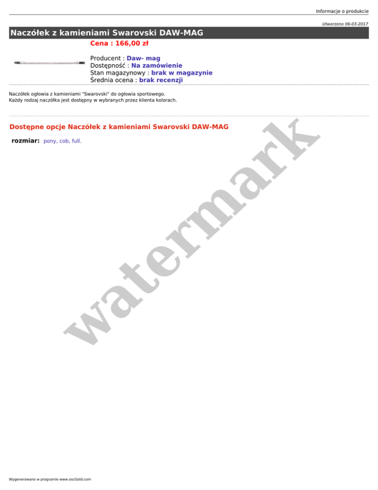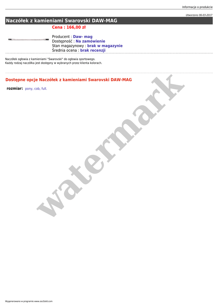 Informacje o produkcie Utworzono 06-03-2017 Naczółek z kamieniami Swarovski DAW-MAG Cena : 166,00 zł Producent : Daw- mag Dostępność : Na zamówienie Stan magazynowy : brak w magazynie Średnia ocena : brak recenzji Naczółek ogłowia z kamieniami "Swarovski" do ogłowia sportowego. Każdy rodzaj naczółka jest dostępny w wybranych przez klienta kolorach. w at rozmiar: pony, cob, full. er m ar k Dostępne opcje Naczółek z kamieniami Swarovski DAW-MAG Wygenerowano w programie www.oscGold.com