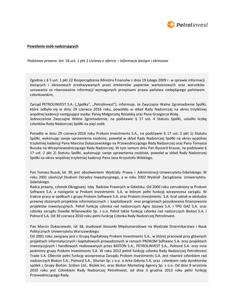 Powołanie osób nadzorujących Podstawa prawna: Art. 56 ust. 1 pkt 2 Ustawy o ofercie – informacje bieżące i okresowe Zgodnie z § 5 ust. 1 pkt 22 Rozporządzenia Ministra Finansów z dnia 19 lutego 2009 r. w sprawie informacji bieżących i okresowych przekazywanych przez emitentów papierów wartościowych oraz warunków uznawania za równoważne informacji wymaganych przepisami prawa państwa niebędącego państwem członkowskim, Zarząd PETROLINVEST S.A. („Spółka”, „Petrolinvest”), informuje, że Zwyczajne Walne Zgromadzenie Spółki, które odbyło się w dniu 29 czerwca 2016 roku, powołało w skład Rady Nadzorczej na okres trzyletniej wspólnej kadencji następujące osoby: Panią Małgorzatę Różalską oraz Pana Grzegorza Walę. Jednocześnie Zwyczajne Walne Zgromadzenie, na podstawie § 17 ust. 4 Statutu Spółki, ustaliło liczbę członków Rady Nadzorczej Spółki na pięć osób. Ponadto w dniu 29 czerwca 2016 roku Prokom Investments S.A., na podstawie § 17 ust. 2 pkt 1) Statutu Spółki, wykonując swoje uprawnienia osobiste, powołał w skład Rady Nadzorczej Spółki na okres wspólnej trzyletniej kadencji Pana Marcina Dukaczewskiego na Przewodniczącego Rady Nadzorczej oraz Pana Tomasza Buzuka na Wiceprzewodniczącego Rady Nadzorczej. W tym samym dniu Pan Ryszard Krauze, na podstawie § 17 ust. 2 pkt 2) Statutu Spółki, wykonując swoje uprawnienia osobiste, powołał w skład Rady Nadzorczej Spółki na okres wspólnej trzyletniej kadencji Pana Jana Krzysztofa Wilskiego. Pan Tomasz Buzuk, lat 39, jest absolwentem Wydziału Prawa i Administracji Uniwersytetu Gdańskiego. W roku 2001 ukończył Studium Doradcy Inwestycyjnego, a w roku 2002 Wydział Zarządzania Uniwersytetu Gdańskiego. Radca prawny, członek Okręgowej Izby Radców Prawnych w Gdańsku. Od 2000 roku zatrudniony w Prokom Software S.A. a następnie w Prokom Investments S.A. w którym pełni funkcję wiceprezesa zarządu. W trakcie pracy w spółkach z grupy Prokom Software S.A. oraz Prokom Investments S.A. brał udział w obsłudze prawnej złożonych projektów informatycznych i kapitałowych oraz programach pozyskiwania finansowania projektów inwestycyjnych. Pełnił funkcję członka rad nadzorczych Agro Jazowa S.A. i TPG GAZ S.A. oraz członka zarządu Osiedle Wilanowskie Sp. z o.o. Pełnił także funkcję członka rad nadzorczych Bioton S.A. i Polnord S.A. Od 30 czerwca 2010 roku pełni funkcję Członka Rady Nadzorczej Petrolinvest. Pan Marcin Dukaczewski, lat 38, studiował Stosunki Międzynarodowe na Wydziale Dziennikarstwa i Nauk Politycznych Uniwersytetu Warszawskiego. Od 2001 roku związany jest z Grupą Kapitałową Prokom Investments S.A., w której pracował przy głównych projektach informatycznych i kapitałowych prowadzonych w ramach PROKOM Software S.A. oraz projektach inwestycyjnych i handlowych realizowanych przez BIOTON S.A., PETROLINVEST S.A., Polnord S.A. oraz inne podmioty grupy Prokom Investments S.A. W roku 2012 pełnił funkcję członka Rady Nadzorczej Petrolinvest Trade S.A. Obecnie pełni funkcję wiceprezesa Zarządu Prokom Investments S.A. Jest również członkiem rad nadzorczych Bioton S.A., Polnord S.A., Silurian Sp. z o.o. o Arka Gdynia S.A. oraz członkiem rady dyrektorów spółek z Grupy Bioton: SciGen Ltd., Biolek Inc. oraz Bioton Marketing Agency Sp. z o.o. Od dnia 9 września 2010 roku jest Członkiem Rady Nadzorczej Petrolinvest, od dnia 3 grudnia 2013 roku pełni funkcję Przewodniczącego Rady. Pani Małgorzata Różalska, lat 54, posiada wykształcenie średnie, ukończyła Liceum Ekonomiczne w Warszawie. Pracę zawodową rozpoczęła w 1981 roku na stanowisku referenta w Dziale Ekonomiczno-Finansowym w PGH Konsumy, gdzie pracowała do 1990 roku. Od 1991 roku związana jest z bankowością, w latach 19911997 zatrudniona była na stanowisku kasjera w PKO BP S.A., a następnie na stanowisku specjalisty w Zespole Obsługi Klienta w Banku Pekao S.A., gdzie pracuje do chwili obecnej. Pan Grzegorz Wala, lat 40, ukończył Politechnikę Łódzką z tytułem inżyniera oraz Akademię Techniczno Humanistyczną w Bielsku-Białej. Pracuje w branży informatycznej od 1996 roku. Zatrudniony był w firmach Anspi oraz Vicom Computers, gdzie zajmował się budową systemów komputerowych i ich dystrybucją. Równolegle pracował dla Norsk Hydro ASA przy projekcie budowy fabryki w Chinach. Od 2013 roku współpracuje ze spółką Wystawa Klocków Sp. z o.o., gdzie odpowiada za systemy informatyczne. Pan Krzysztof Wilski, lat 84, posiada wykształcenie wyższe prawnicze, wpisany na listę radców prawnych i adwokatów. Do roku 1994 był radcą prawnym państwowych central handlu zagranicznego. W latach 1985-1997 doradca prawny i prokurent spółek oraz głównego udziałowca lub spółek zależnych Ryszarda Krauze. Od lipca 1997 roku do października 2005 roku pełnił funkcję wiceprezesa zarządu Prokom Software S.A., później zaś do kwietnia 2008 roku funkcję prokurenta w tej spółce. Do końca czerwca 2005 roku pełnił funkcję przewodniczącego rady nadzorczej w Overtop S.A. Od kwietnia 2000 roku do maja 2005 roku był członkiem rady nadzorczej w Prokom Internet S.A., natomiast do września 2010 roku członkiem rady nadzorczej Bioton SA. Obecnie jest członkiem rady nadzorczej Prokom Investments S.A. Pełni także funkcję członka zarządu C. Ulrich założone w 1805 roku w Warszawie S.A. Od 8 marca 2006 roku pełni funkcję Członka Rady Nadzorczej Petrolinvest. Działalność w/w osób wykonywana poza przedsiębiorstwem Spółki nie jest w stosunku do niej konkurencyjna. Żadna z w/w osób nie uczestniczy w spółce konkurencyjnej w stosunku do Petrolinvest jako wspólnik spółki cywilnej, spółki osobowej lub jako członek organu spółki kapitałowej, ani nie uczestniczy w innej konkurencyjnej osobie prawnej jako członek jej organu. Żadna z w/w osób nie figuruje w Rejestrze Dłużników Niewypłacalnych, prowadzonym na podstawie ustawy