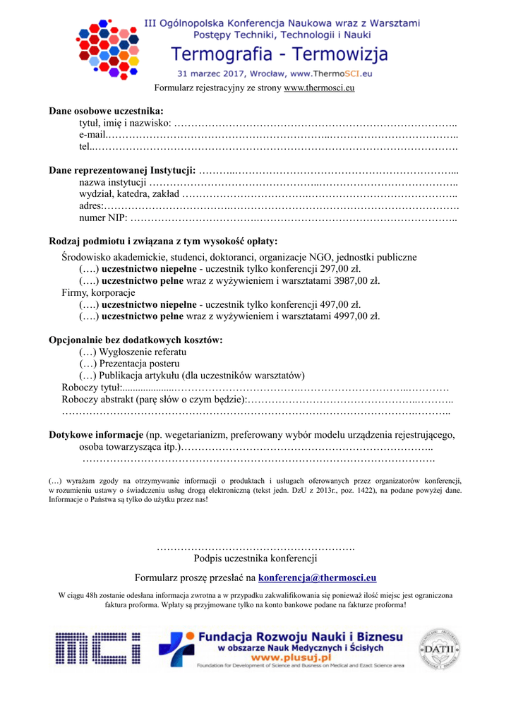 Formularz rejestracyjny ze strony www.thermosci.eu Dane osobowe uczestnika: tytuł, imię i nazwisko: ……………………………………………………………………….. e-mail.………………………………………………………..……………………………….. tel..……………………………………………………………………………………………. Dane reprezentowanej Instytucji: ………..………………………………………………………... nazwa instytucji …………………………………………..………………………………….. wydział, katedra, zakład ……………………………….…………………………………….. adres:……………………………….…………………………………………………………. numer NIP: ……………………………….………………………………………………….. Rodzaj podmiotu i związana z tym wysokość opłaty: Środowisko akademickie, studenci, doktoranci, organizacje NGO, jednostki publiczne (….) uczestnictwo niepełne - uczestnik tylko konferencji 297,00 zł. (….) uczestnictwo pełne wraz z wyżywieniem i warsztatami 3987,00 zł. Firmy, korporacje (….) uczestnictwo niepełne - uczestnik tylko konferencji 497,00 zł. (….) uczestnictwo pełne wraz z wyżywieniem i warsztatami 4997,00 zł. Opcjonalnie bez dodatkowych kosztów: (…) Wygłoszenie referatu (…) Prezentacja posteru (…) Publikacja artykułu (dla uczestników warsztatów) Roboczy tytuł:....................……………………………….…………………………..………… Roboczy abstrakt (parę słów o czym będzie):…………………………………………..……….. ………………………………………………………………………………………….……….. Dotykowe informacje (np. wegetarianizm, preferowany wybór modelu urządzenia rejestrującego, osoba towarzysząca itp.)……………………………………………………………….. …………………………………………………………………………………………. (…) wyrażam zgody na otrzymywanie informacji o produktach i usługach oferowanych przez organizatorów konferencji, w rozumieniu ustawy o świadczeniu usług drogą elektroniczną (tekst jedn. DzU z 2013r., poz. 1422), na podane powyżej dane. Informacje o Państwa są tylko do użytku przez nas! …………………………………………………. Podpis uczestnika konferencji Formularz proszę przesłać na [email protected] W ciągu 48h zostanie odesłana informacja zwrotna a w przypadku zakwalifikowania się ponieważ ilość miejsc jest ograniczona faktura proforma. Wpłaty są przyjmowane tylko na konto bankowe podane na fakturze proforma!