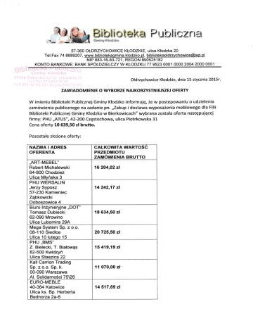_j,ŁłMk *1 Ł-|i.* Ł*|q* F ub§ i *Hr}a} 57-360 OŁDRZYCHOW|CE KŁODZKIE, ulica Kłodzka 20 [email protected]| NlP BB3-16-83-721, REGoN 890525182 Tel.Fax 748689207, www.bibliotekagmina.klodzko,pl, KONTO BANKOWE, BANK Ołdrzychowice Kłodzkie, dnia 15 stycznia 2OL5r. ZAWIADOMIENIE O WYBORZE NAJKORZYSTN|EJSZEJ OFERTY W imieniu Biblioteki Publicznej Gminy Kłodzko informuję, że w postepowaniu o udzielenia zamówienia publicznego na zadanie pn.,,Zakup idostawa wyposażenia meblowego dla Filii Biblioteki Publicznej Gminy Kłodzko w Bierkowicach" wybrana została oferta następującej firmy: PHU ,,ATUS" , 4ż-2Oa Częstochowa, ulica Piotrkowska 31 Cena oferty 10 639,50 zł brutto. Pozostałe złożone oferty: NAZWA l ADRES oFERENTA ,,ART-MEBEL, Robeń Michalewski 64-800 Chodzieź Ulica Młvńska 3 PHU WERSAL|N Jerzy Syposz 57-23a Kamieniec Ząbkowicki Doboszowice 4 Biuro lnżynieryjne,,DOT" Tomasz Dubiecki 62-090 Mrowino Ulica Lubomira 29A Mega System Sp. z o.o. 08-110 Siedlce Ulica 10 luteoo 15 PHU,,BMS, Z, Bielecki, T. Białowąs 82-500 Kwidzyń Ulica Staszica22 Kall Carrion Trading Sp. z o.o, Sp. k 00-090 Warszawa Al. Solidarności 75\26 EURo-MEBLE 40-384 Katowice Ulica ks. Bp. Herbeńa Bednorza 2a-6 CAŁKOWITA WARTOSC PRZEDMloTU ZAMOWIENIA BRUTTO 16 204,02zł 14 242,17 zł {8 634,50 zł 20 725,5a ń 15 419,19 zł fl a70,00 zł 14 517,69 zł
