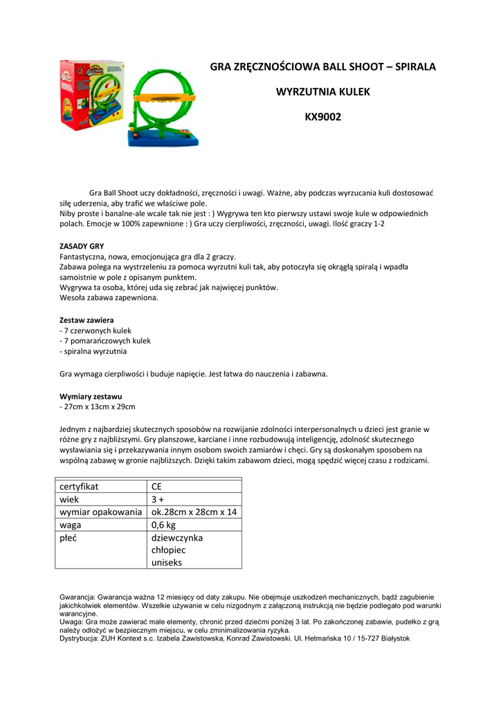 GRA ZRĘCZNOŚCIOWA BALL SHOOT – SPIRALA WYRZUTNIA KULEK KX9002 Gra Ball Shoot uczy dokładności, zręczności i uwagi. Ważne, aby podczas wyrzucania kuli dostosować siłę uderzenia, aby trafić we właściwe pole. Niby proste i banalne-ale wcale tak nie jest : ) Wygrywa ten kto pierwszy ustawi swoje kule w odpowiednich polach. Emocje w 100% zapewnione : ) Gra uczy cierpliwości, zręczności, uwagi. Ilość graczy 1-2 ZASADY GRY Fantastyczna, nowa, emocjonująca gra dla 2 graczy. Zabawa polega na wystrzeleniu za pomoca wyrzutni kuli tak, aby potoczyła się okrągłą spiralą i wpadła samoistnie w pole z opisanym punktem. Wygrywa ta osoba, której uda się zebrać jak najwięcej punktów. Wesoła zabawa zapewniona. Zestaw zawiera - 7 czerwonych kulek - 7 pomarańczowych kulek - spiralna wyrzutnia Gra wymaga cierpliwości i buduje napięcie. Jest łatwa do nauczenia i zabawna. Wymiary zestawu - 27cm x 13cm x 29cm Jednym z najbardziej skutecznych sposobów na rozwijanie zdolności interpersonalnych u dzieci jest granie w różne gry z najbliższymi. Gry planszowe, karciane i inne rozbudowują inteligencję, zdolność skutecznego wysławiania się i przekazywania innym osobom swoich zamiarów i chęci. Gry są doskonałym sposobem na wspólną zabawę w gronie najbliższych. Dzięki takim zabawom dzieci, mogą spędzić więcej czasu z rodzicami. certyfikat wiek wymiar opakowania waga płeć CE 3+ ok.28cm x 28cm x 14 0,6 kg dziewczynka chłopiec uniseks Gwarancja: Gwarancja ważna 12 miesięcy od daty zakupu. Nie obejmuje uszkodzeń mechanicznych, bądź zagubienie jakichkolwiek elementów. Wszelkie używanie w celu nizgodnym z załączoną instrukcją nie będzie podlegało pod warunki warancyjne. Uwaga: Gra może zawierać małe elementy, chronić przed dziećmi poniżej 3 lat. Po zakończonej zabawie, pudełko z grą należy odłożyć w bezpiecznym miejscu, w celu zminimalizowania ryzyka. Dystrybucja: ZUH Kontext s.c. Izabela Zawistowska, Konrad Zawistowski. Ul. Hetmańska 10 / 15-727 Białystok
